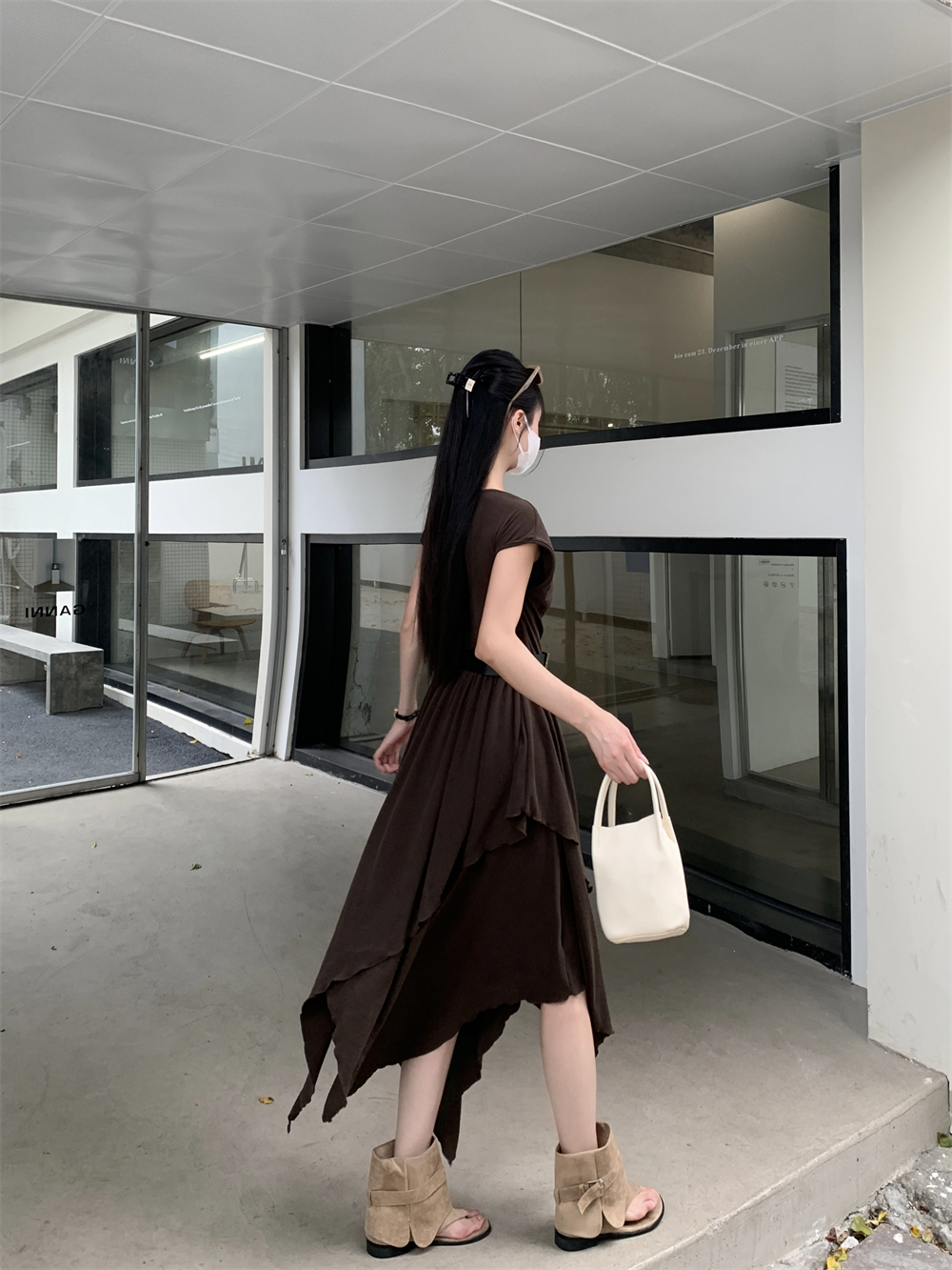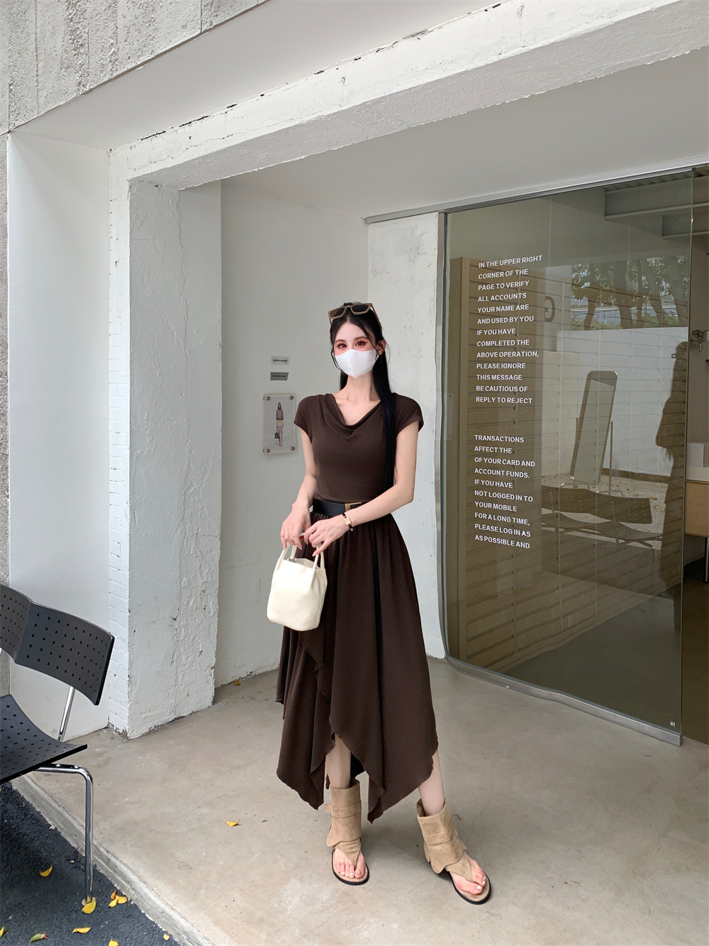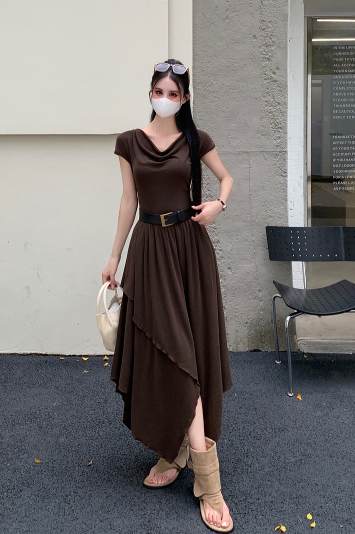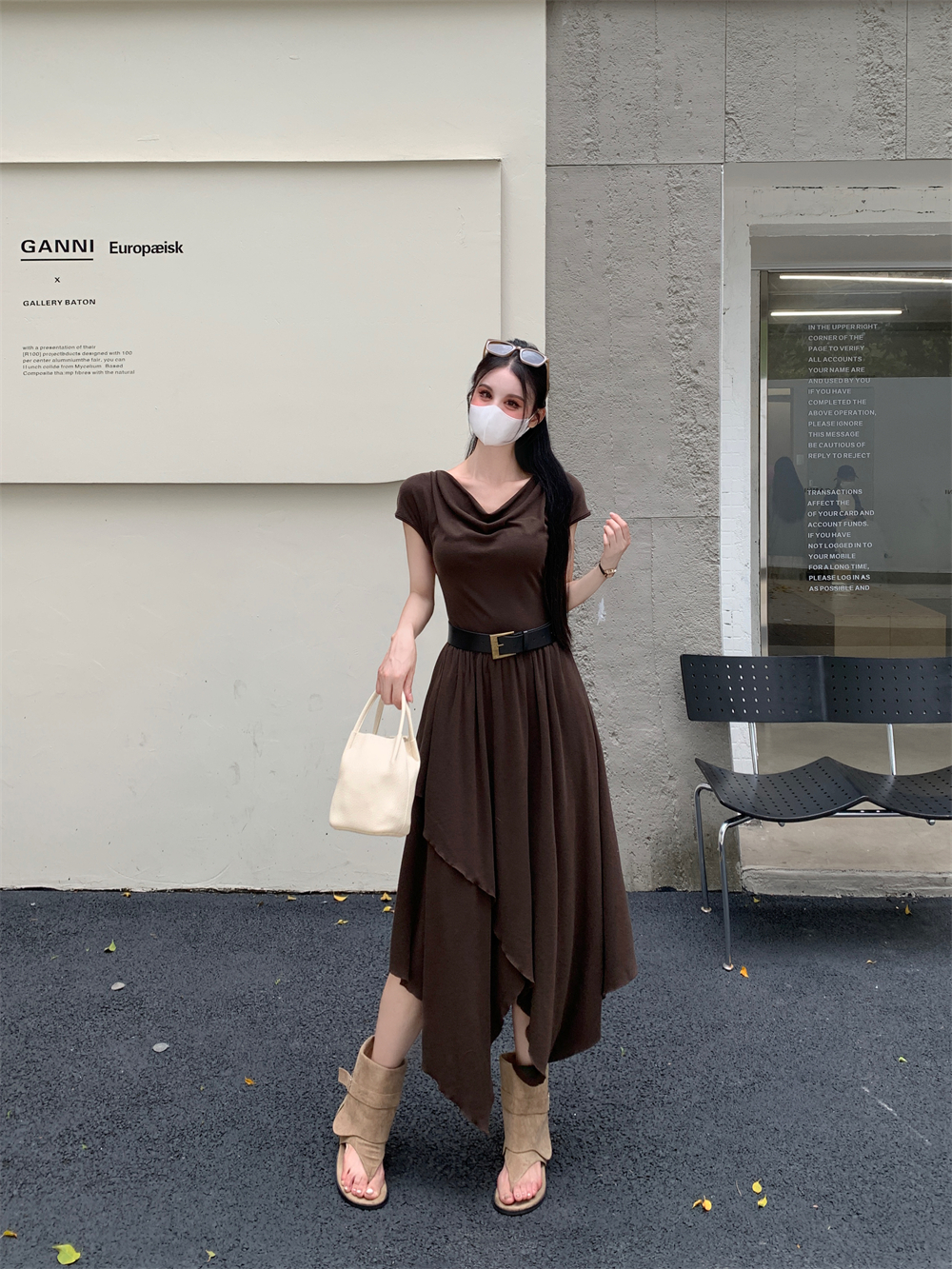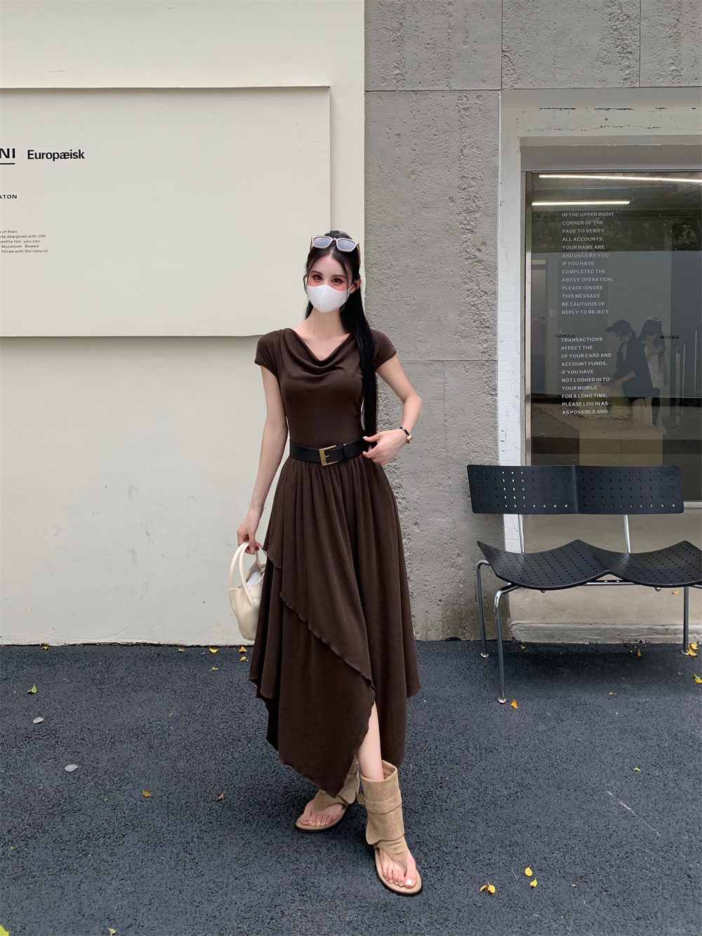 RY3928# 实拍夏季新款不规则垂感荡领遮肉显瘦收腰大码连衣裙女气质长裙