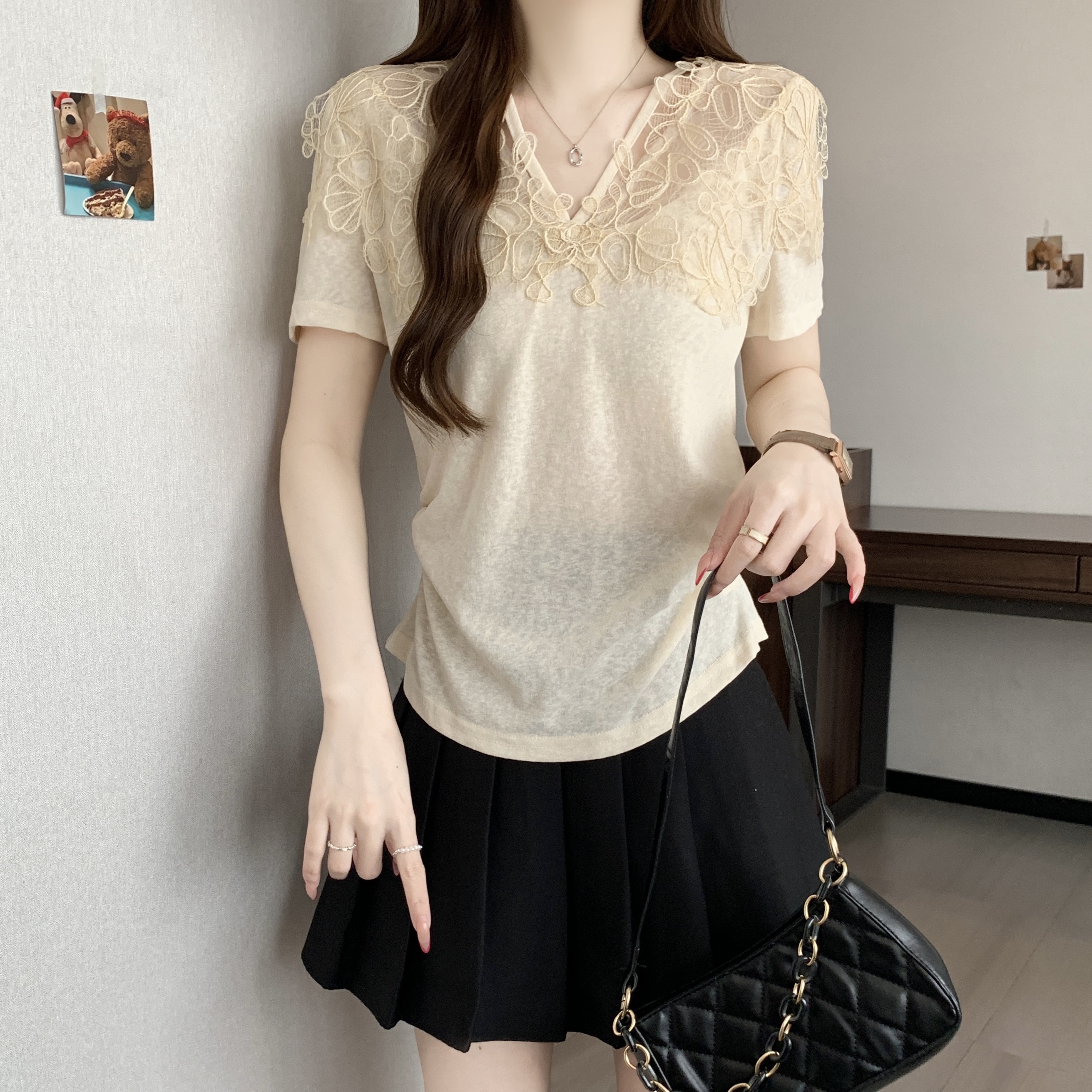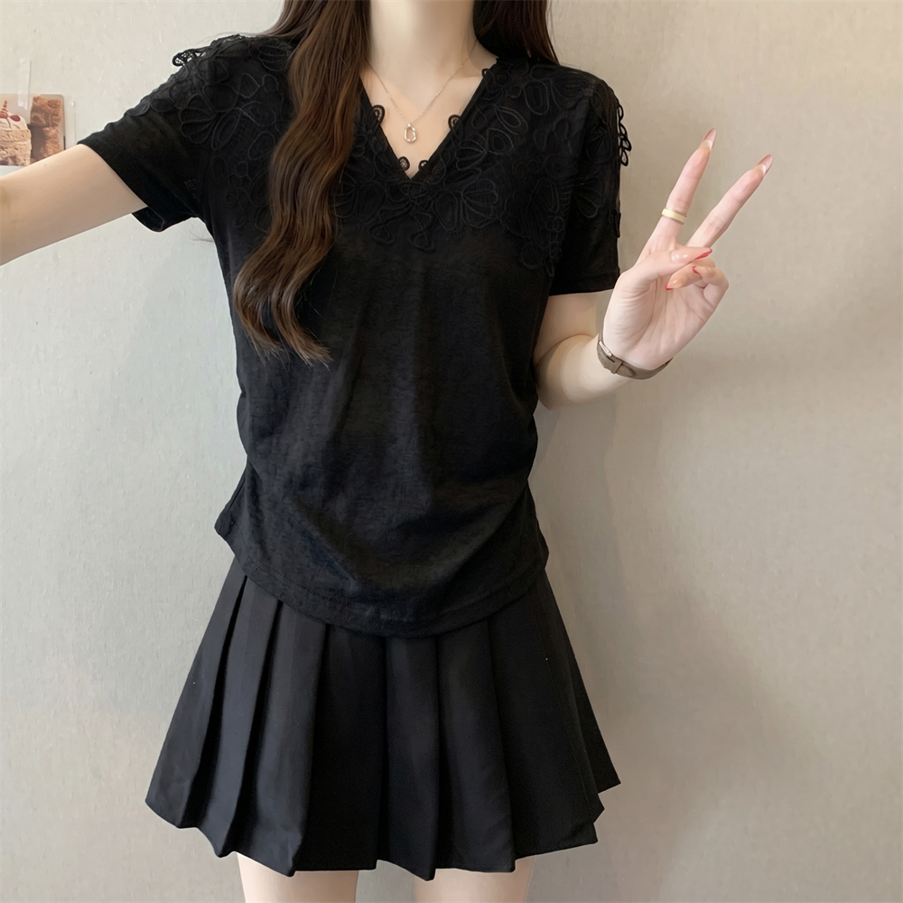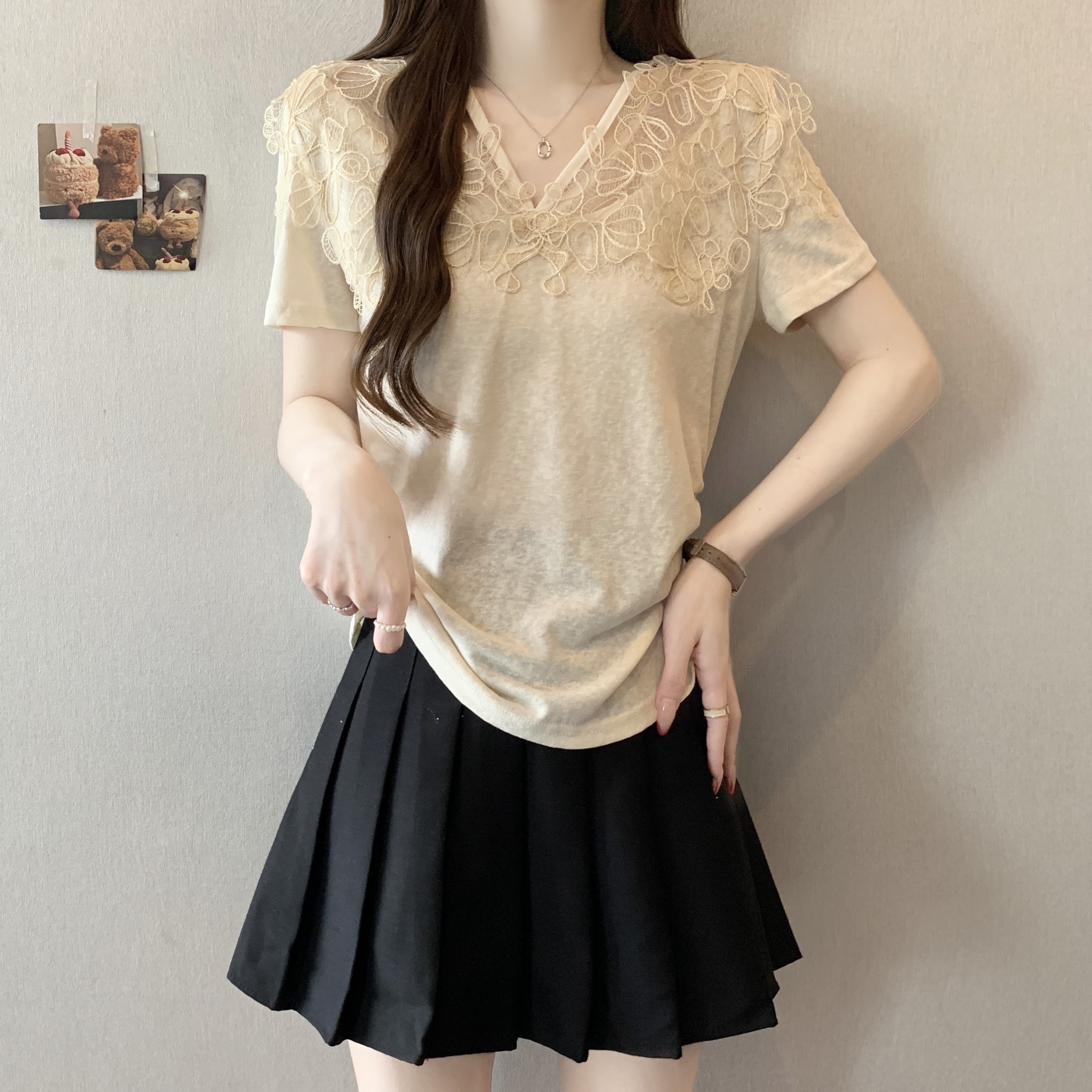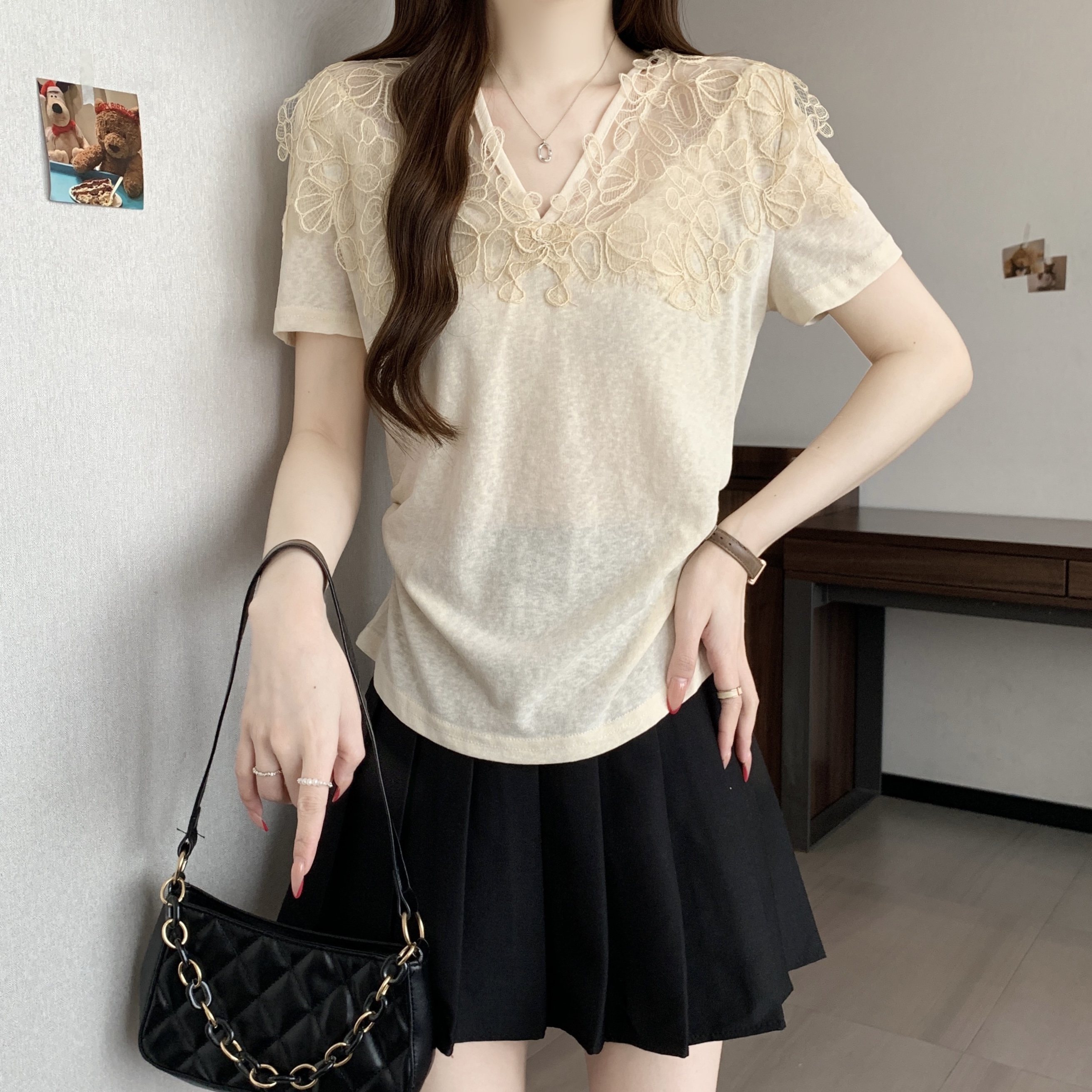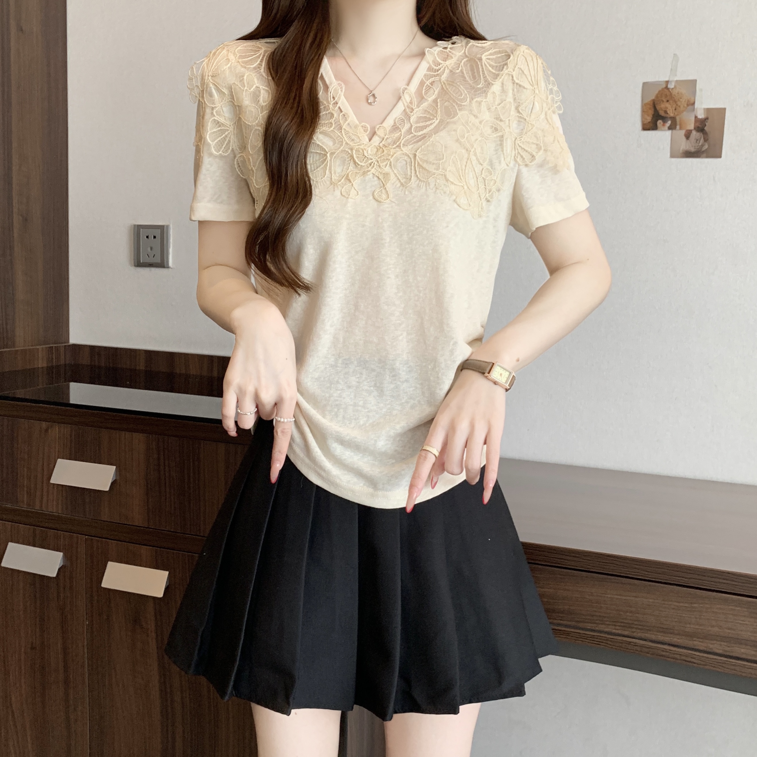 RY3929# 实拍夏季新款法式气质钩花蕾丝拼接v领短袖大码显瘦百搭上衣小衫