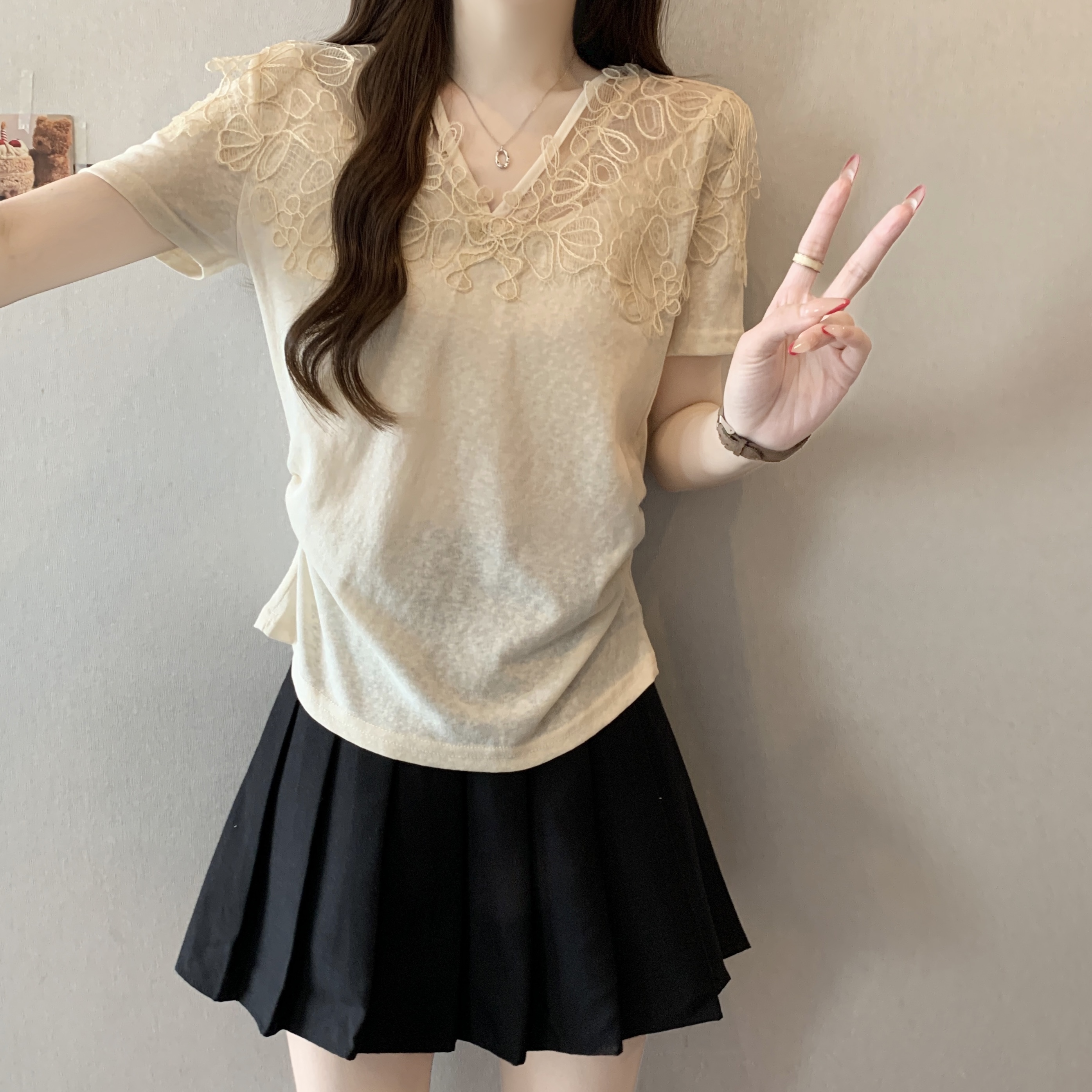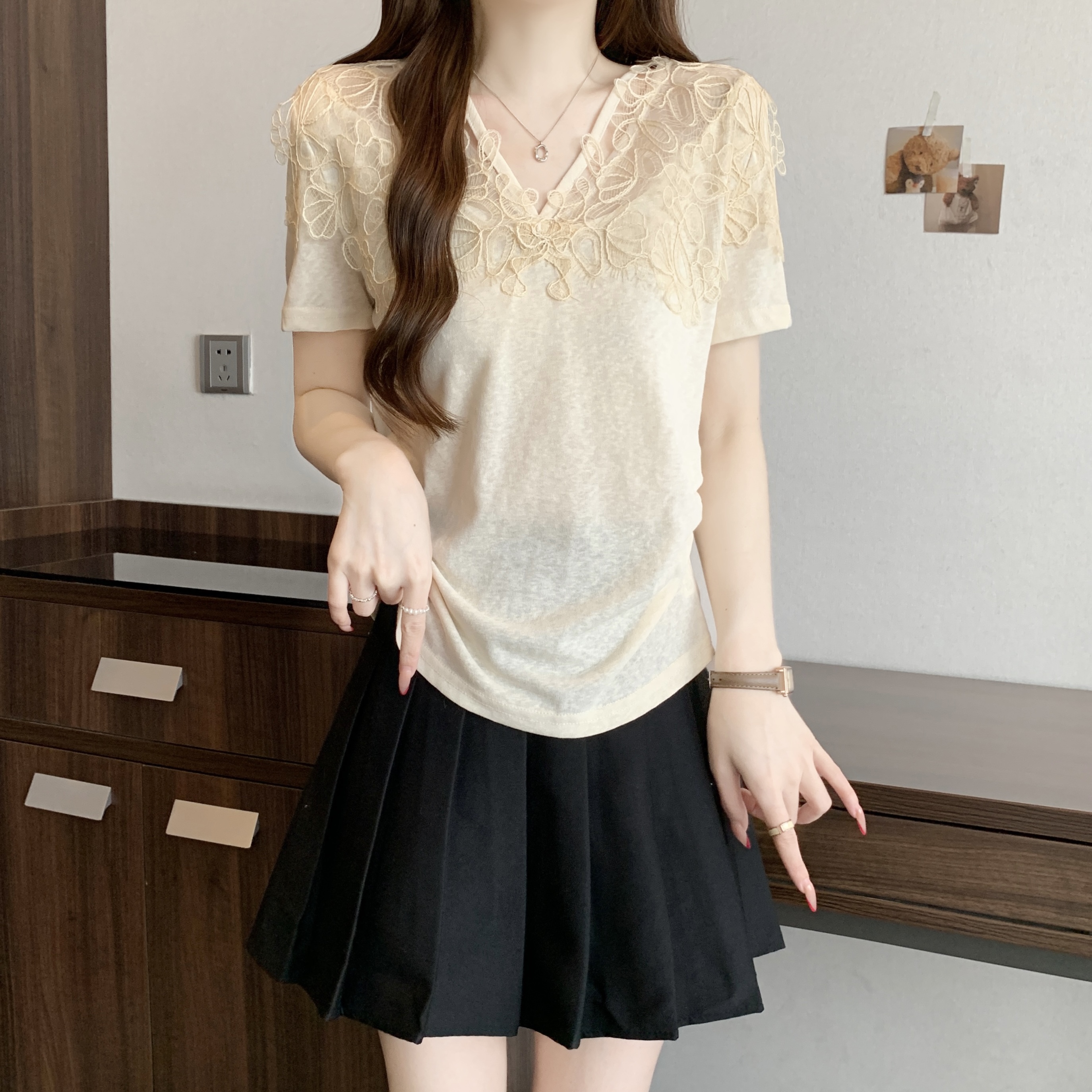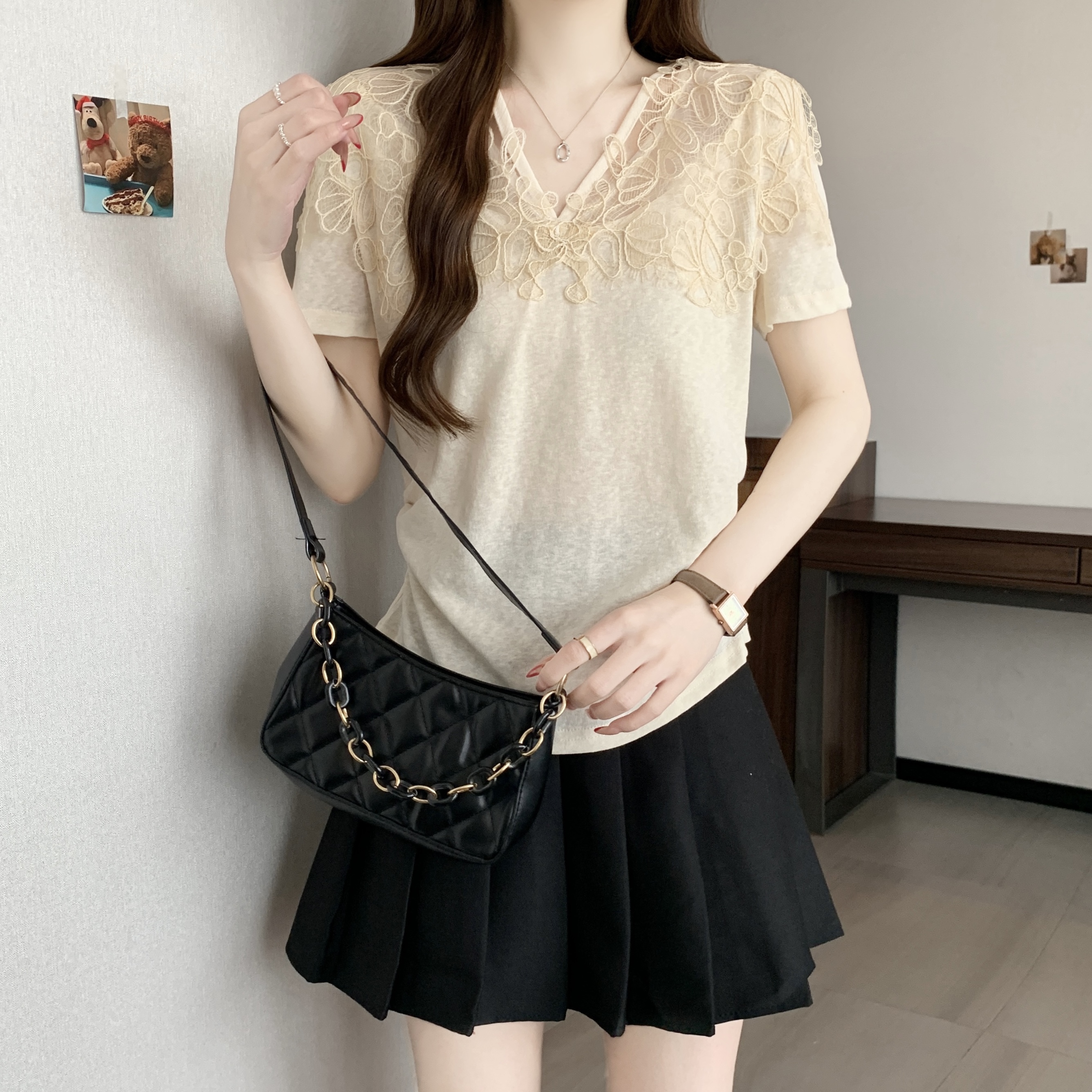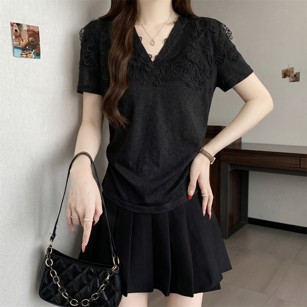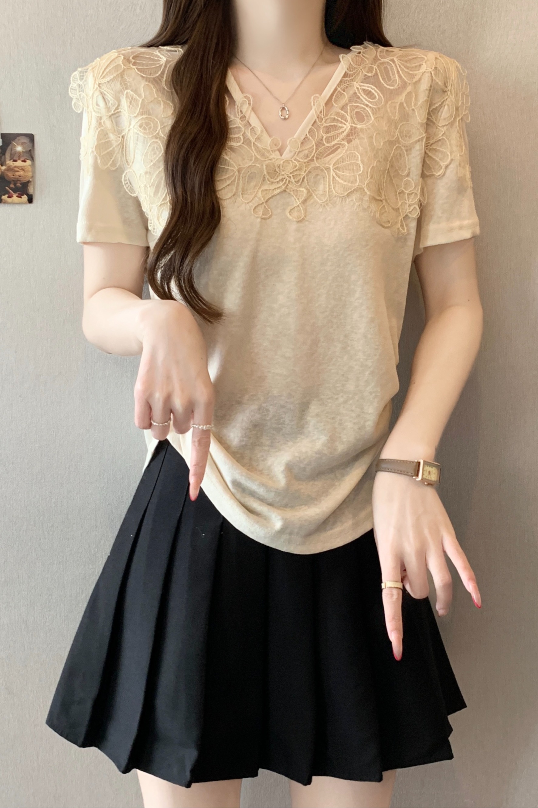 RY3929# 实拍夏季新款法式气质钩花蕾丝拼接v领短袖大码显瘦百搭上衣小衫