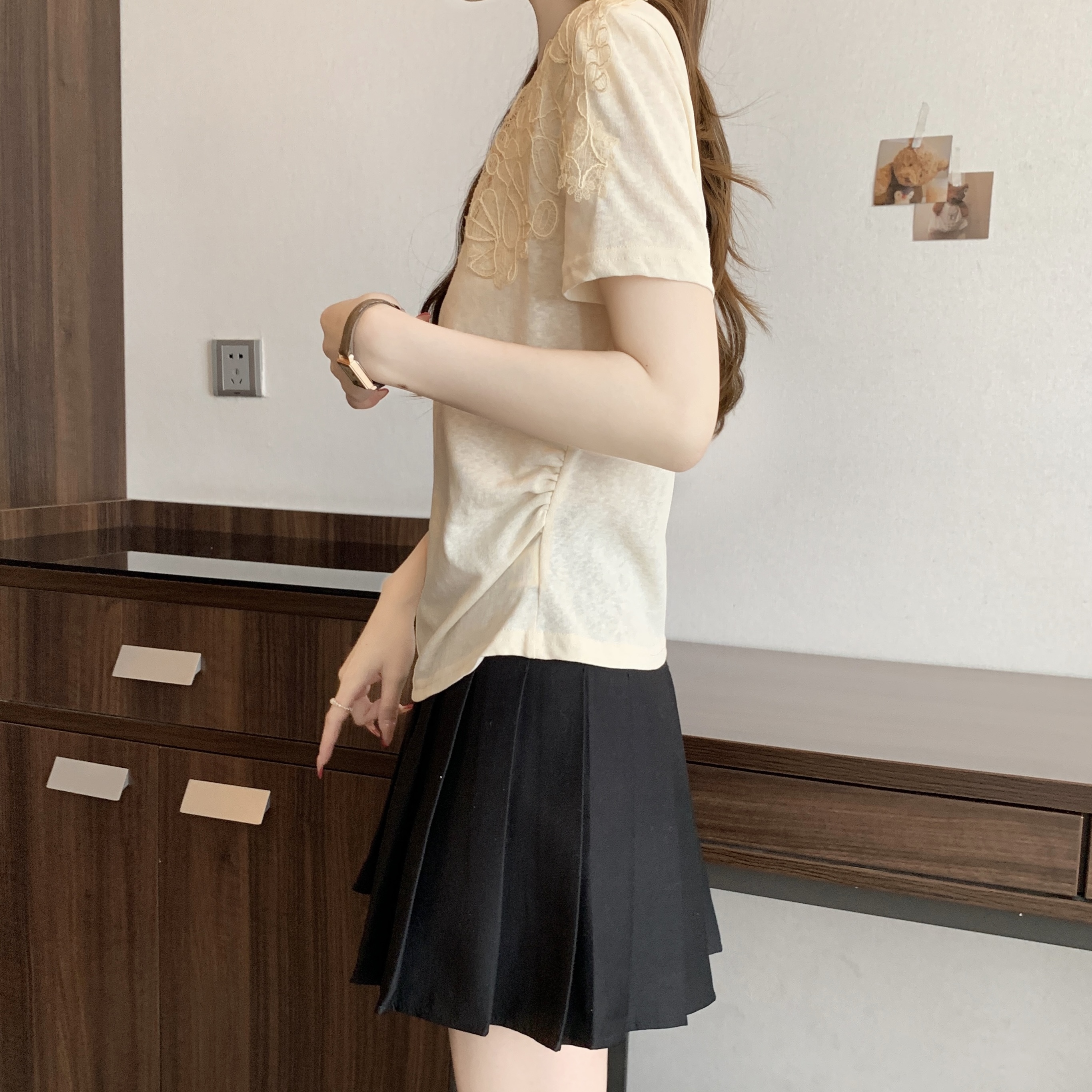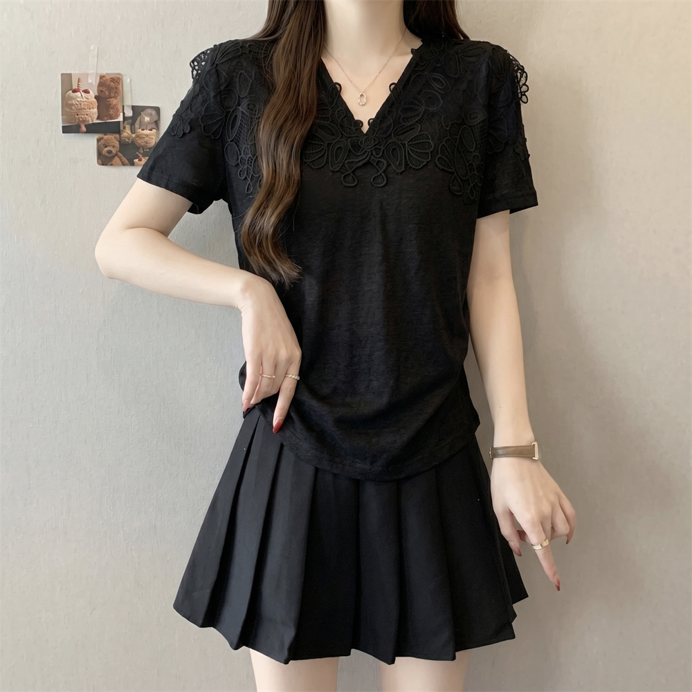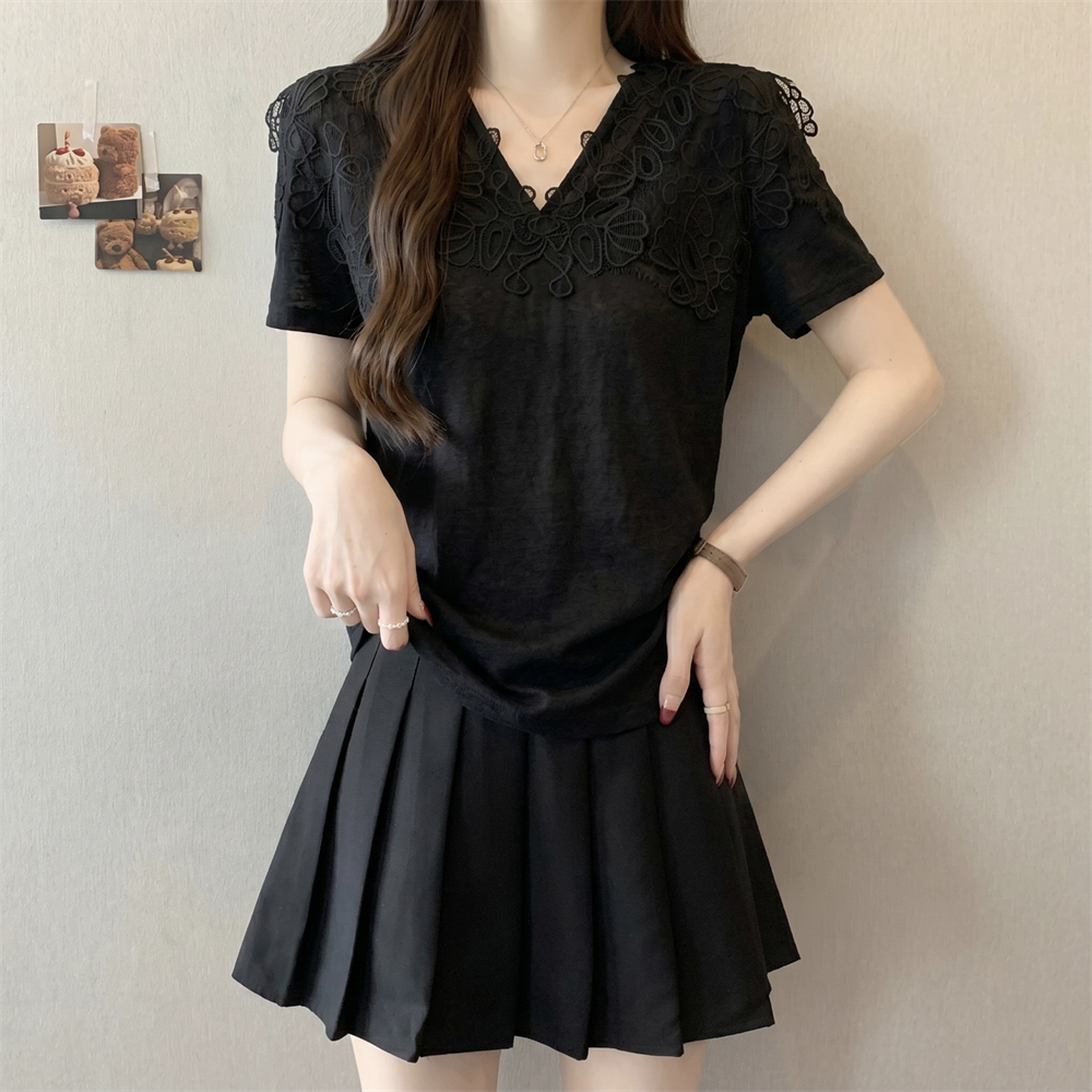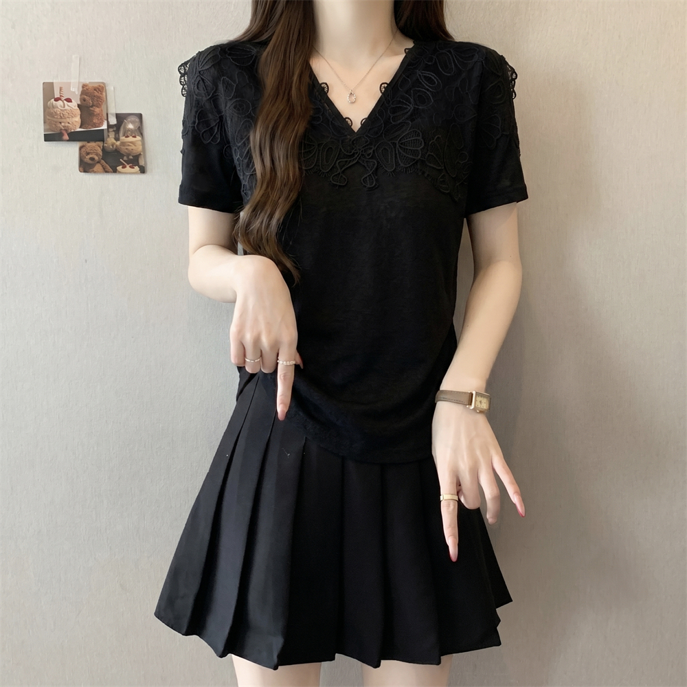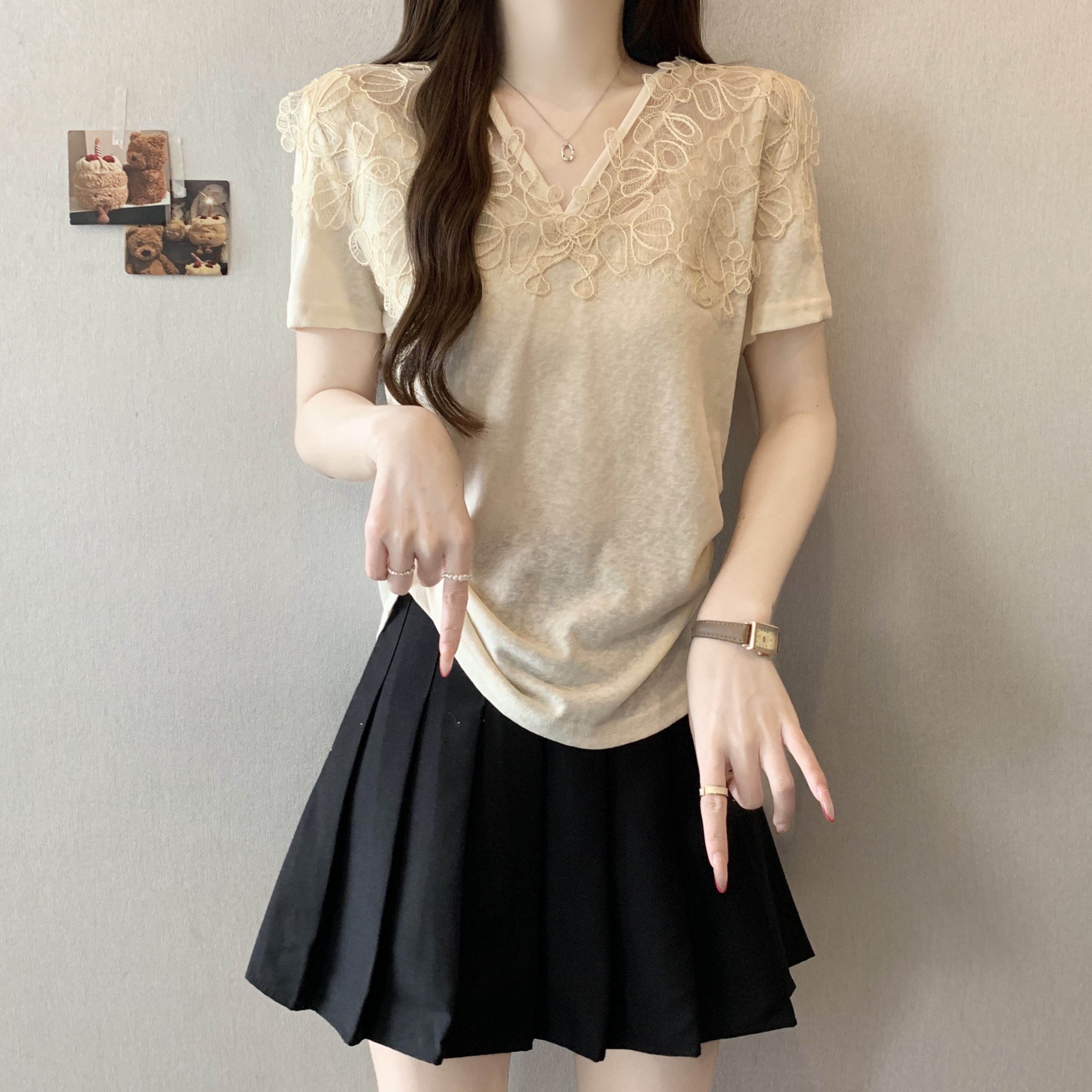 RY3929# 实拍夏季新款法式气质钩花蕾丝拼接v领短袖大码显瘦百搭上衣小衫
