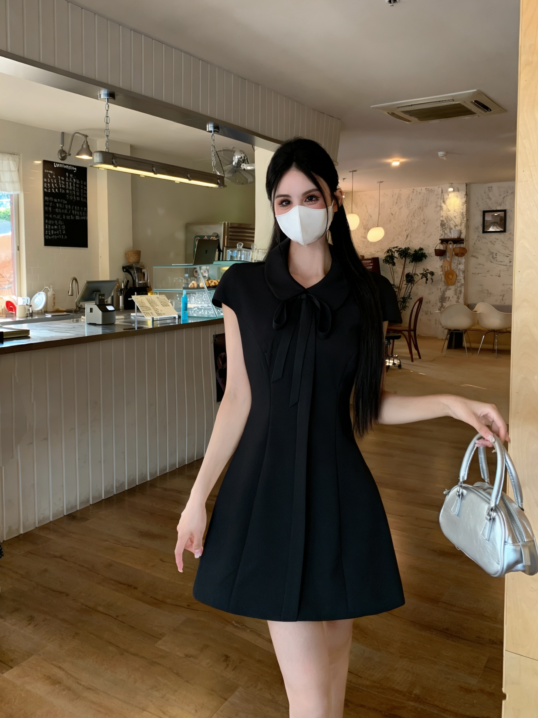 RY3930# 实拍千金感短袖蝴蝶结绑带收腰显瘦大码连衣裙女高级气质A字短裙