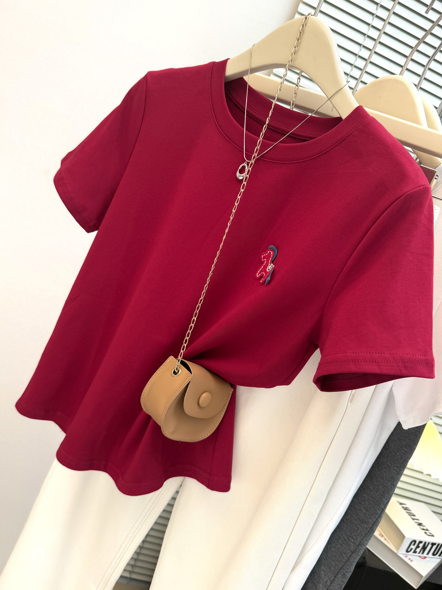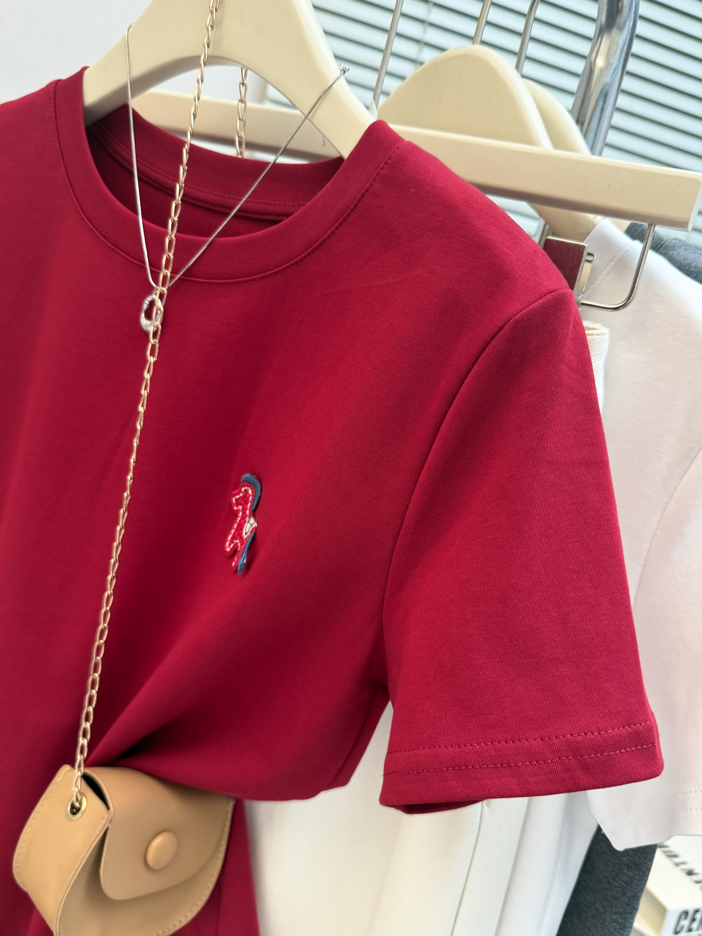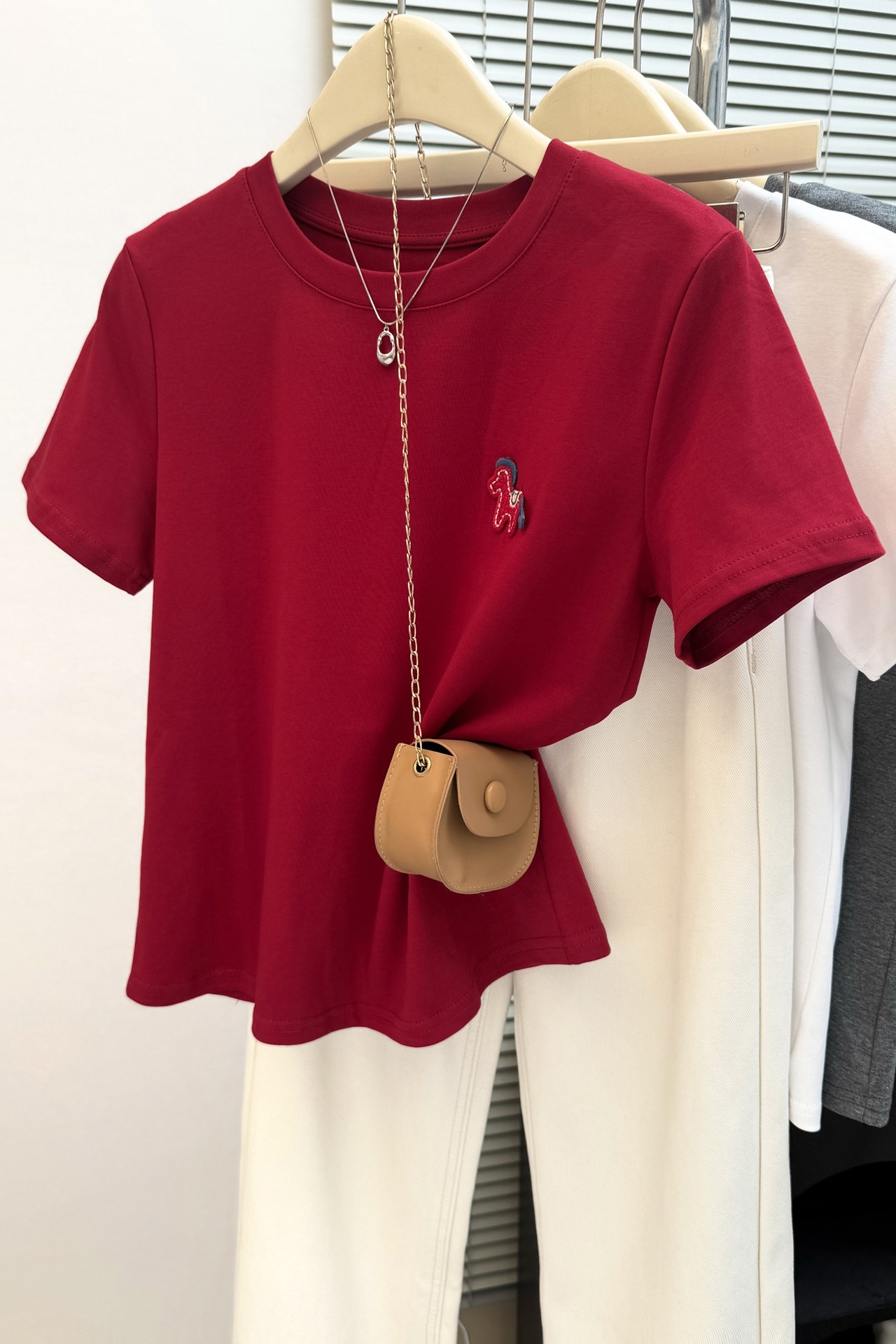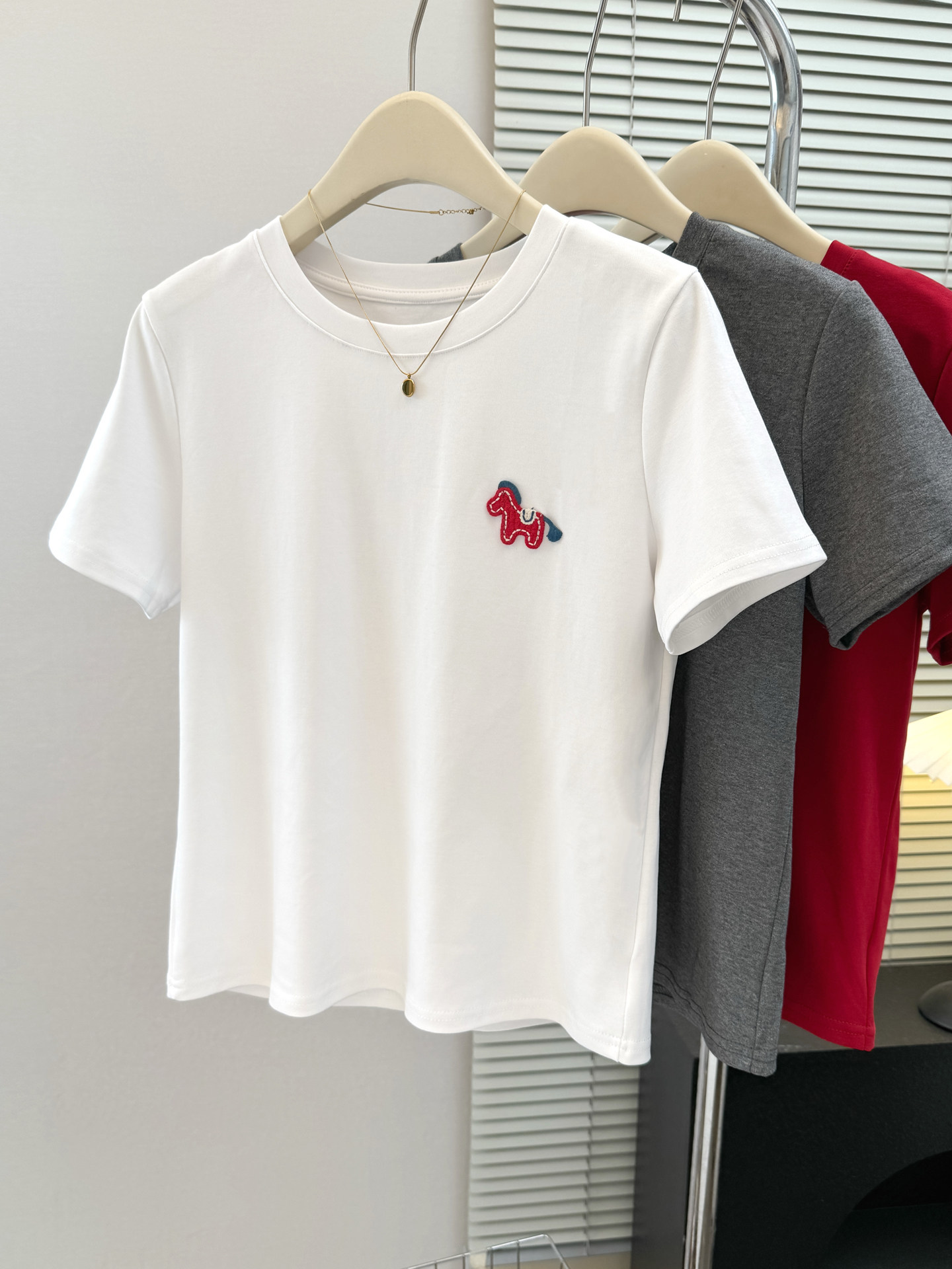 RY3948# 实拍 韩国红色小马贴布磨毛圆领短袖T恤女2026新款百搭休闲打底衫
