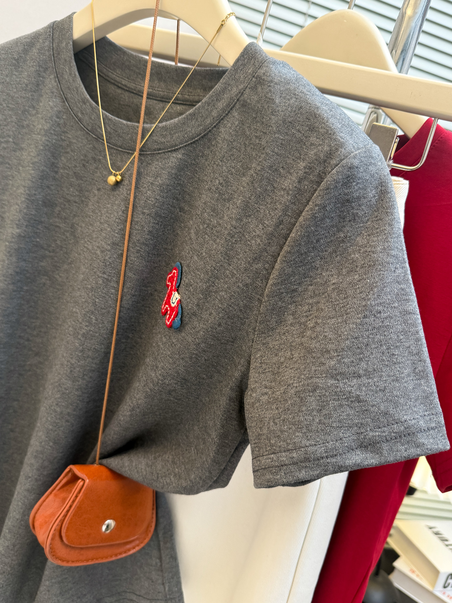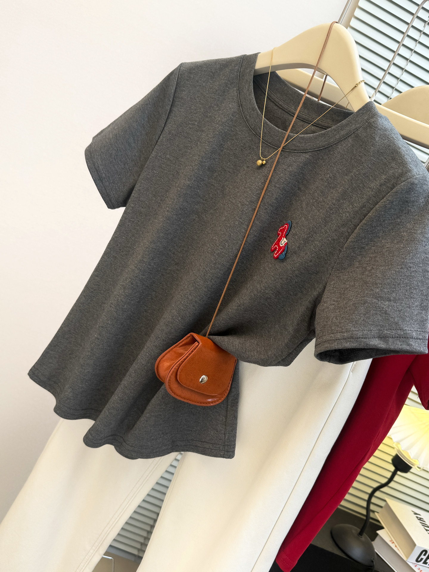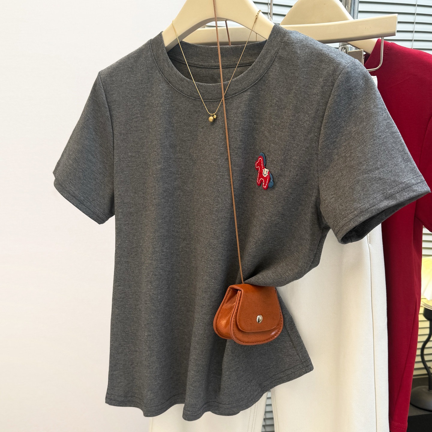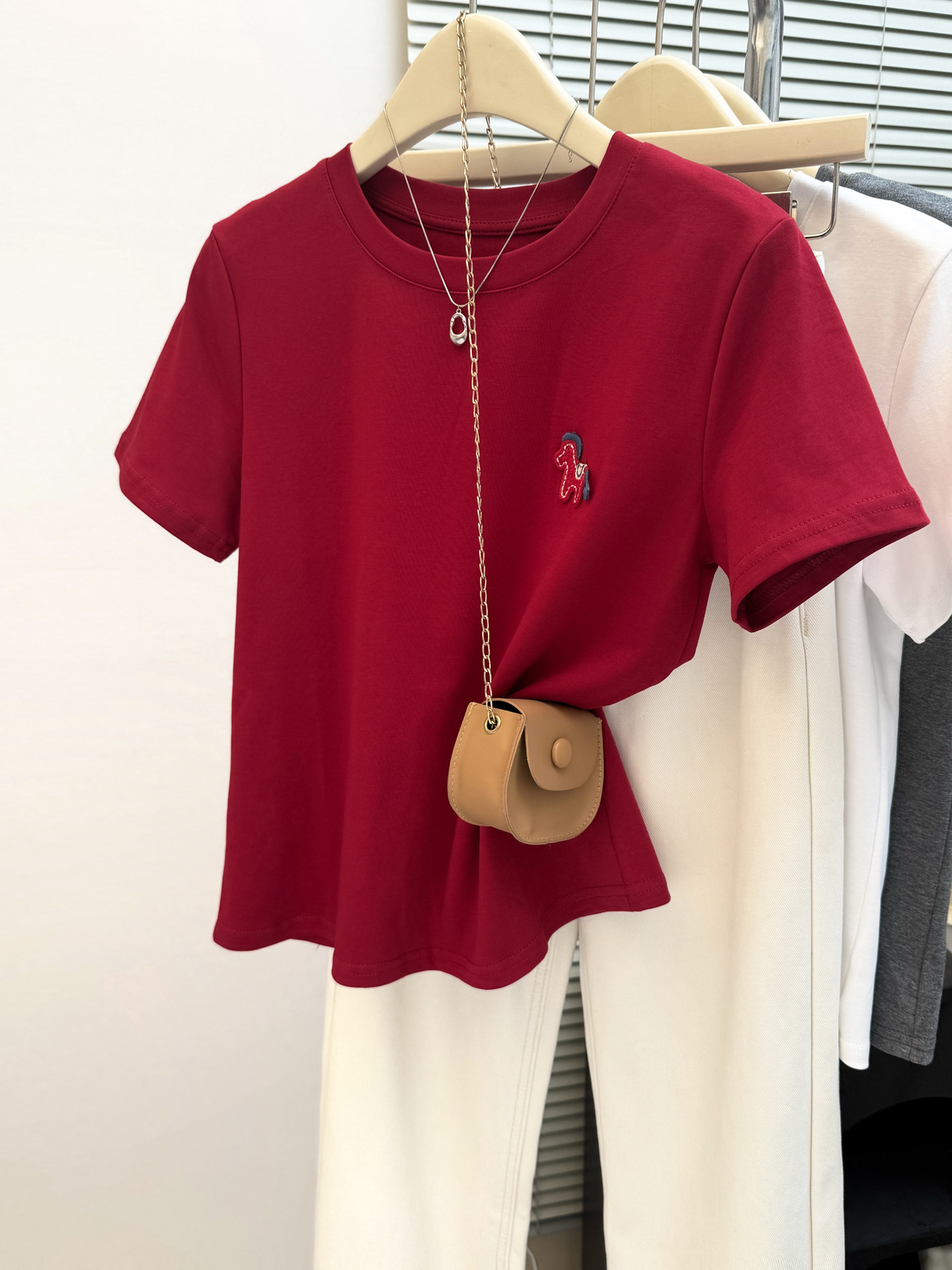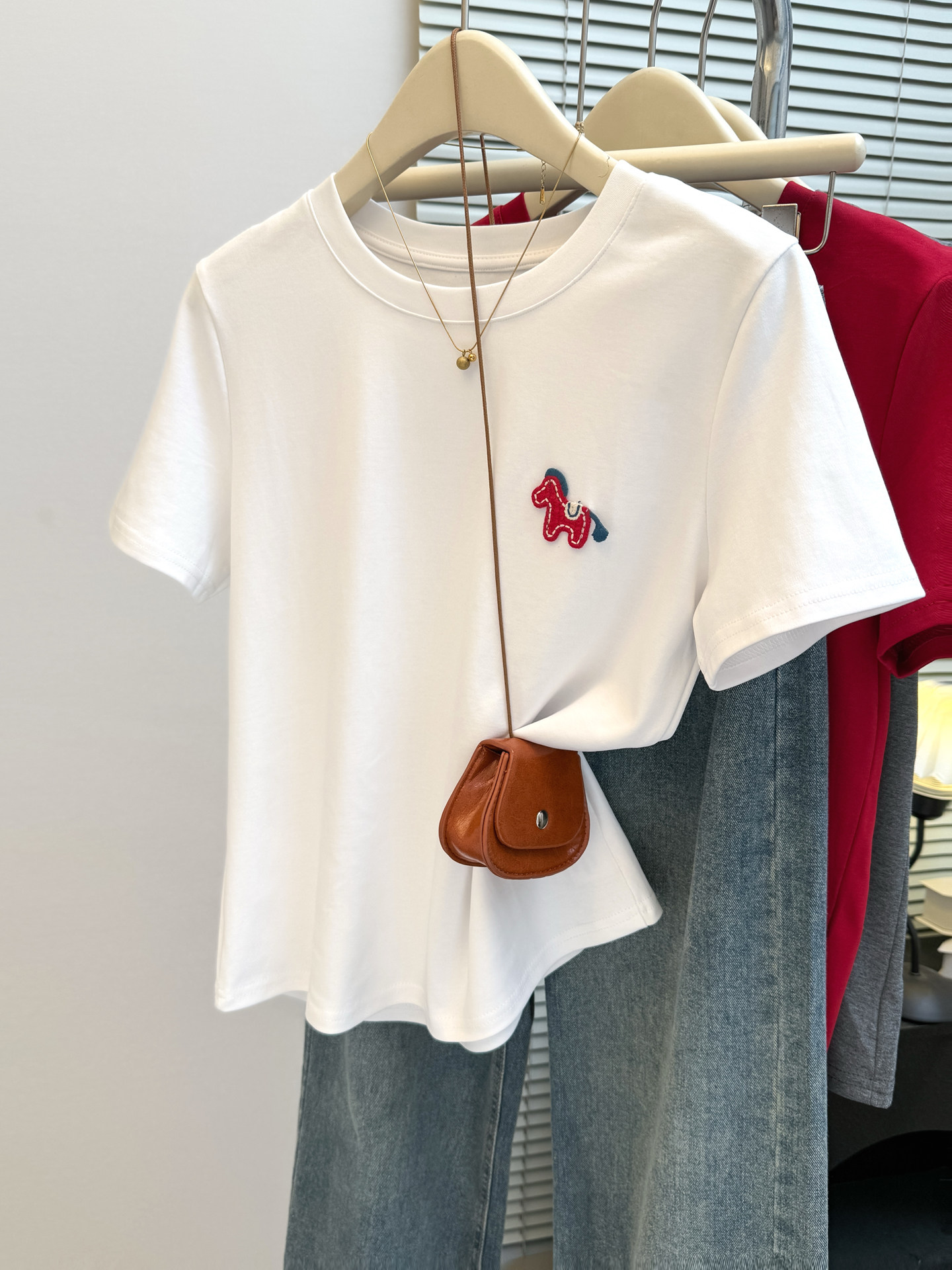 RY3948# 实拍 韩国红色小马贴布磨毛圆领短袖T恤女2026新款百搭休闲打底衫