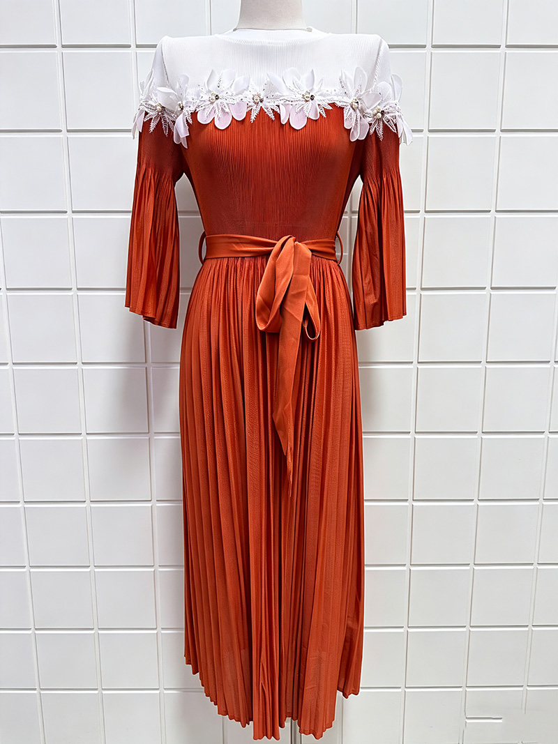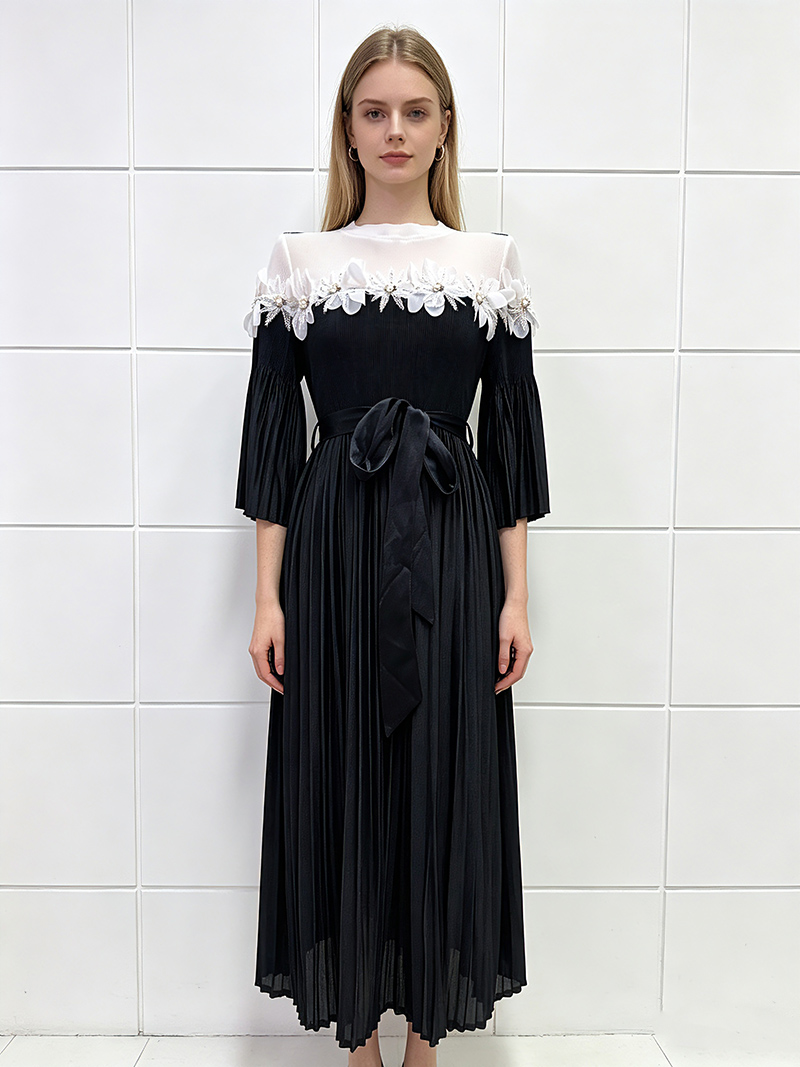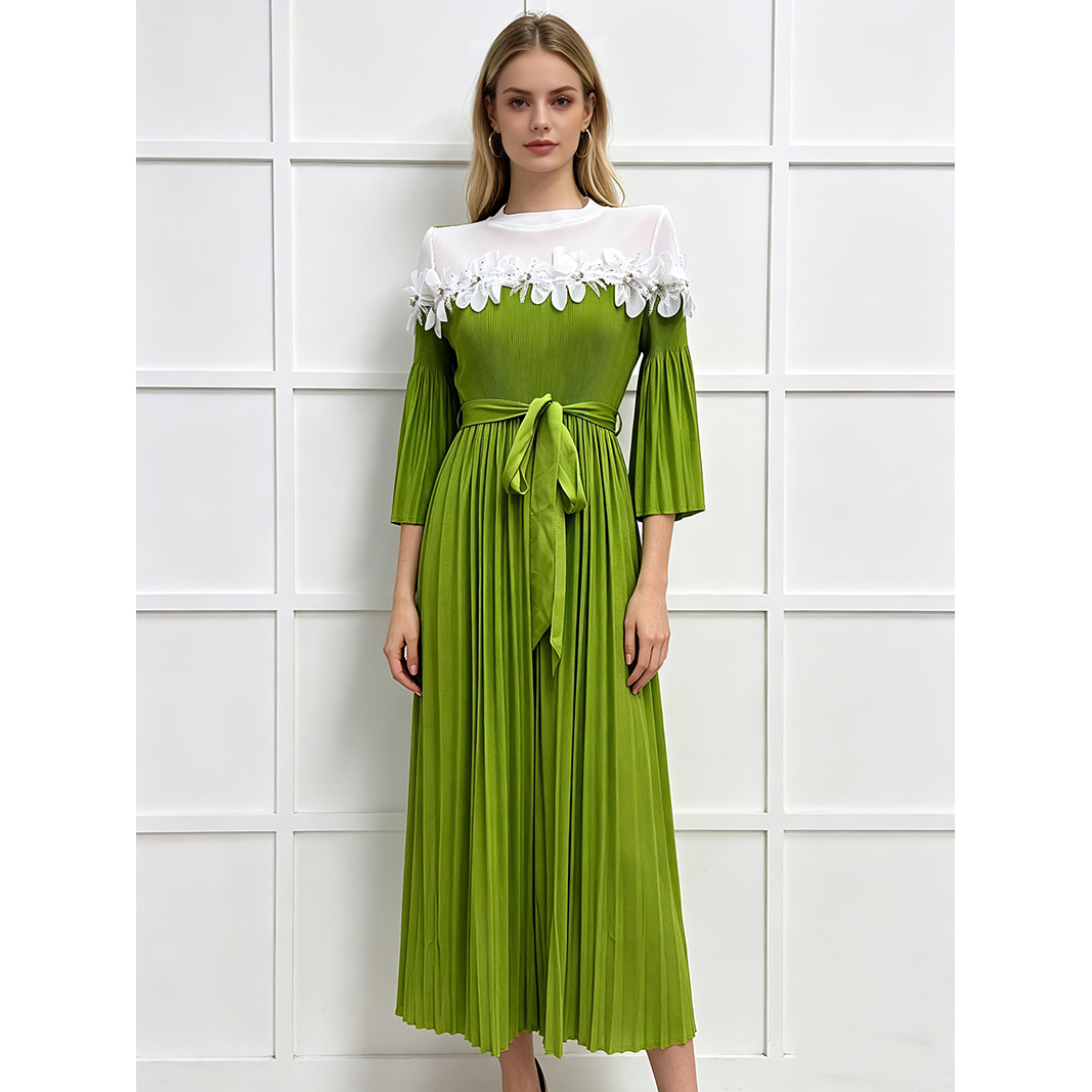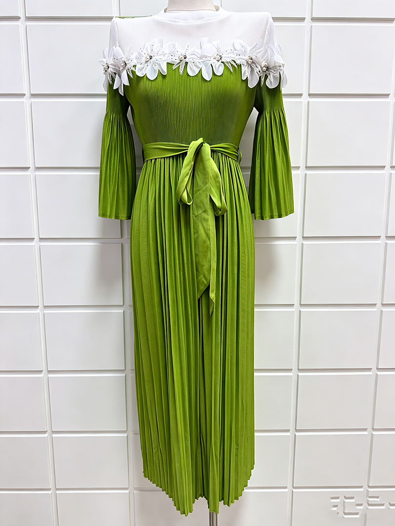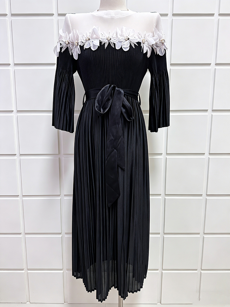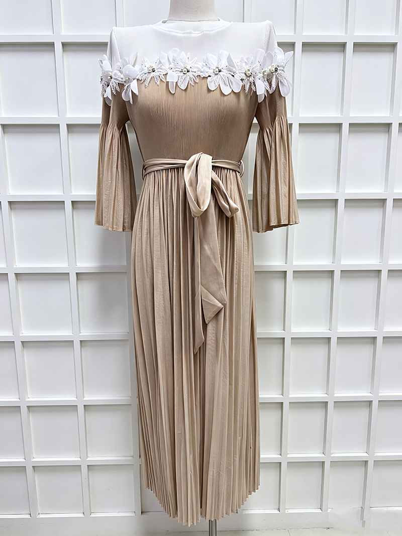 RY3952# 三宅喇叭袖蕾丝拼接褶皱外贸钉珠时尚盘花宽松显瘦优雅百褶裙mm装