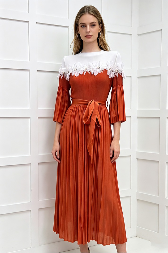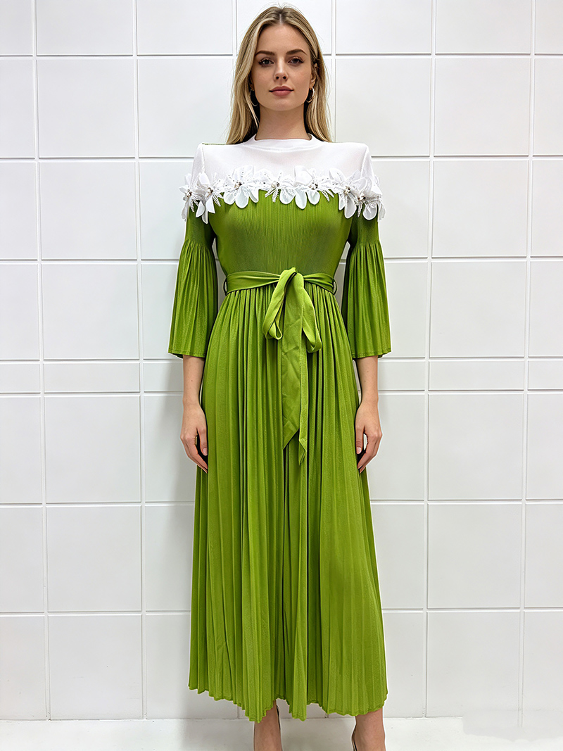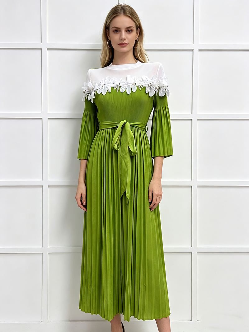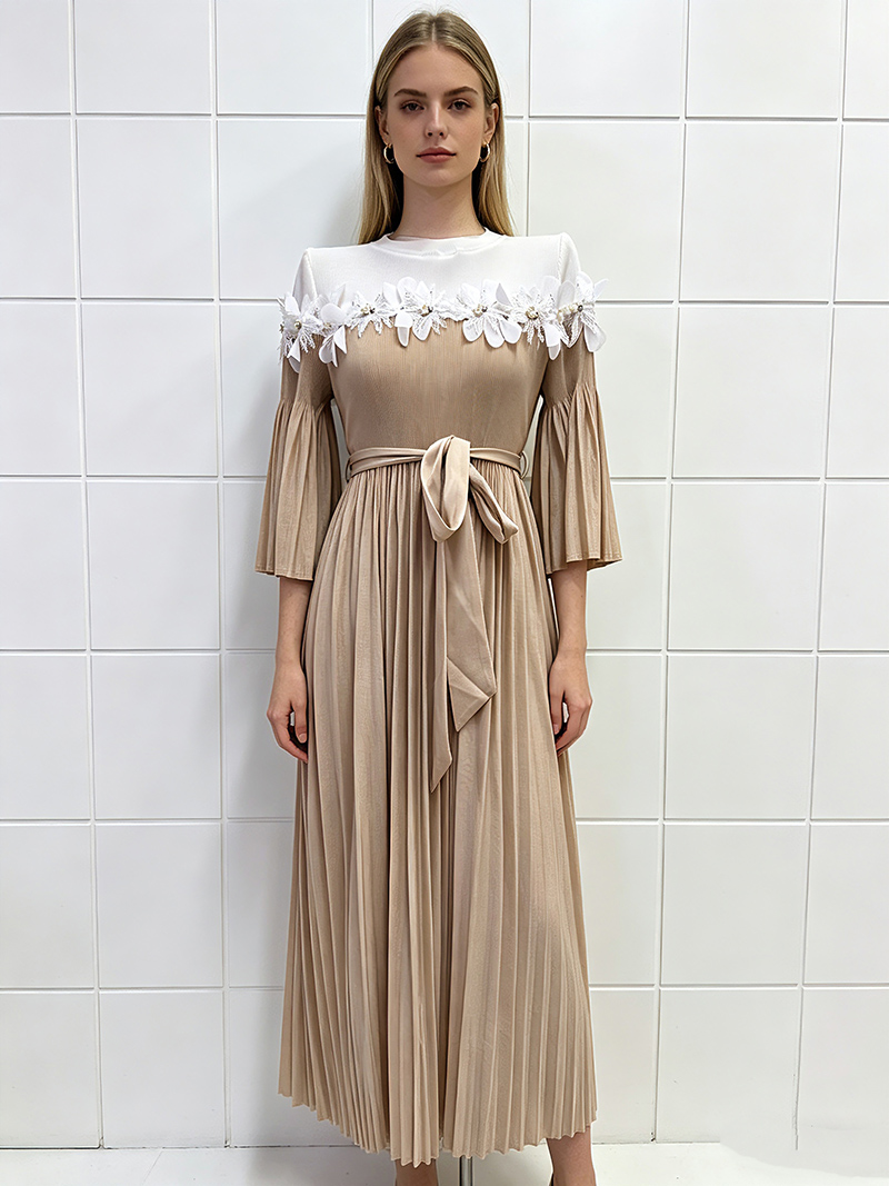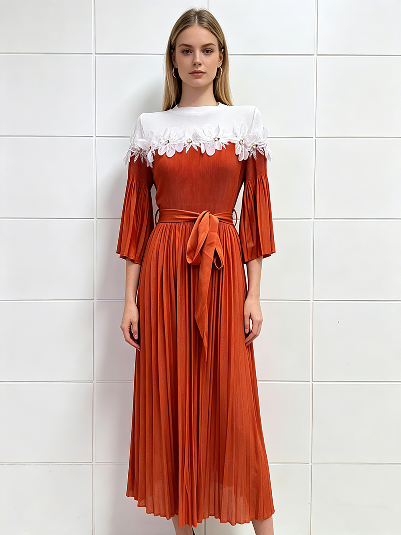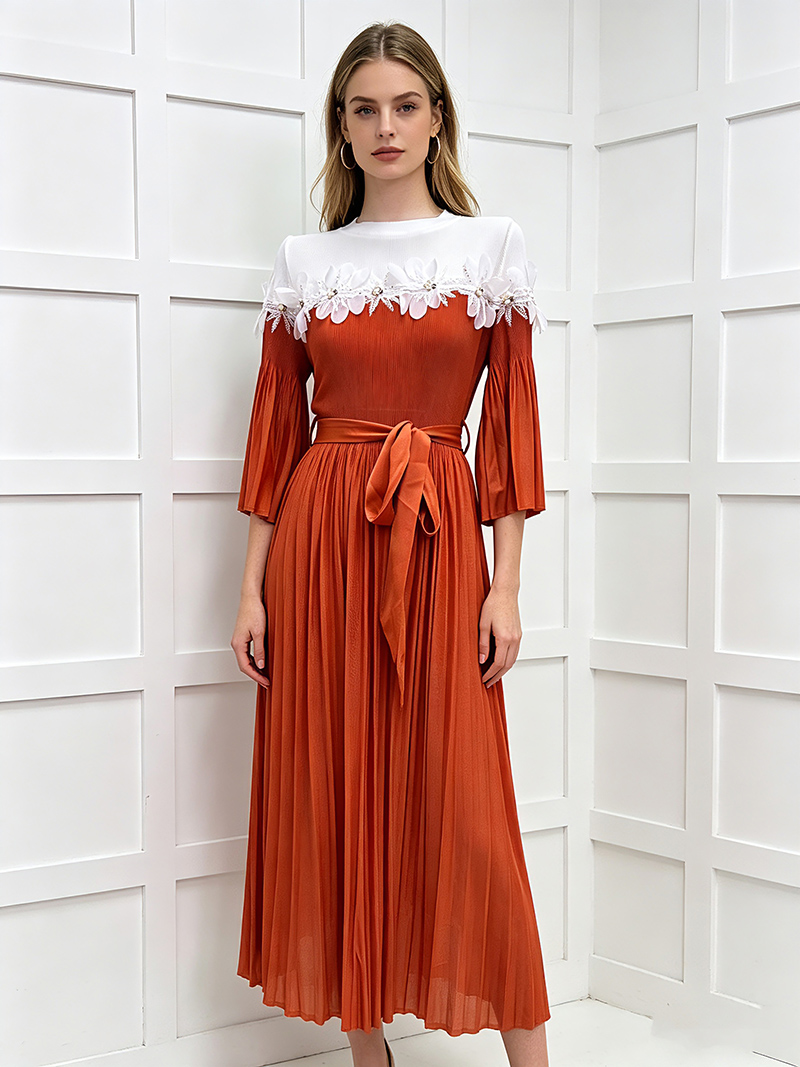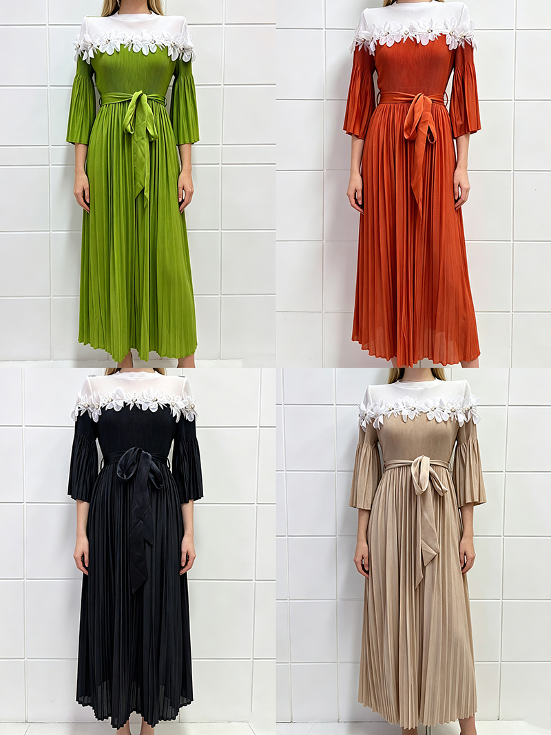 RY3952# 三宅喇叭袖蕾丝拼接褶皱外贸钉珠时尚盘花宽松显瘦优雅百褶裙mm装