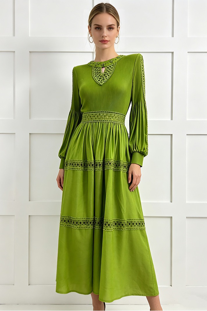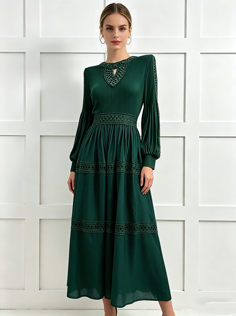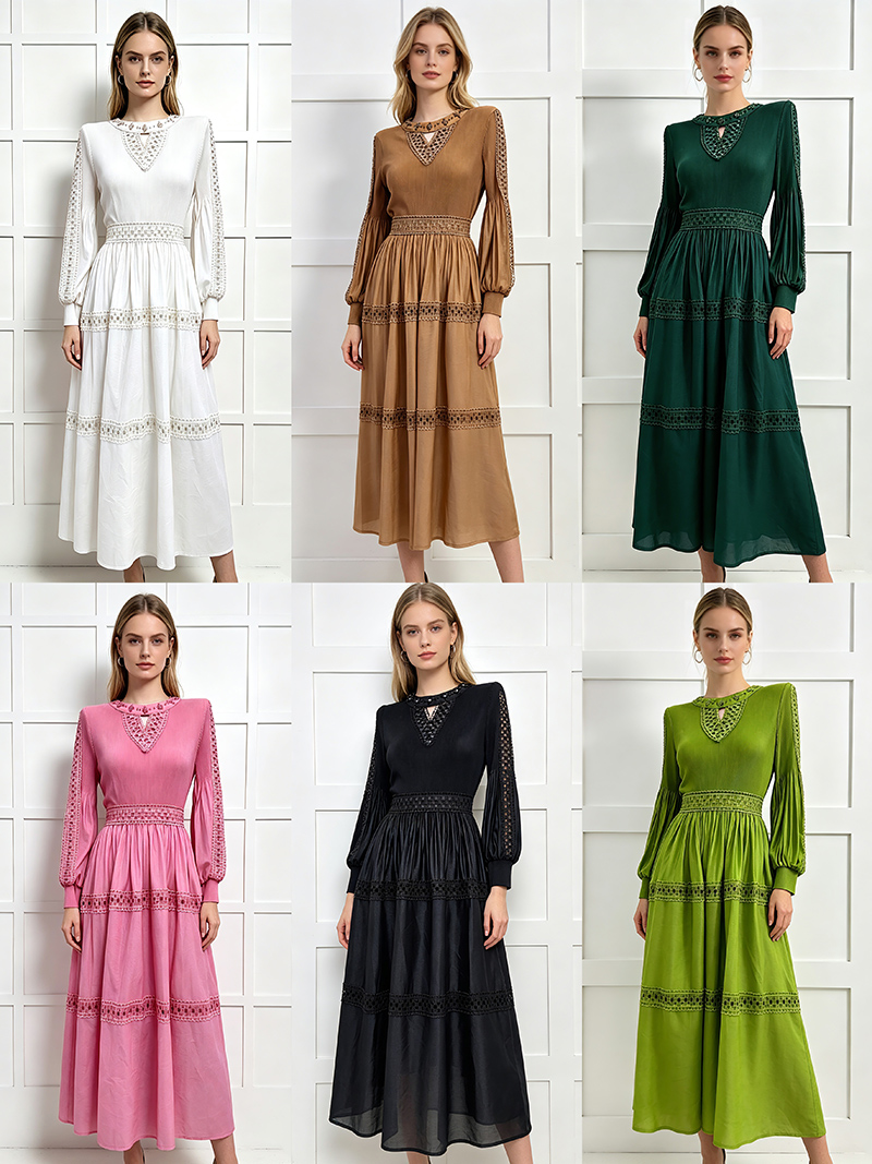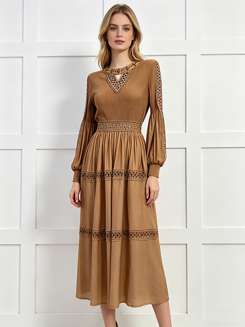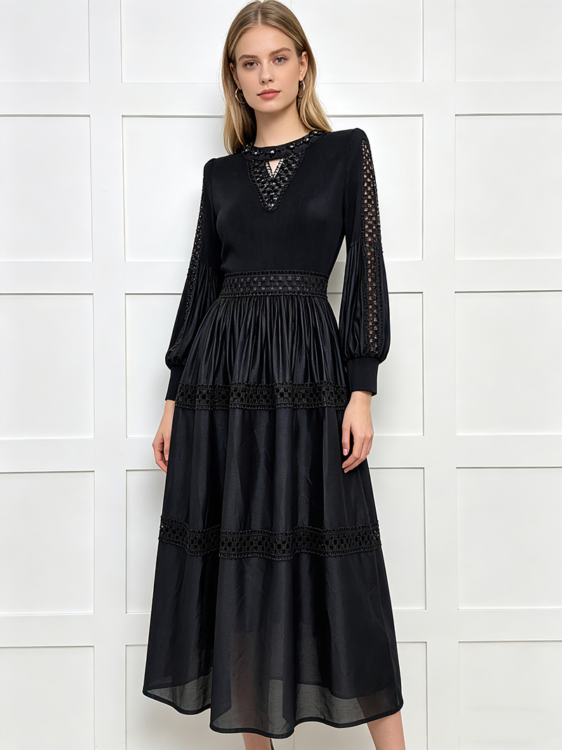 RY3953# 三宅外贸亮片拼接褶皱钉珠灯笼袖连衣裙高腰显瘦宽松长裙大码女装