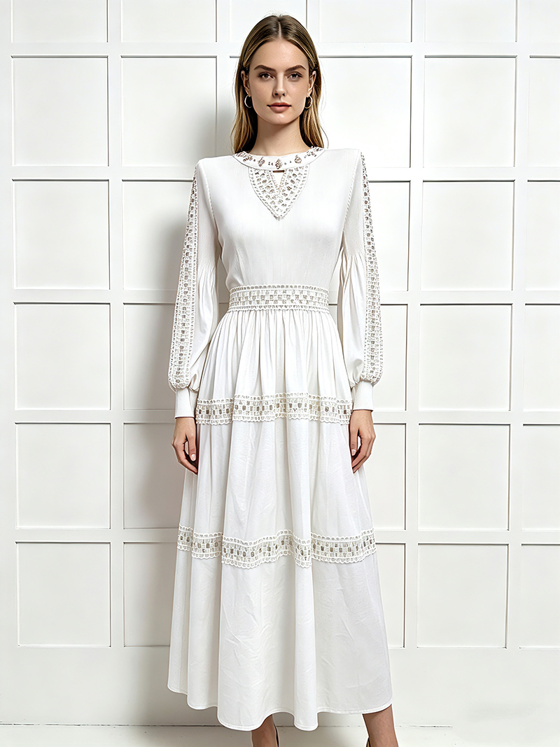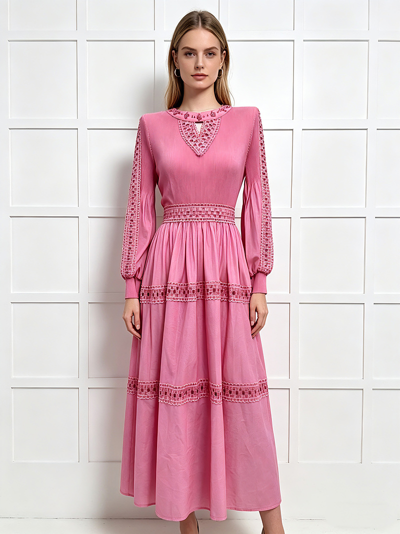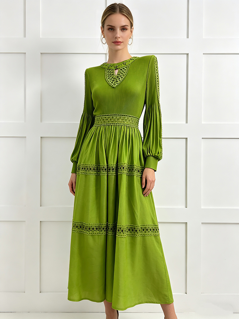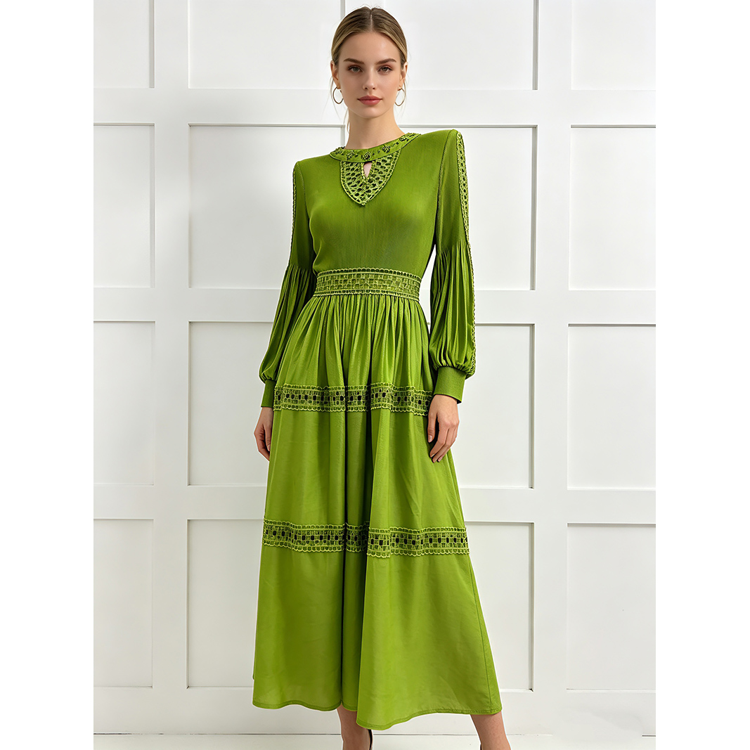 RY3953# 三宅外贸亮片拼接褶皱钉珠灯笼袖连衣裙高腰显瘦宽松长裙大码女装