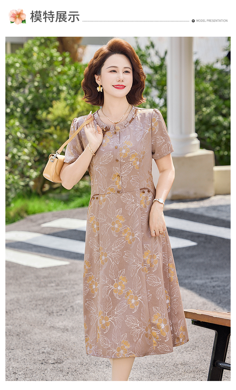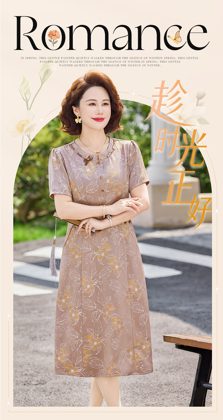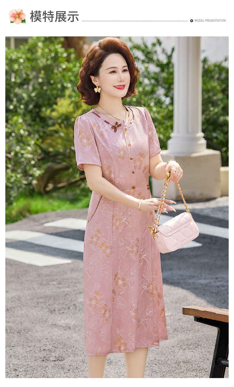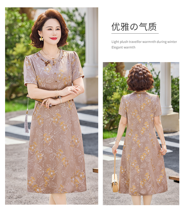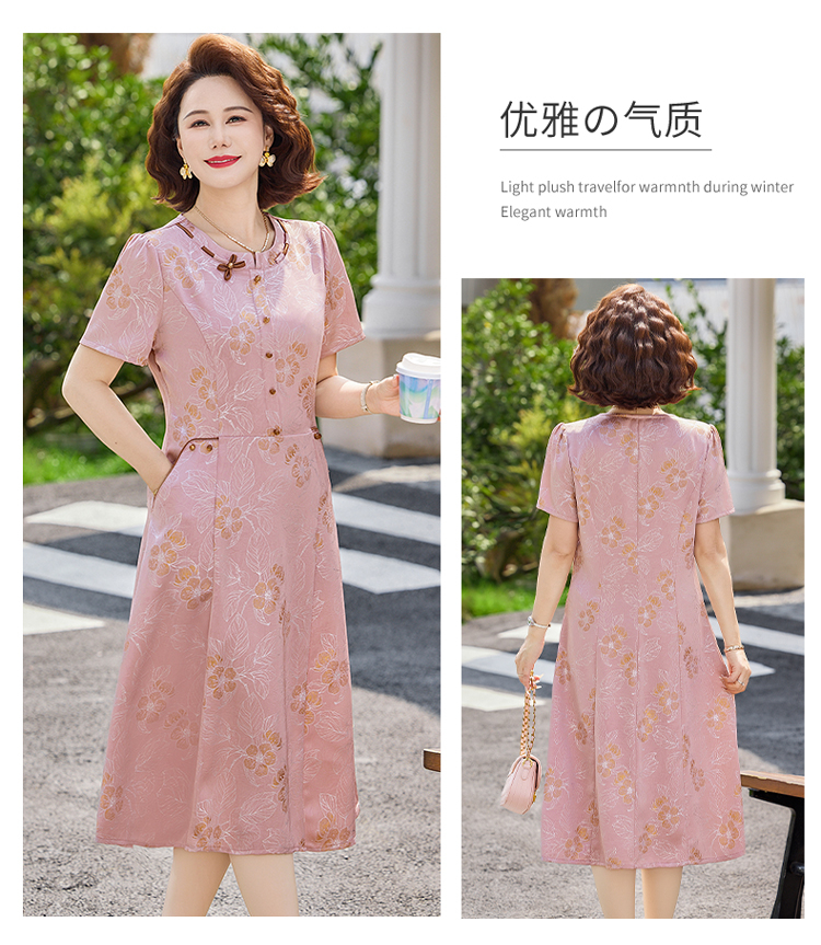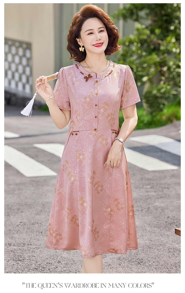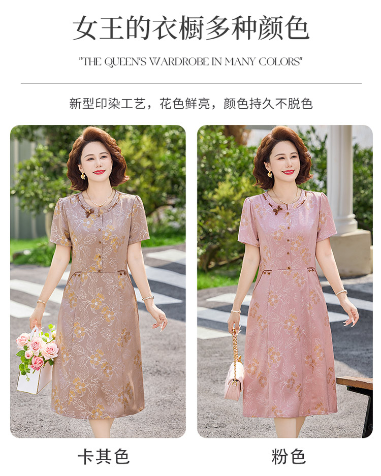 RY3960# 复古国风短袖中长款裙子中老年妈妈装大码显瘦遮肉过膝连衣裙女装
