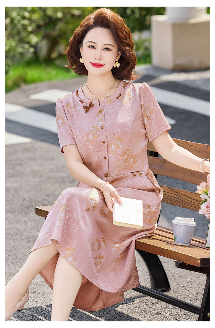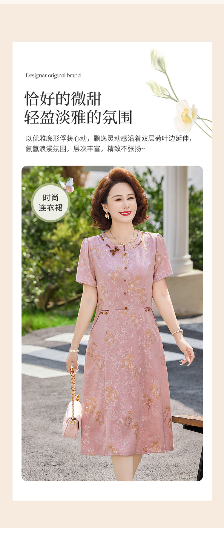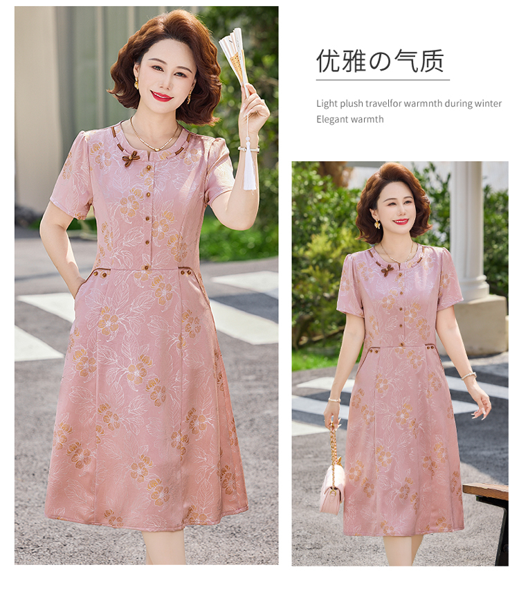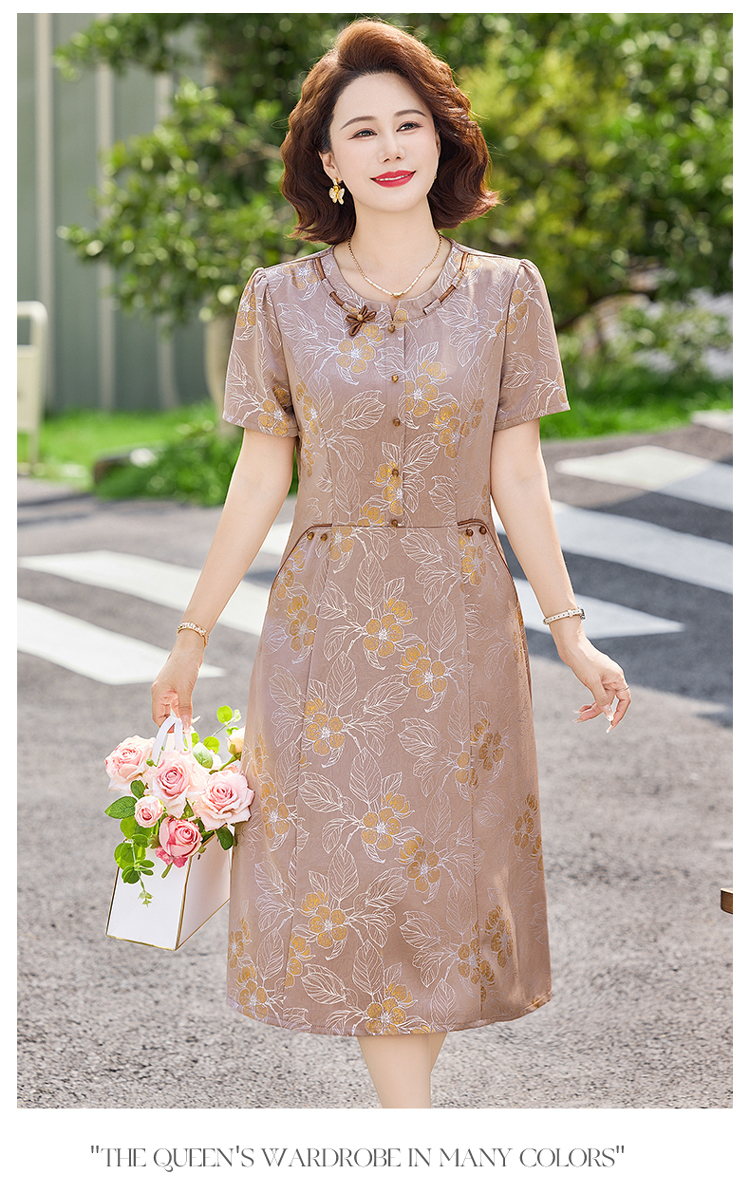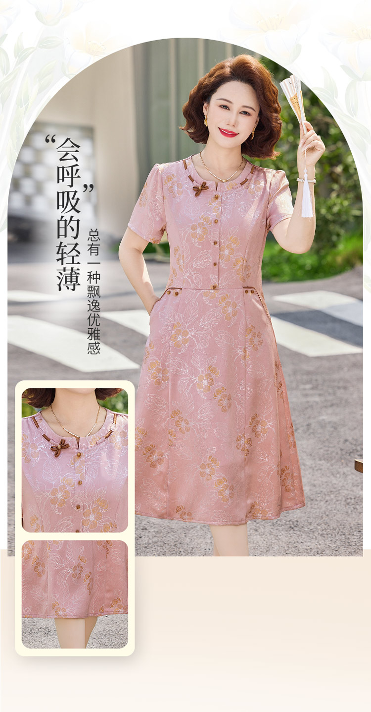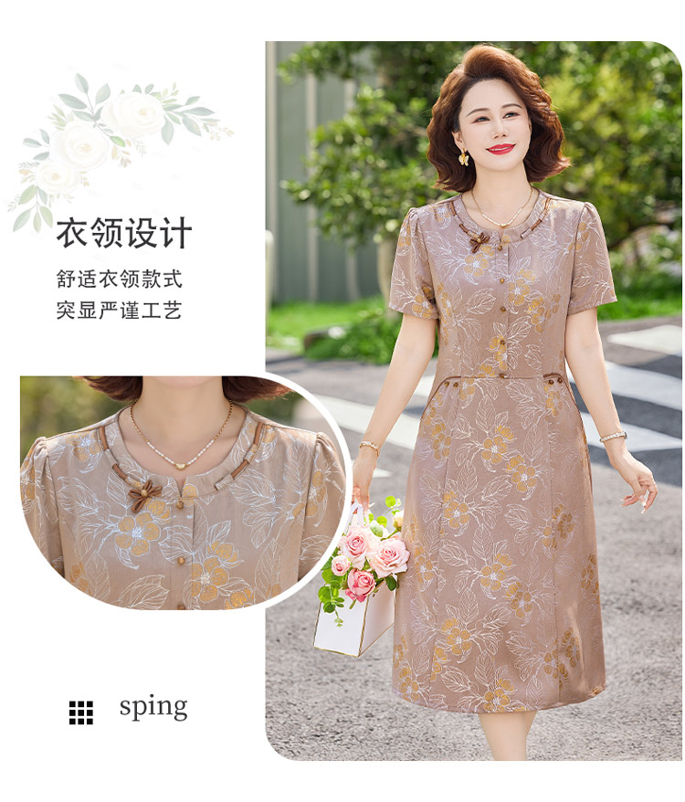 RY3960# 复古国风短袖中长款裙子中老年妈妈装大码显瘦遮肉过膝连衣裙女装