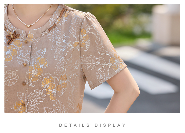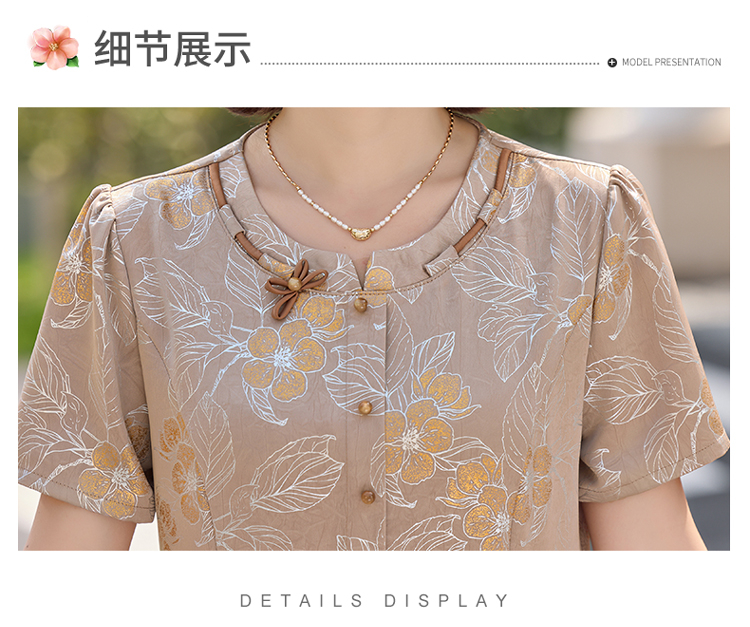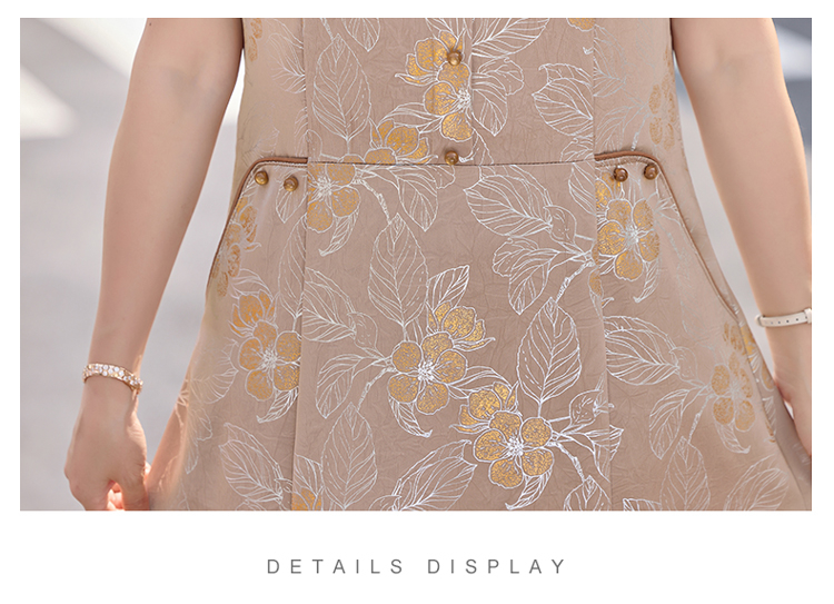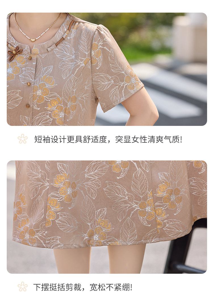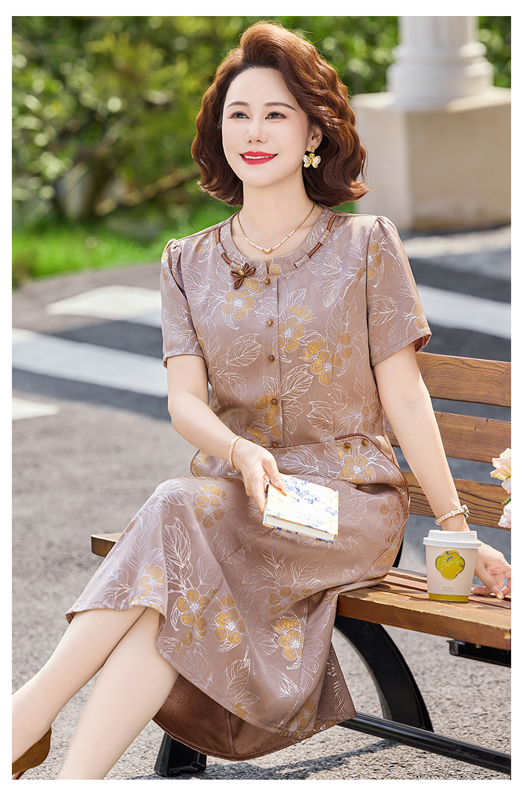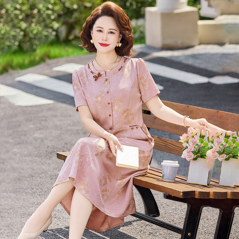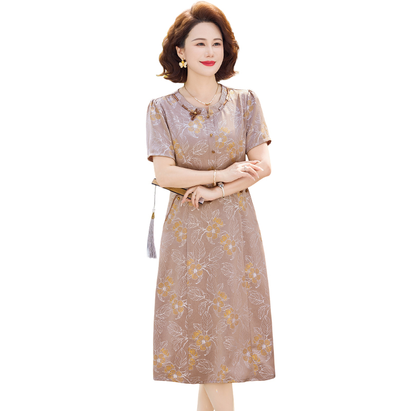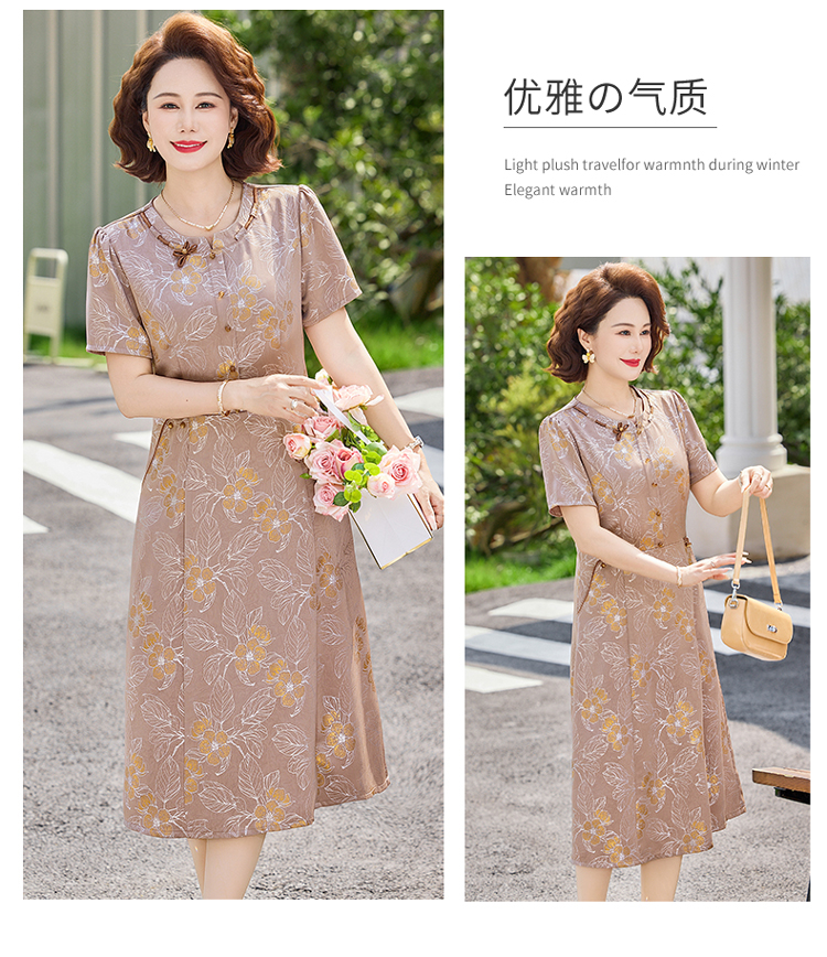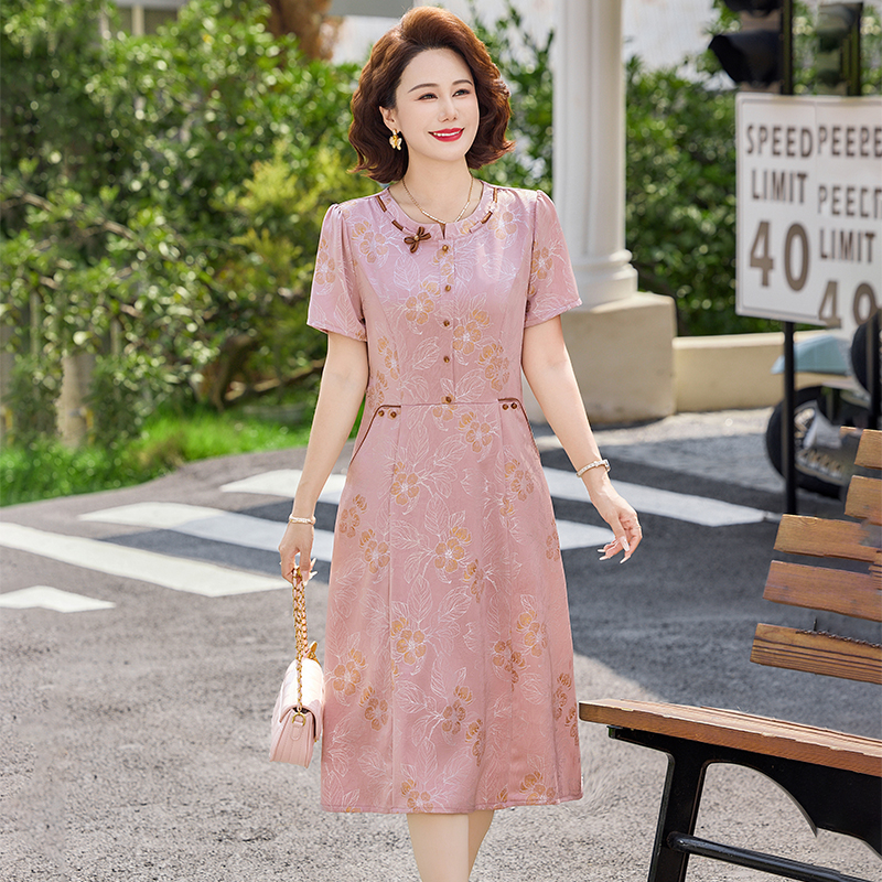 RY3960# 复古国风短袖中长款裙子中老年妈妈装大码显瘦遮肉过膝连衣裙女装