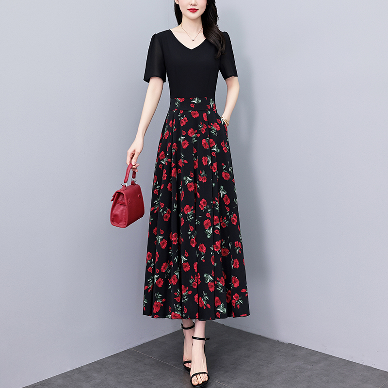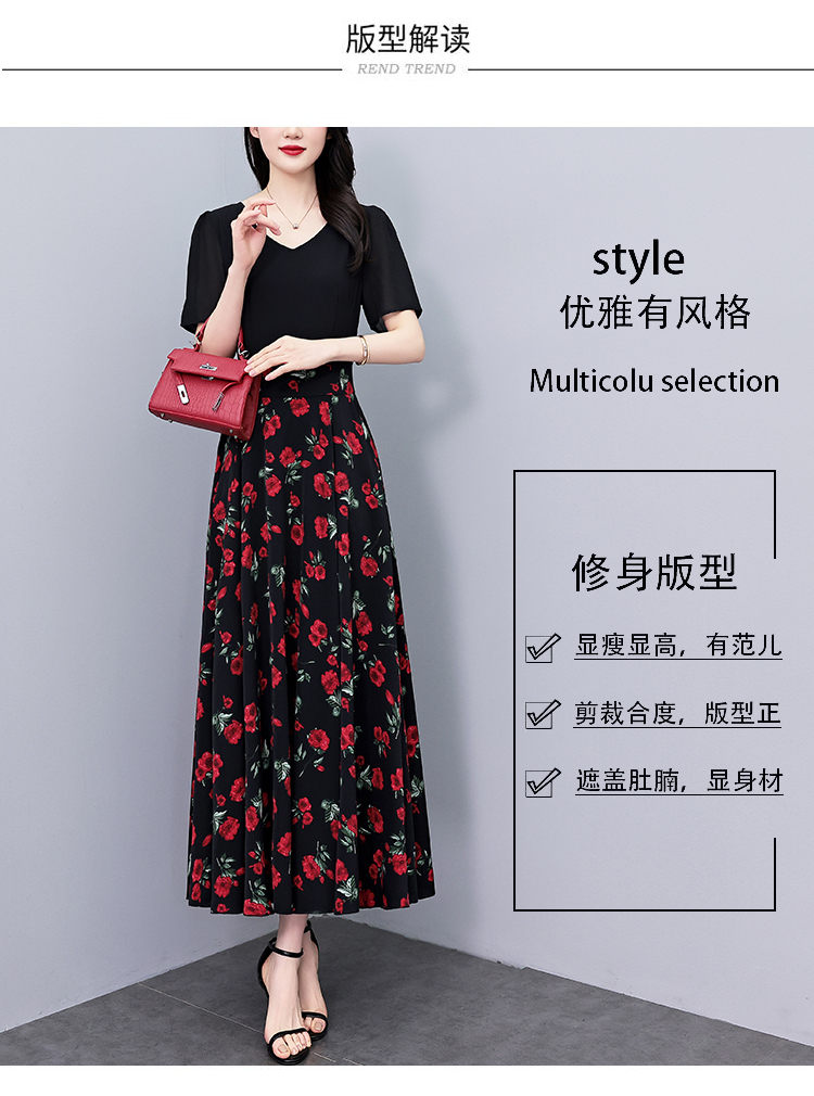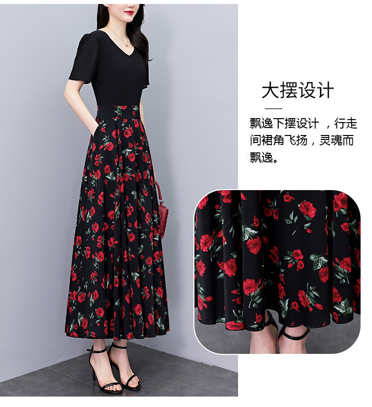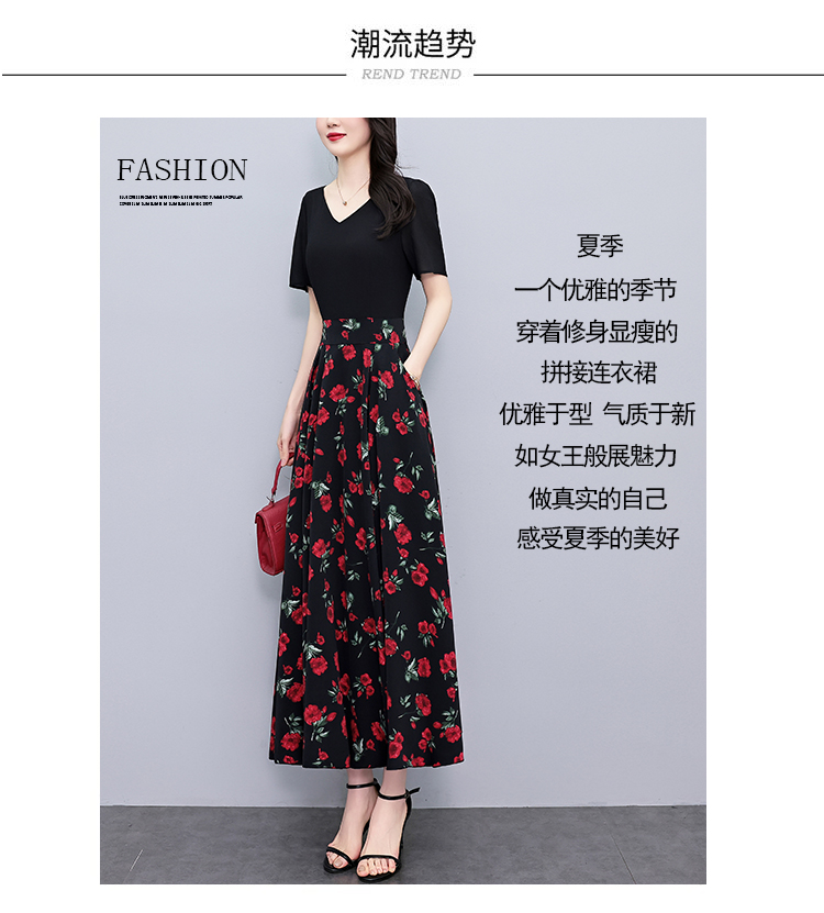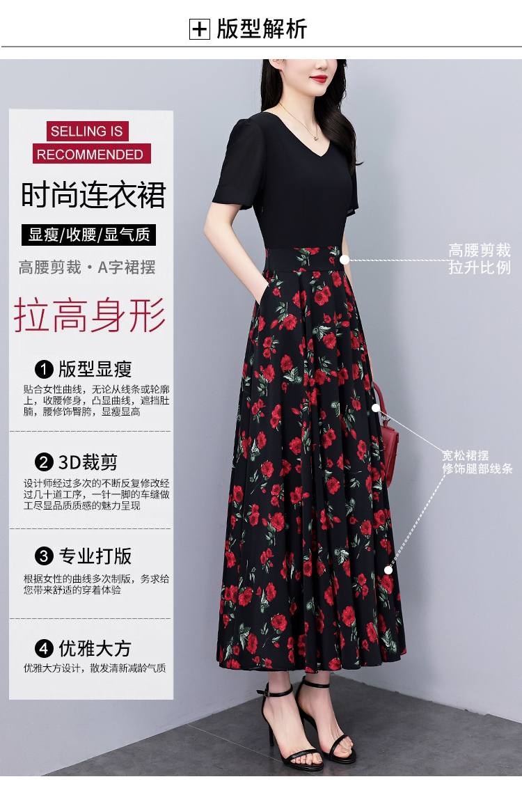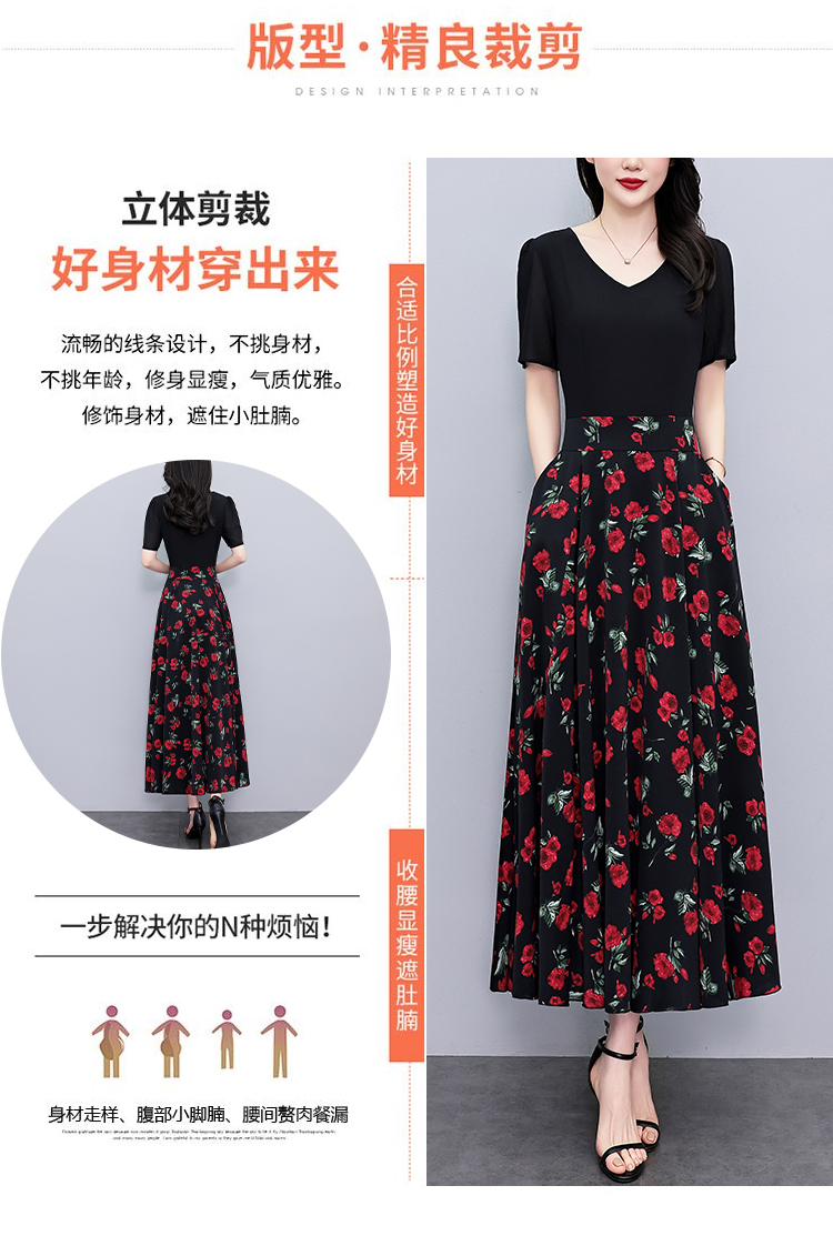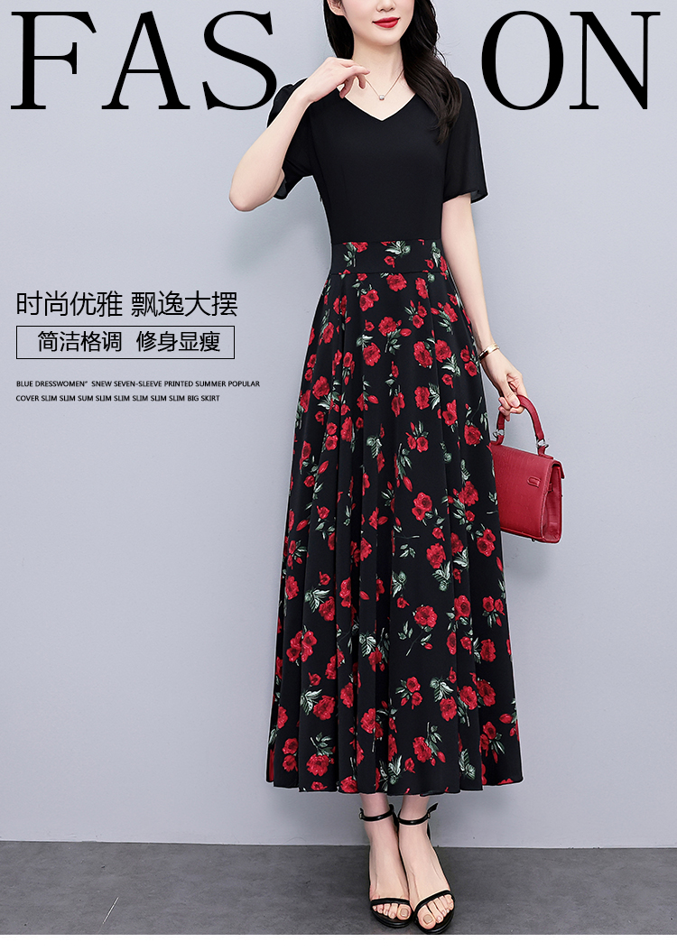 RY3968# 夏季新款高档印花雪纺连衣裙长款大码收腰显瘦遮肚子长裙