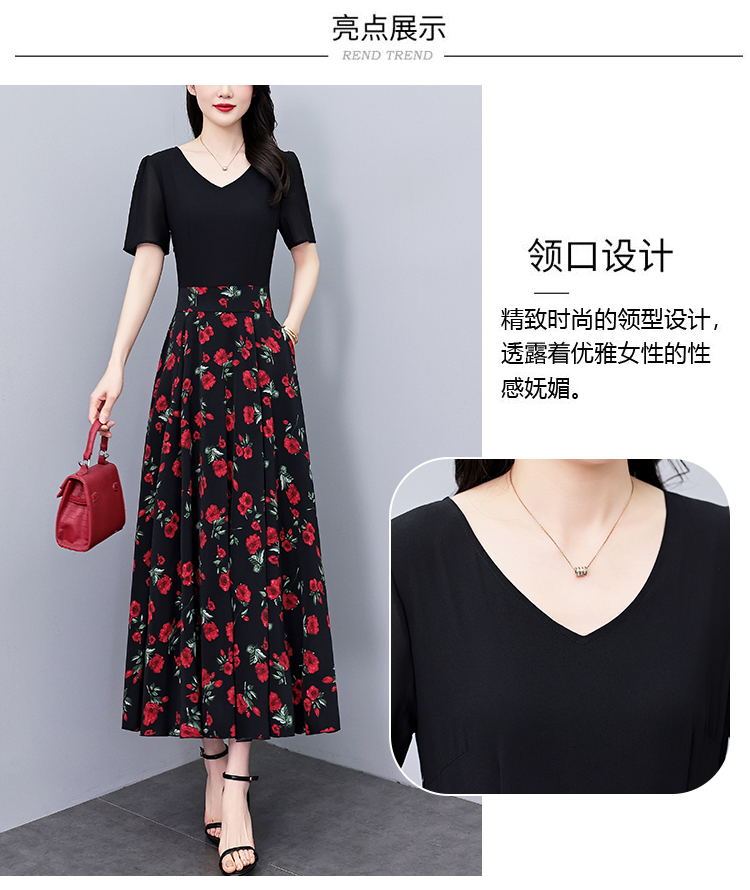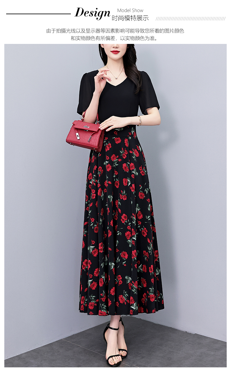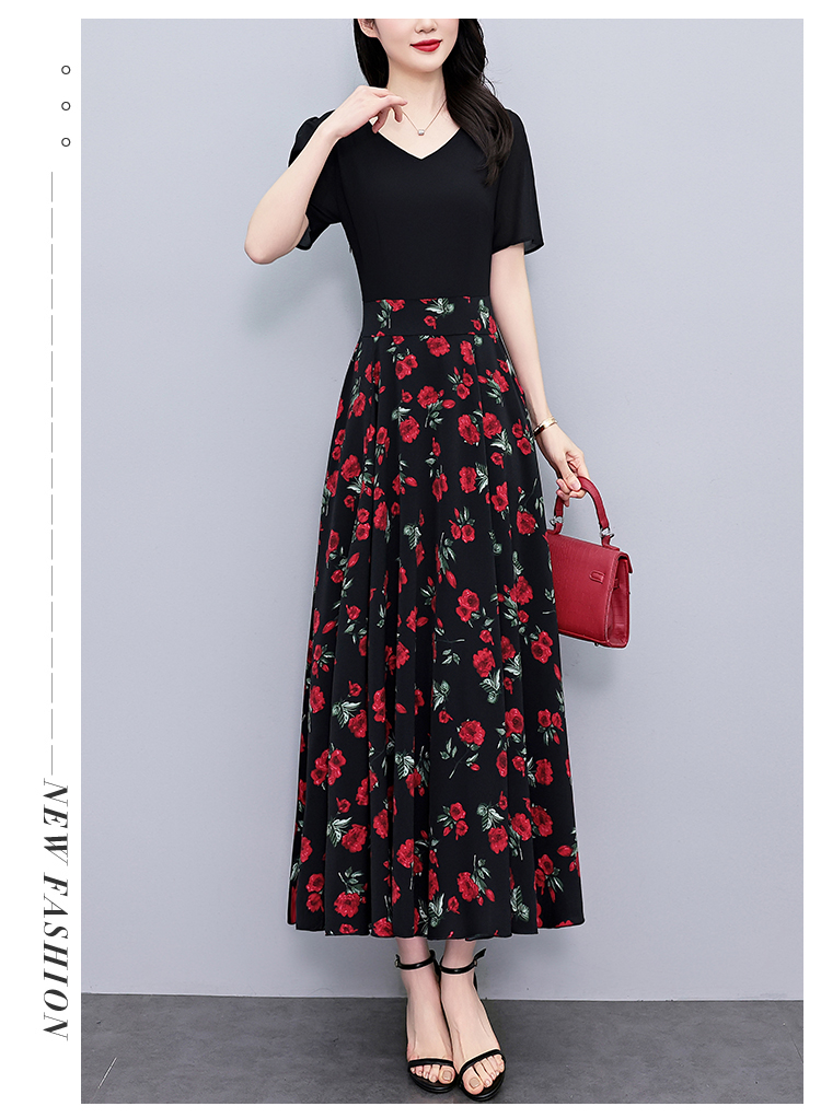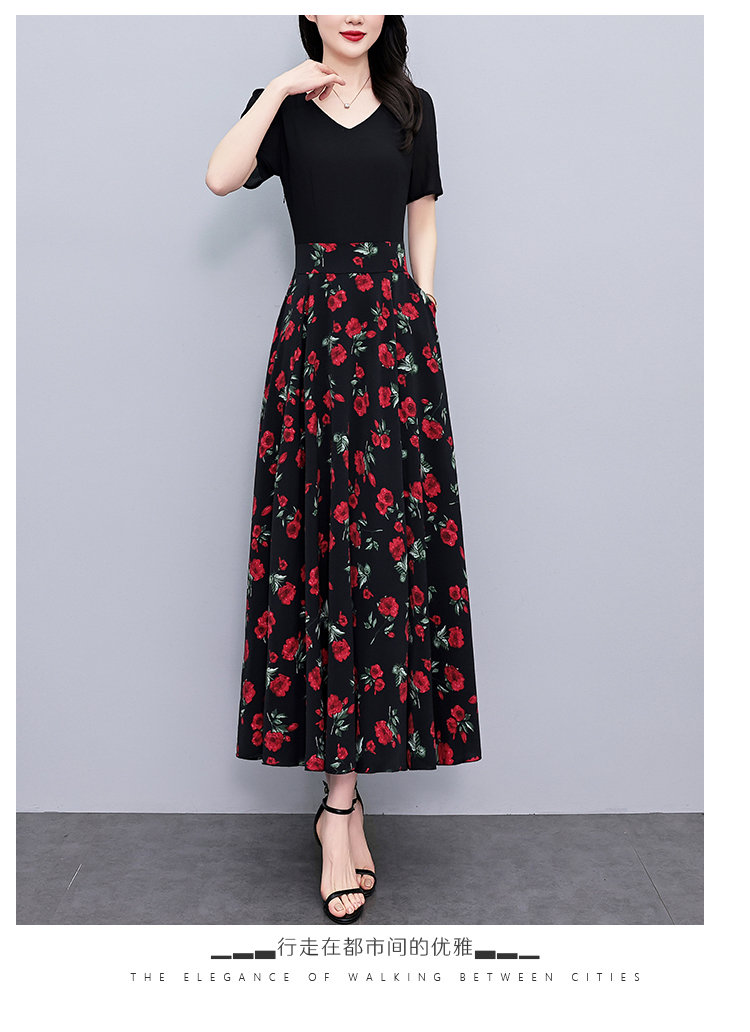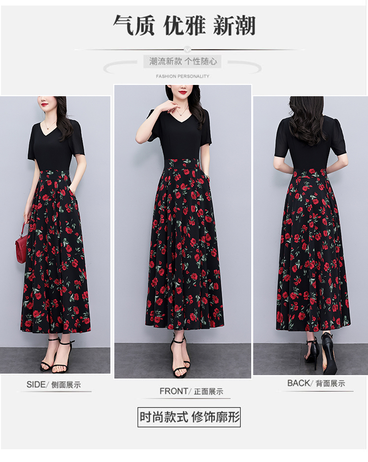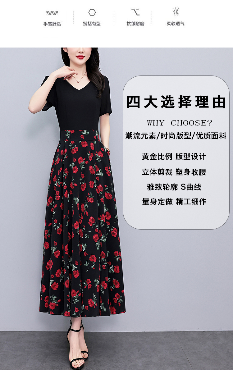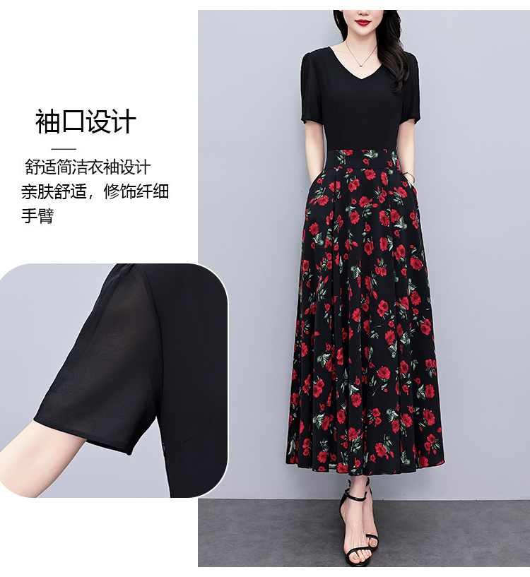 RY3968# 夏季新款高档印花雪纺连衣裙长款大码收腰显瘦遮肚子长裙