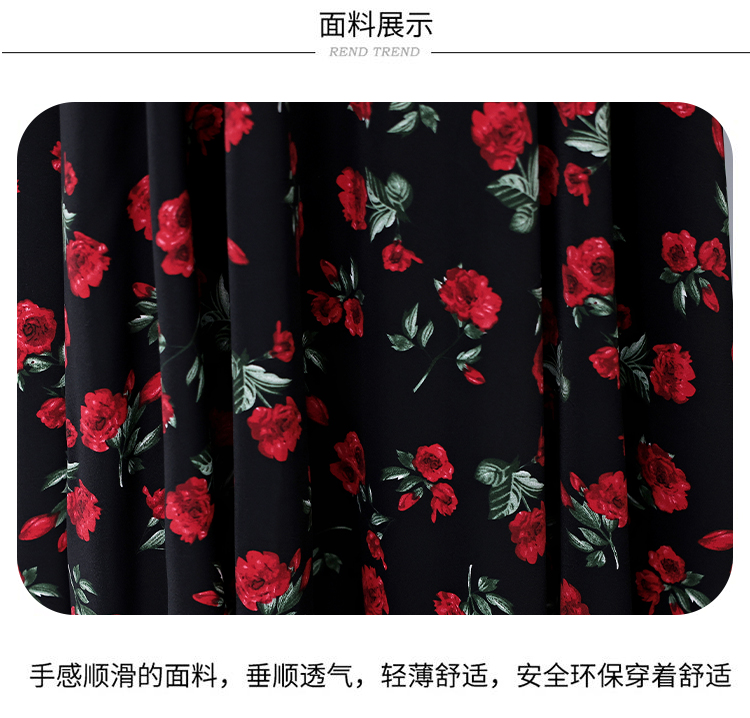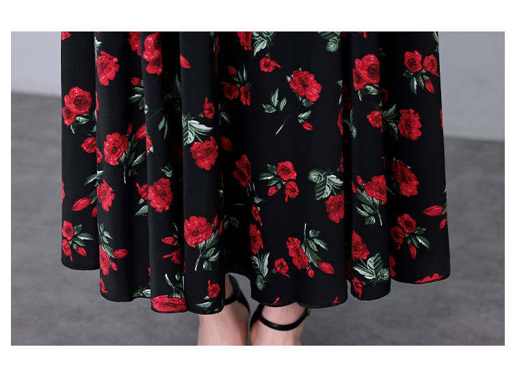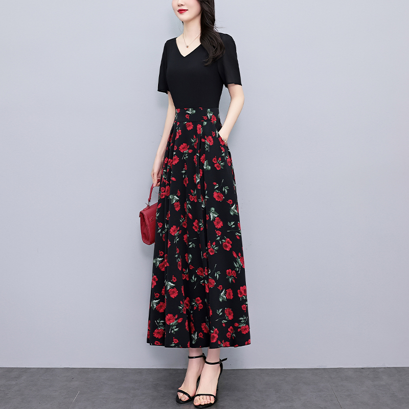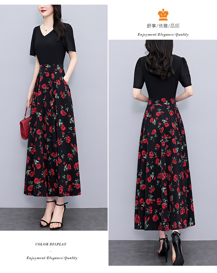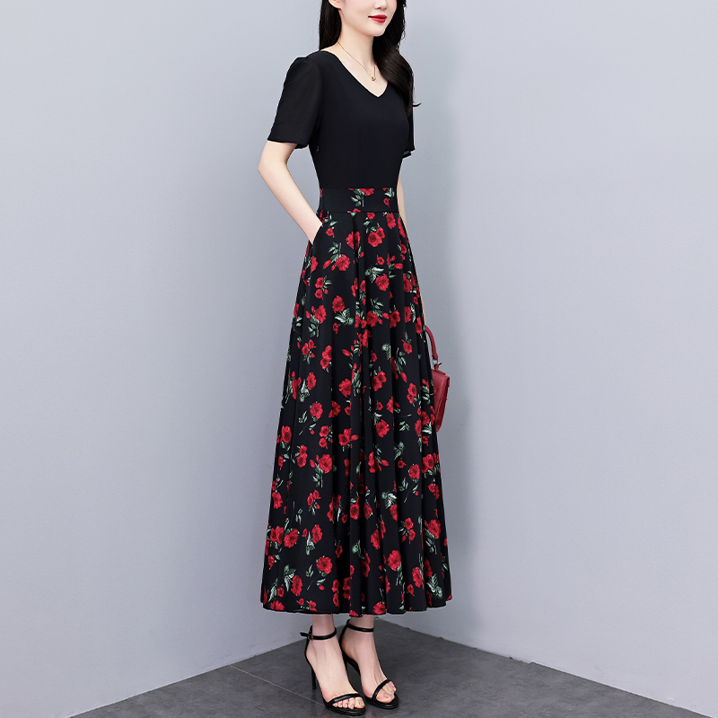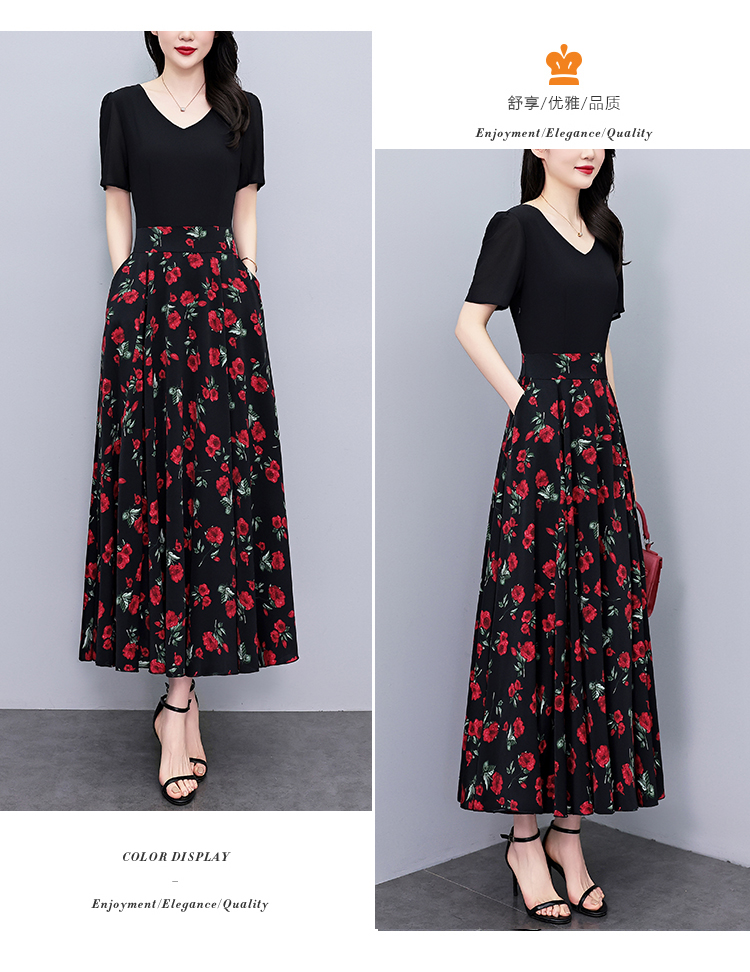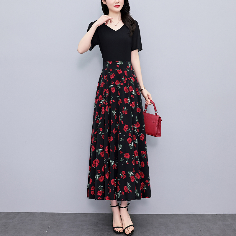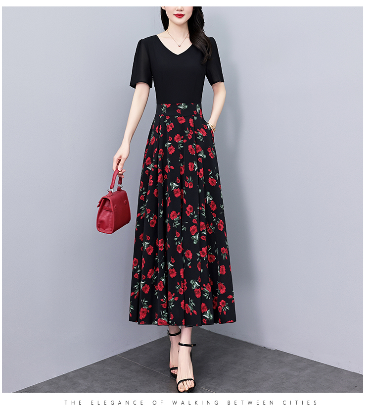 RY3968# 夏季新款高档印花雪纺连衣裙长款大码收腰显瘦遮肚子长裙