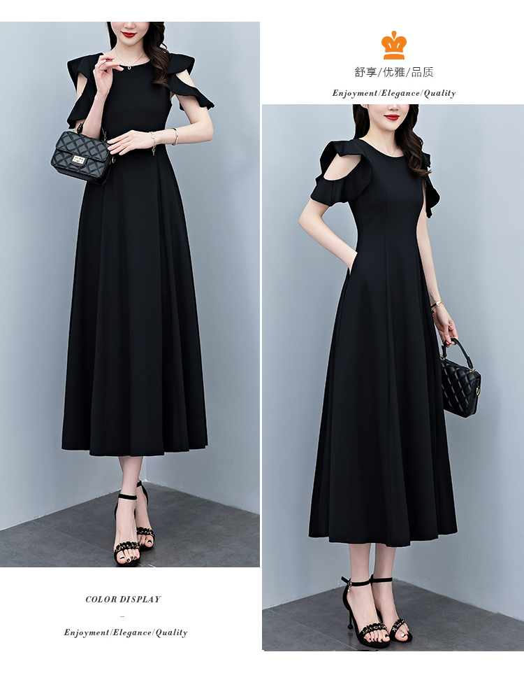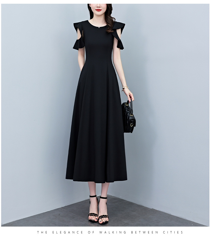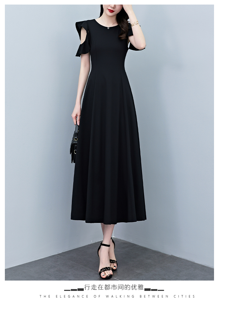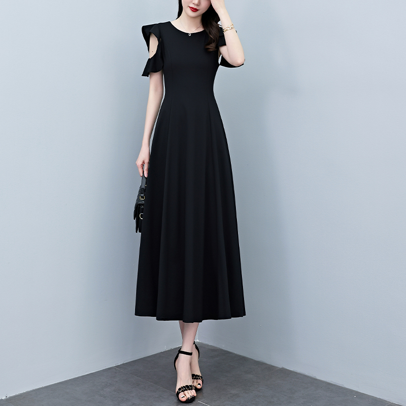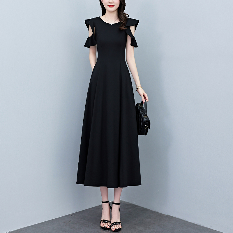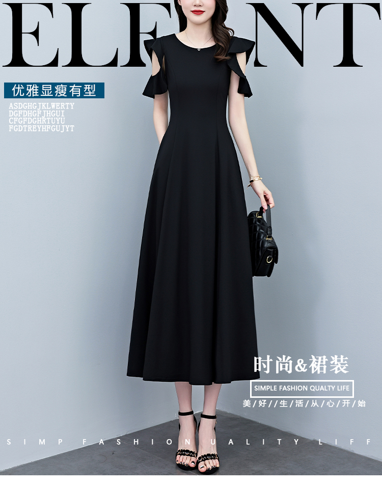 RY3974# 2026夏季新款赫本风黑色连衣裙女夏长款大码收腰显瘦胖mm小黑裙子
