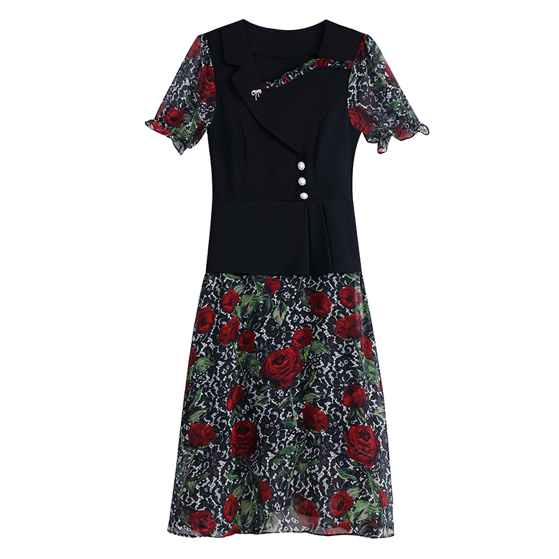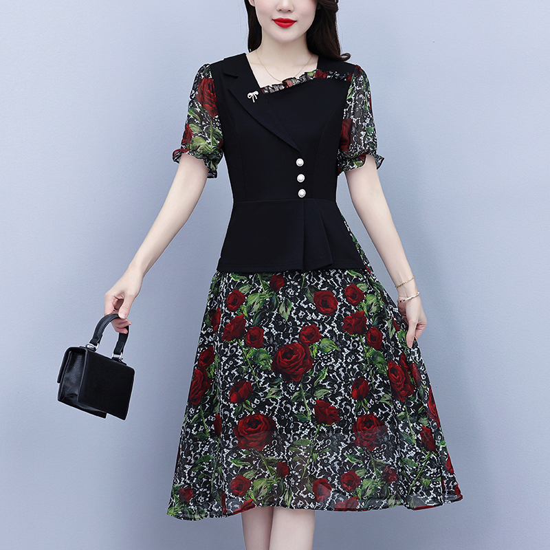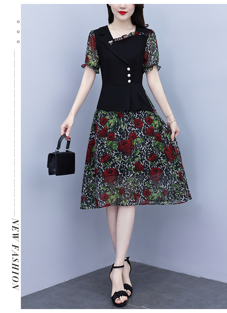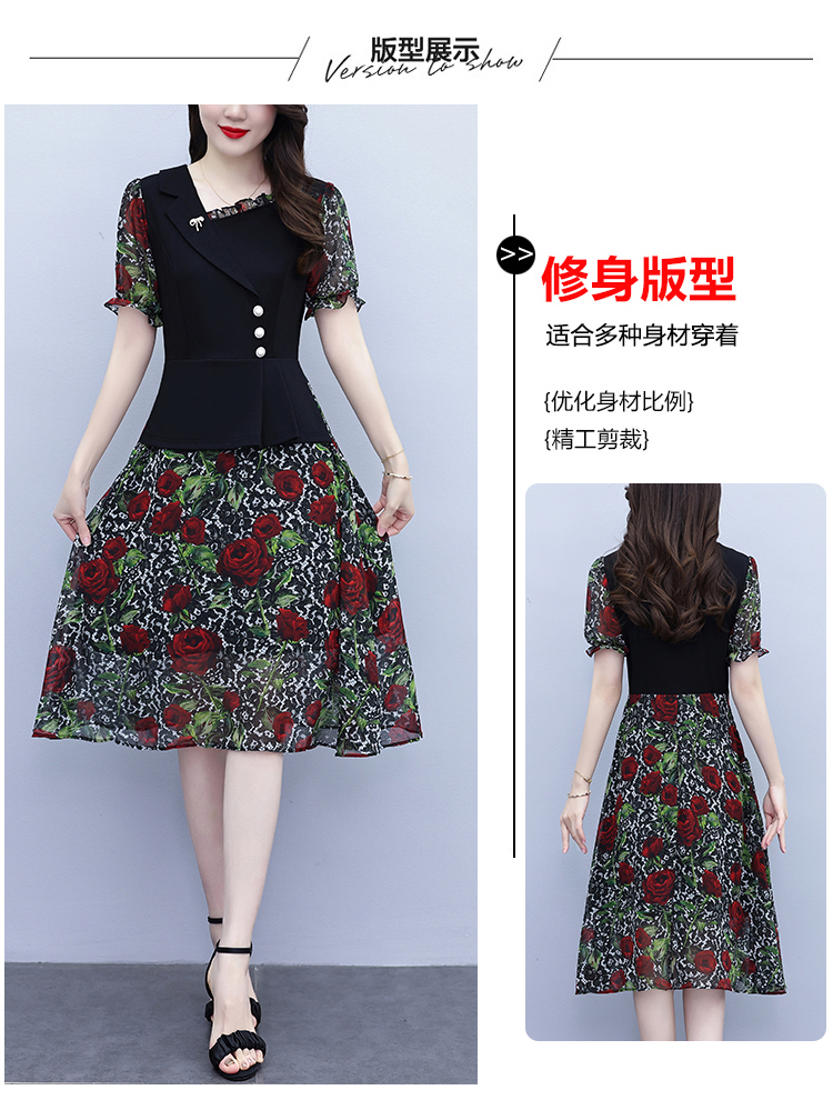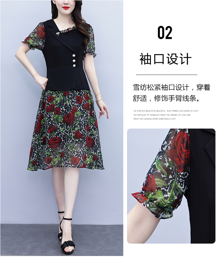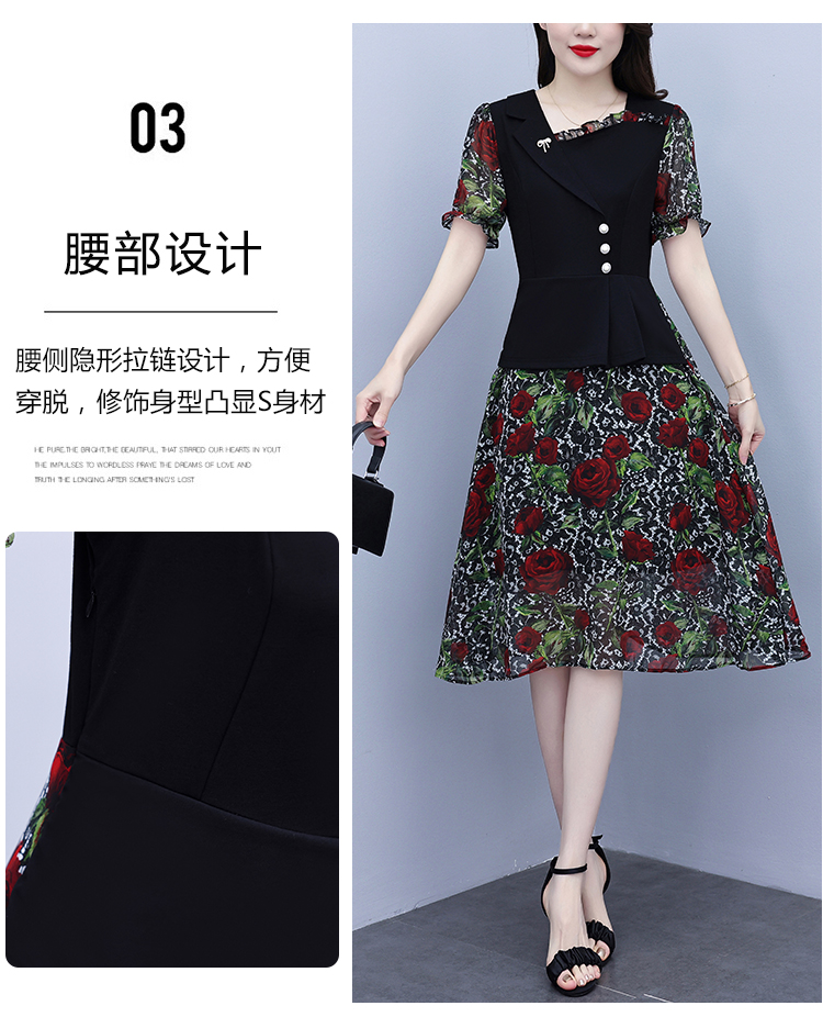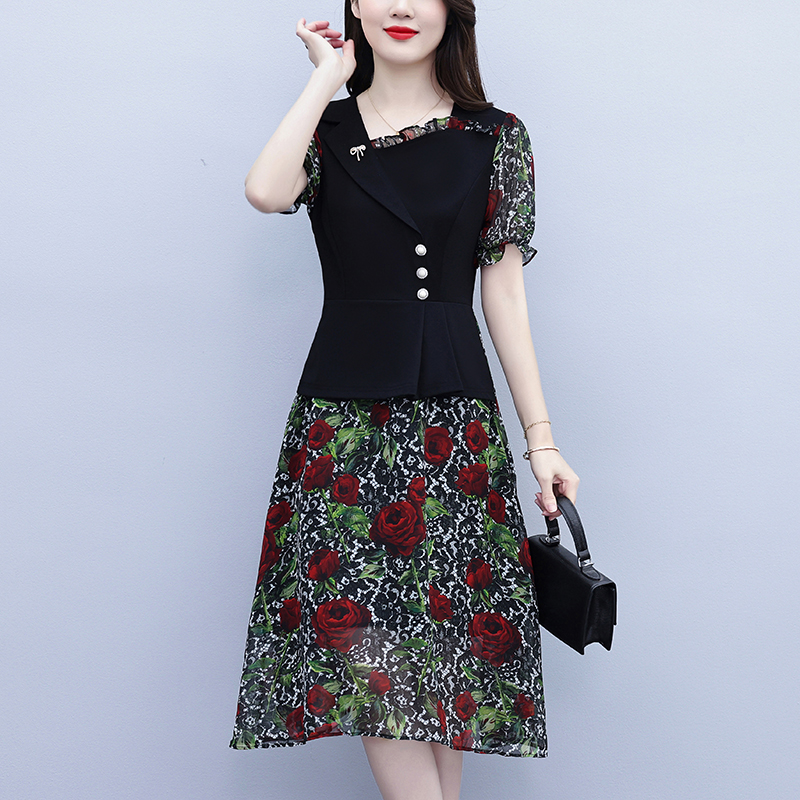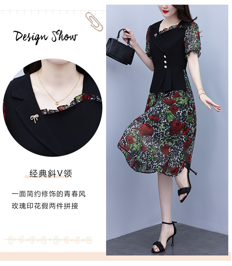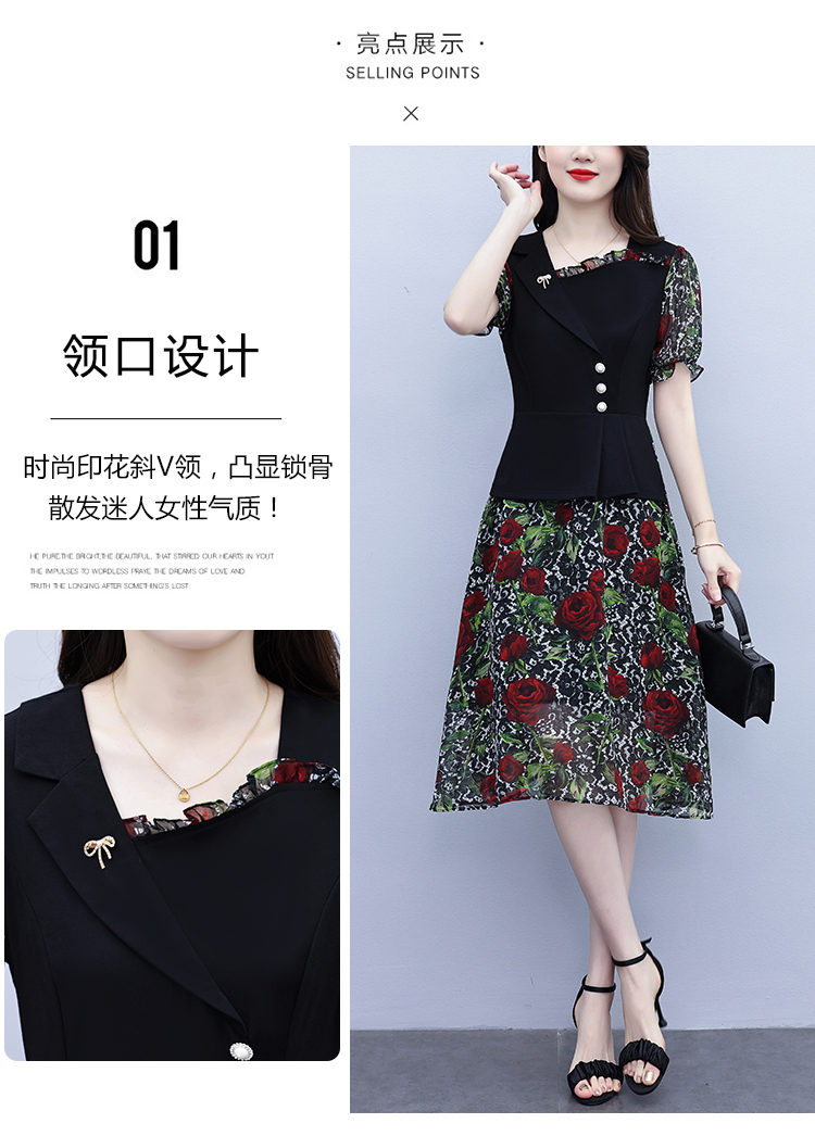 RY3984# 2026夏季新款胖mm西装领雪纺碎花拼接时尚遮肚中年妈妈气质连衣裙