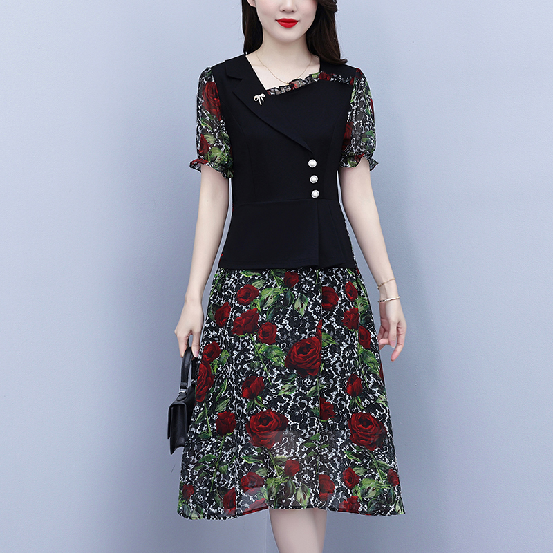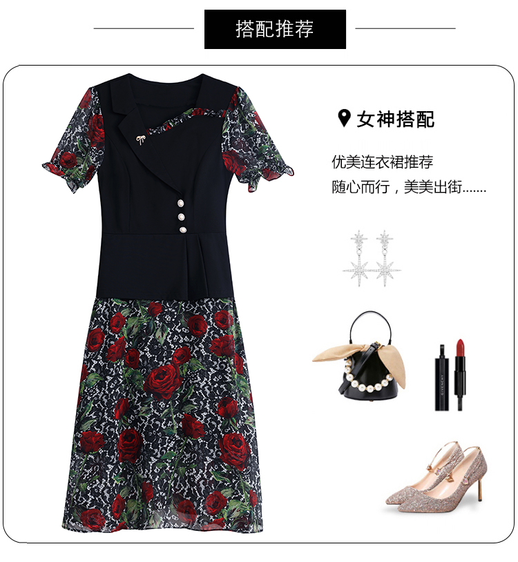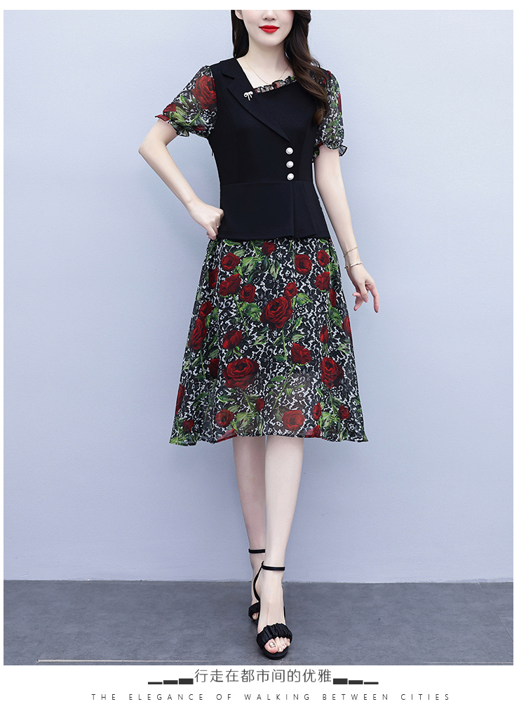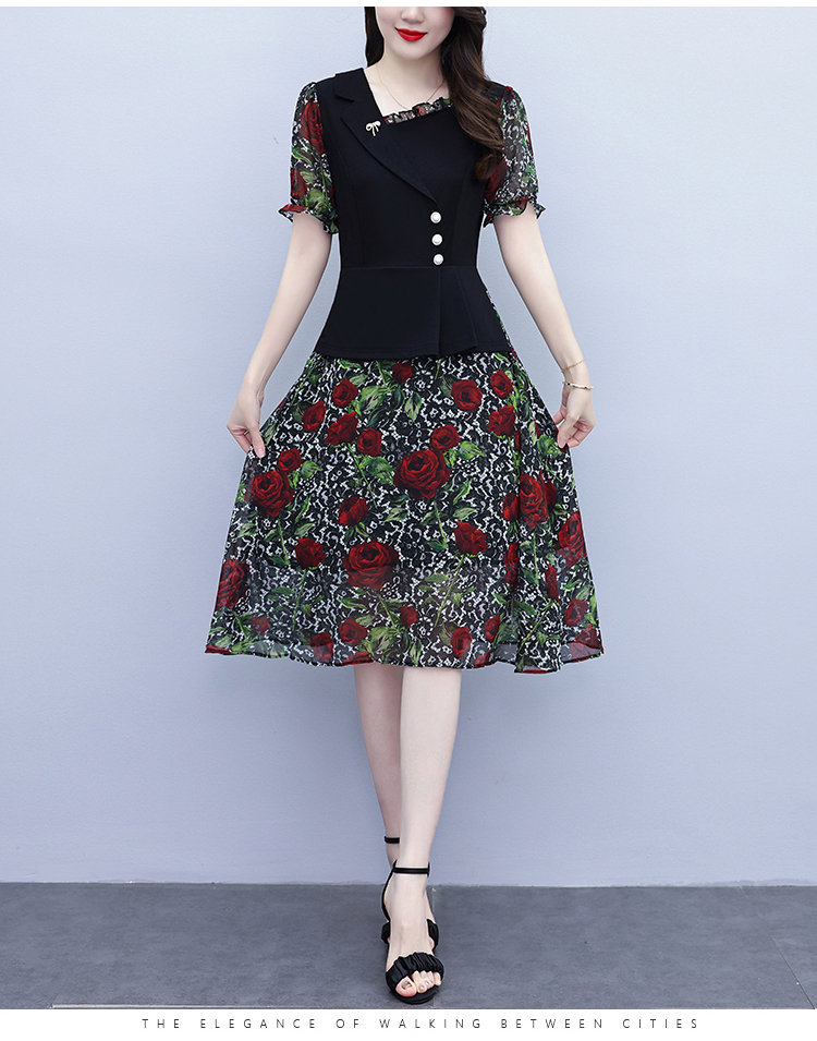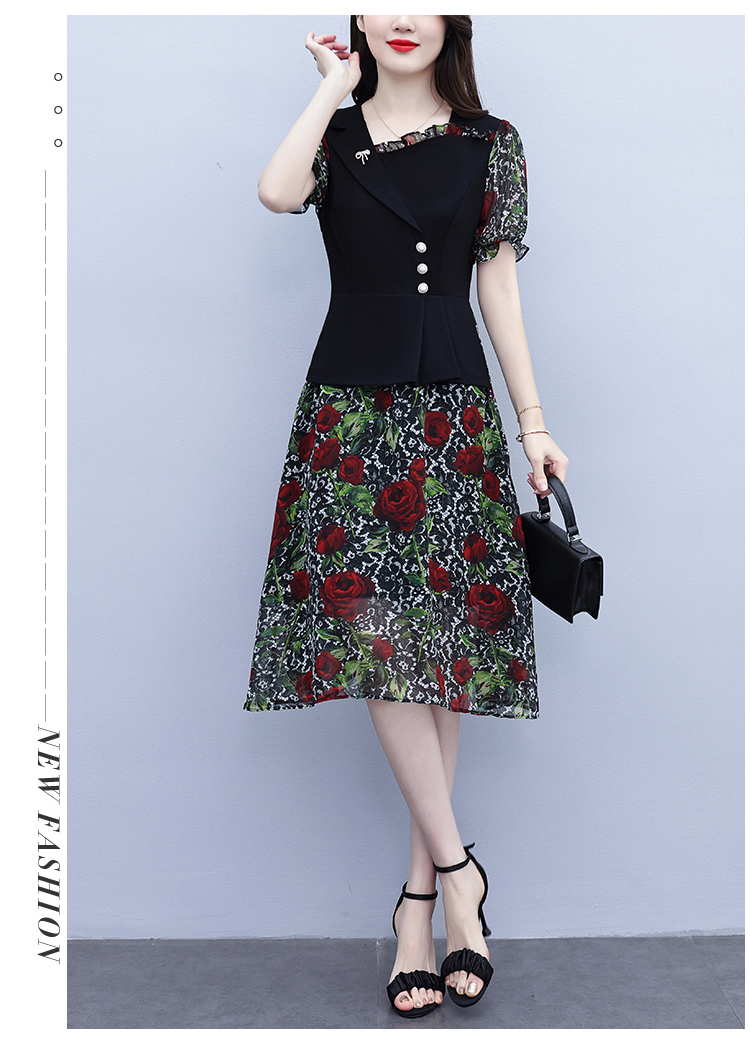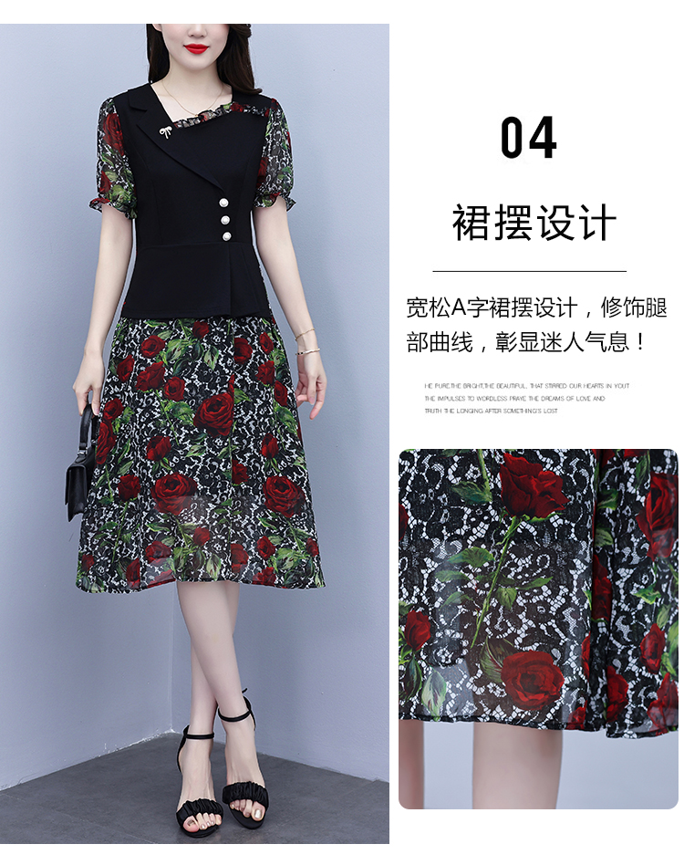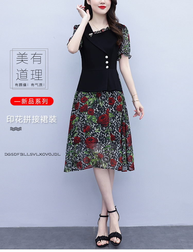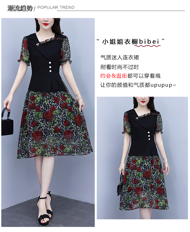 RY3984# 2026夏季新款胖mm西装领雪纺碎花拼接时尚遮肚中年妈妈气质连衣裙