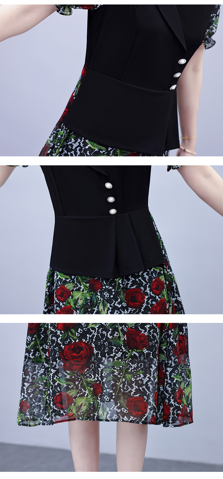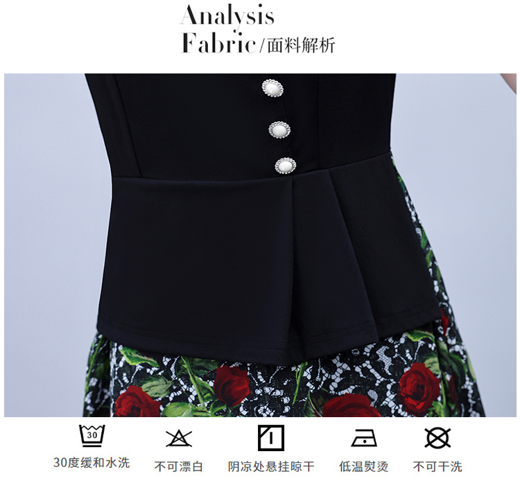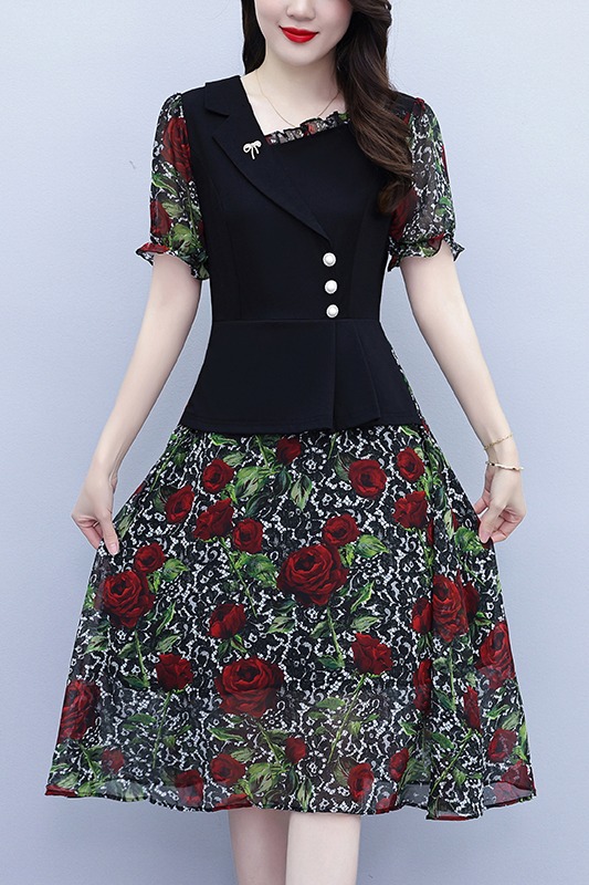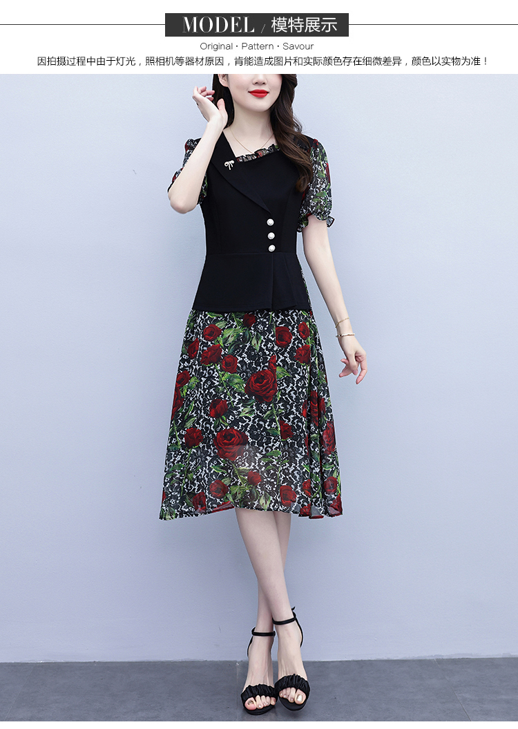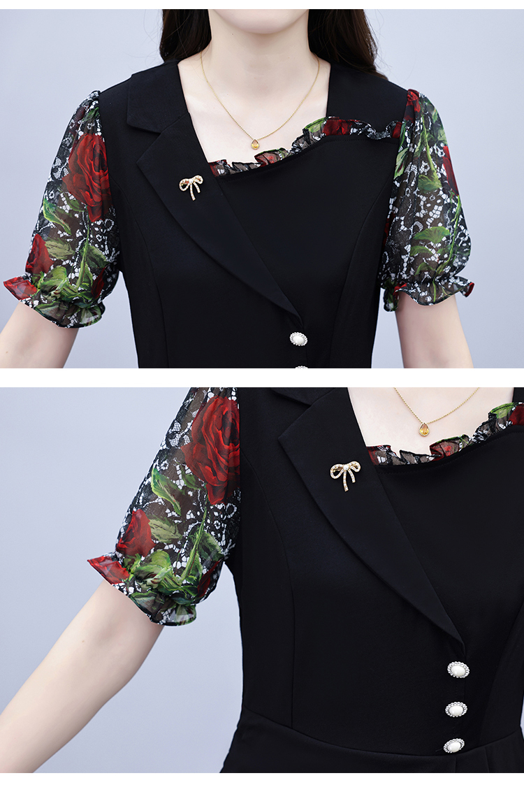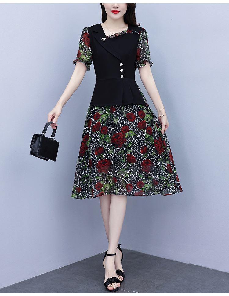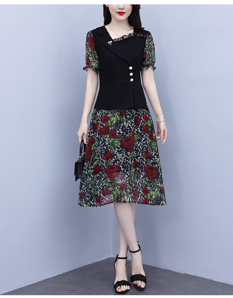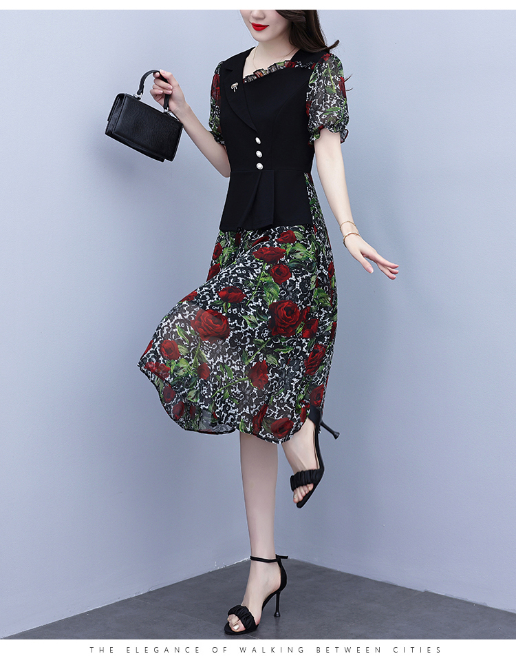 RY3984# 2026夏季新款胖mm西装领雪纺碎花拼接时尚遮肚中年妈妈气质连衣裙