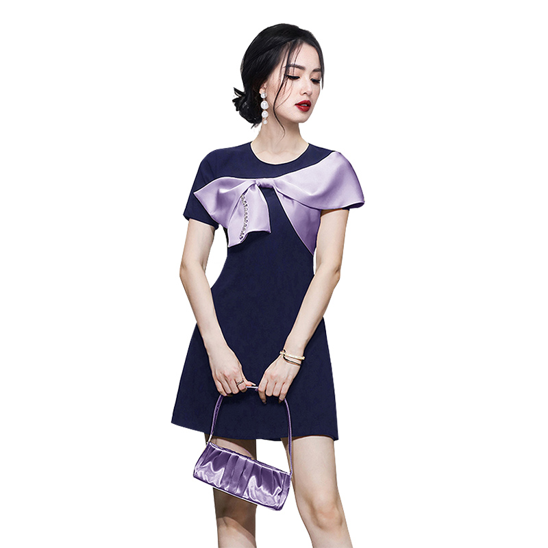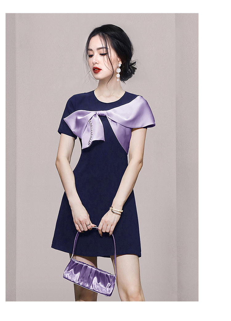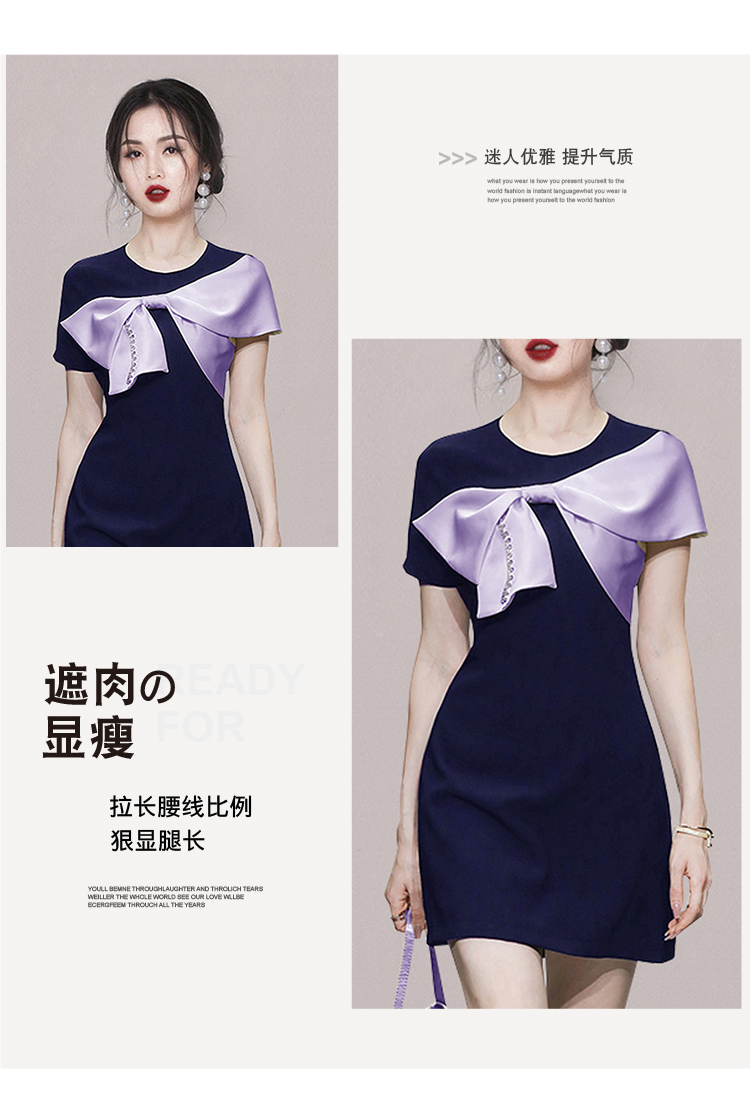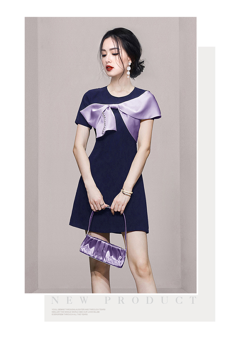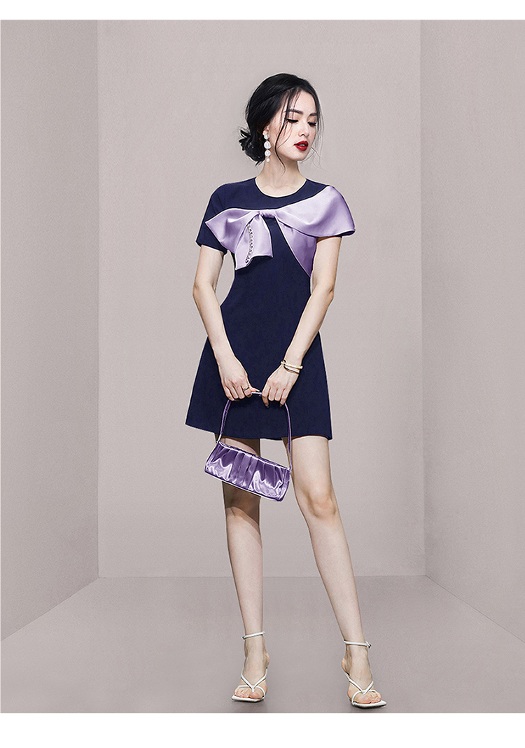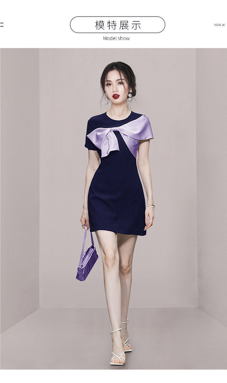 RY3993# 2026韩版名媛风藏青撞色蝴蝶结连衣裙女气质收腰显瘦小礼服裙