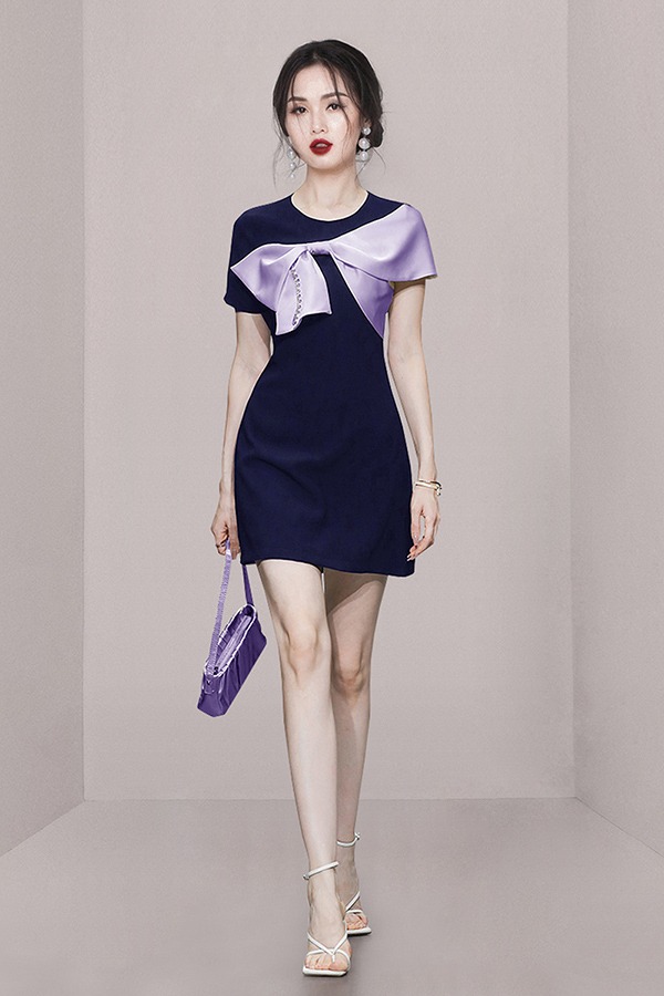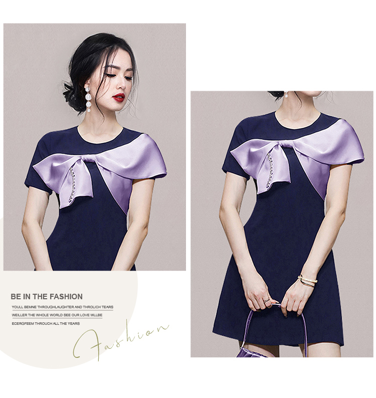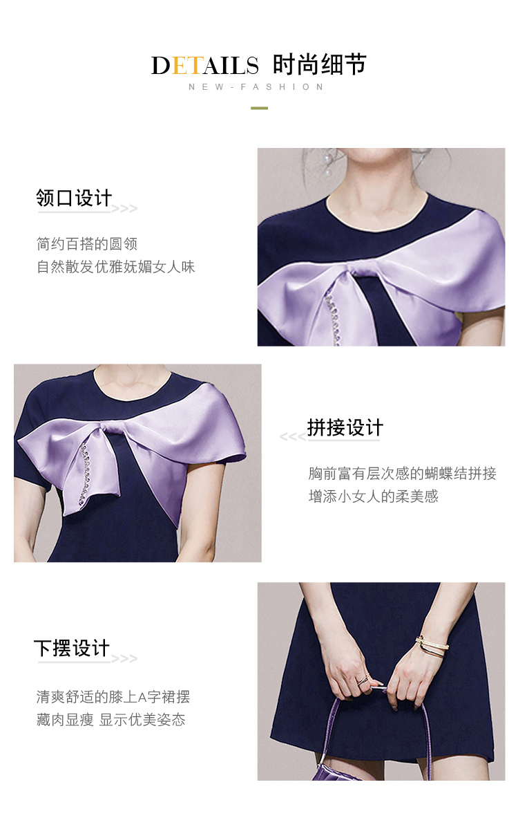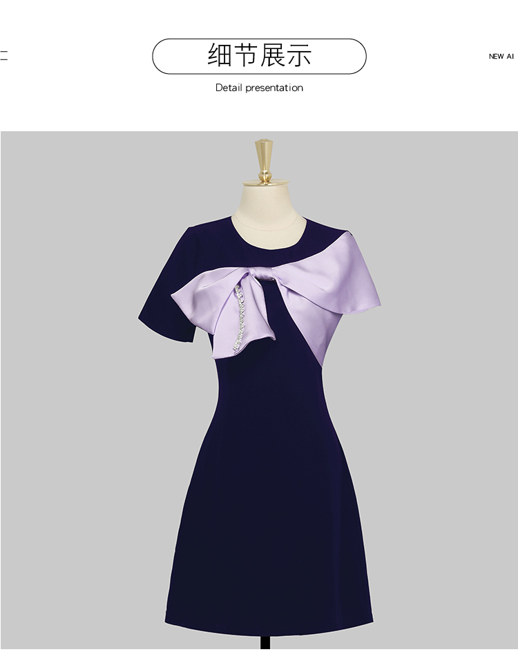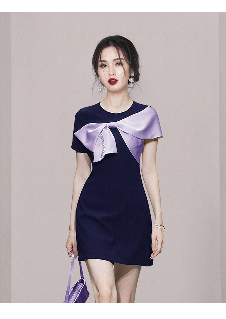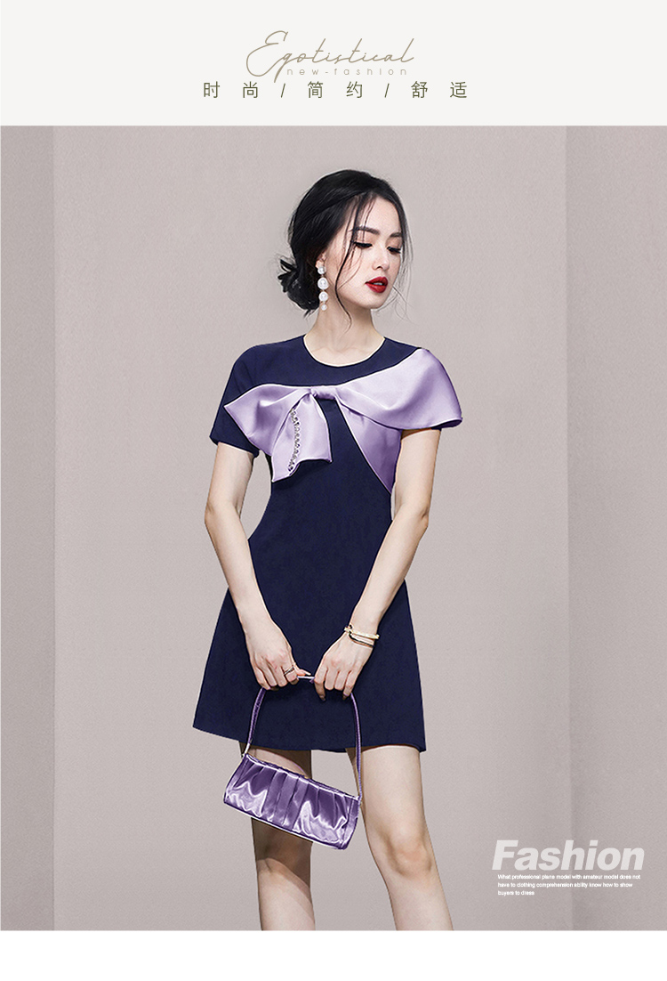 RY3993# 2026韩版名媛风藏青撞色蝴蝶结连衣裙女气质收腰显瘦小礼服裙