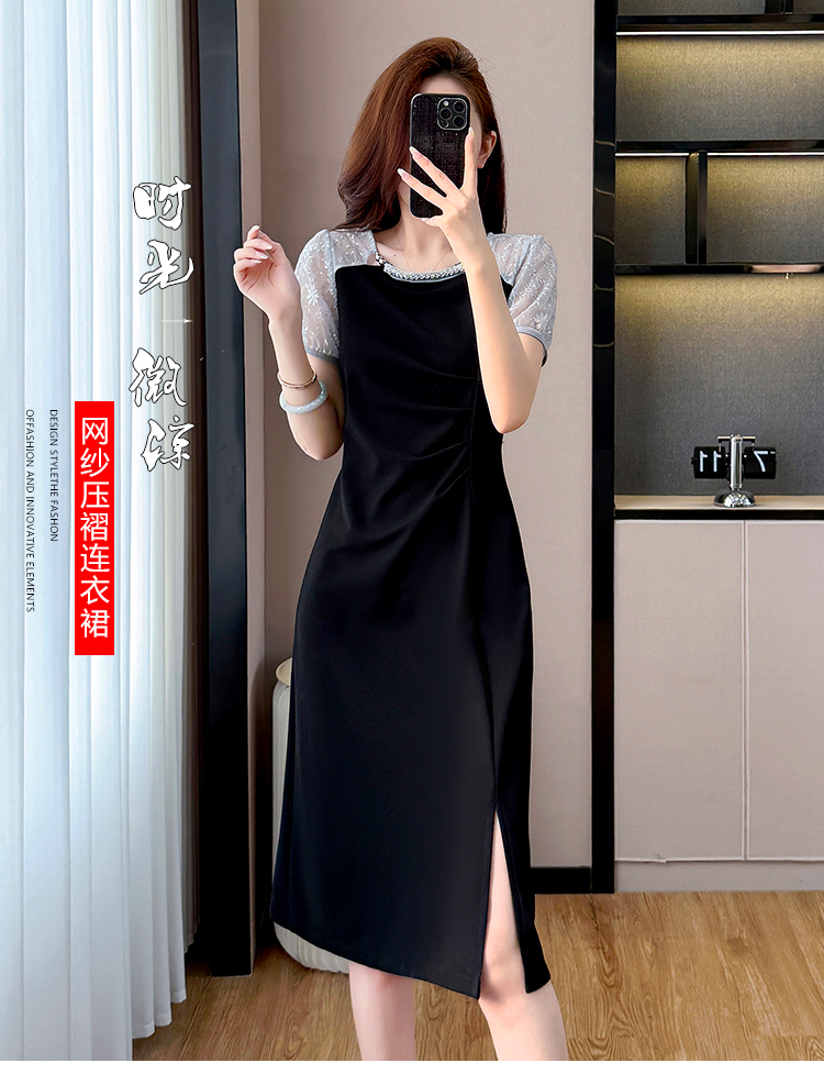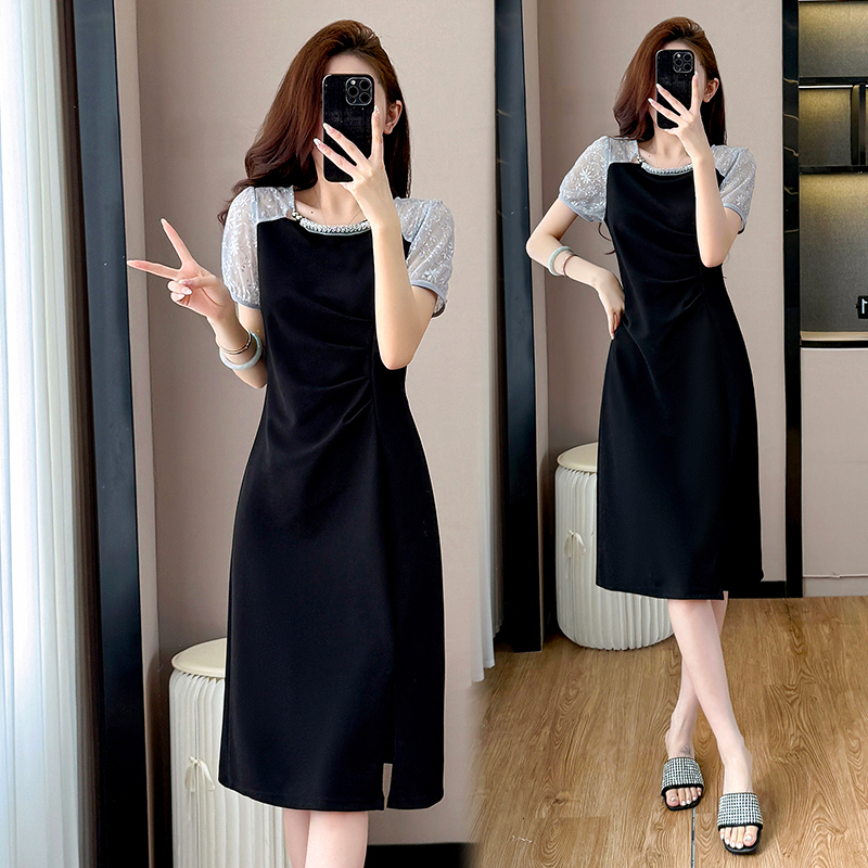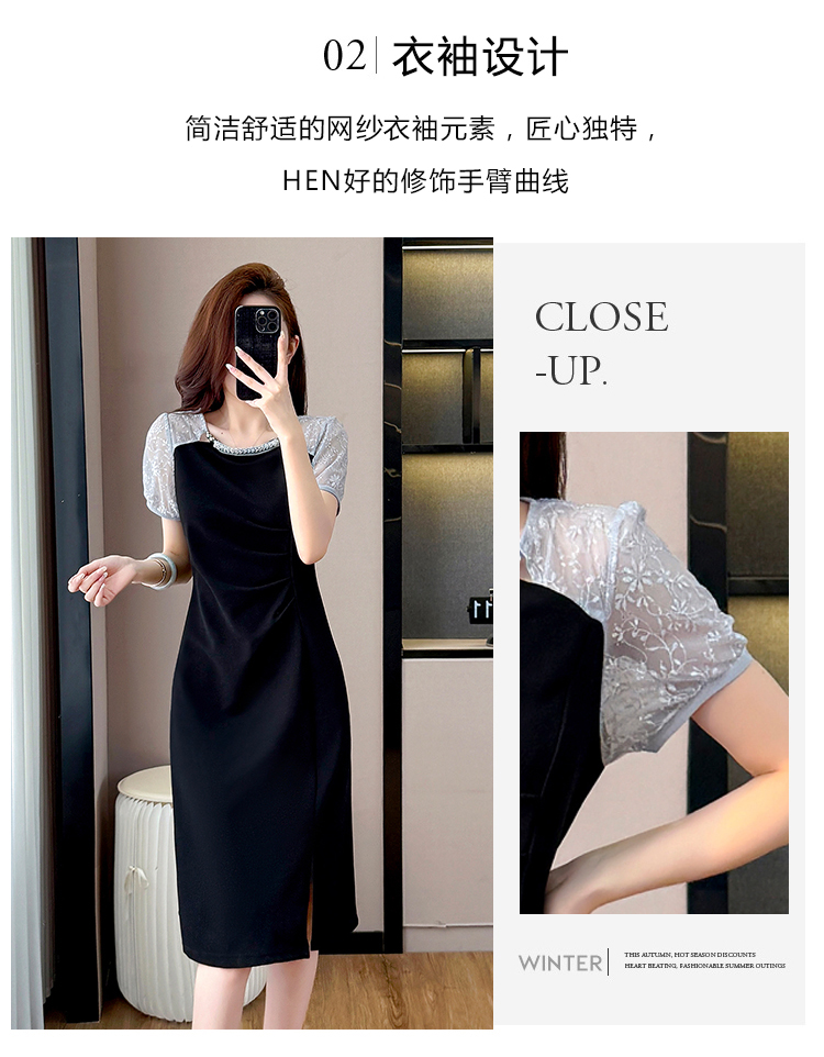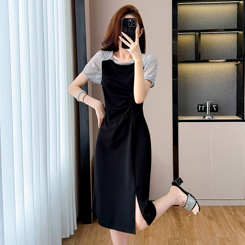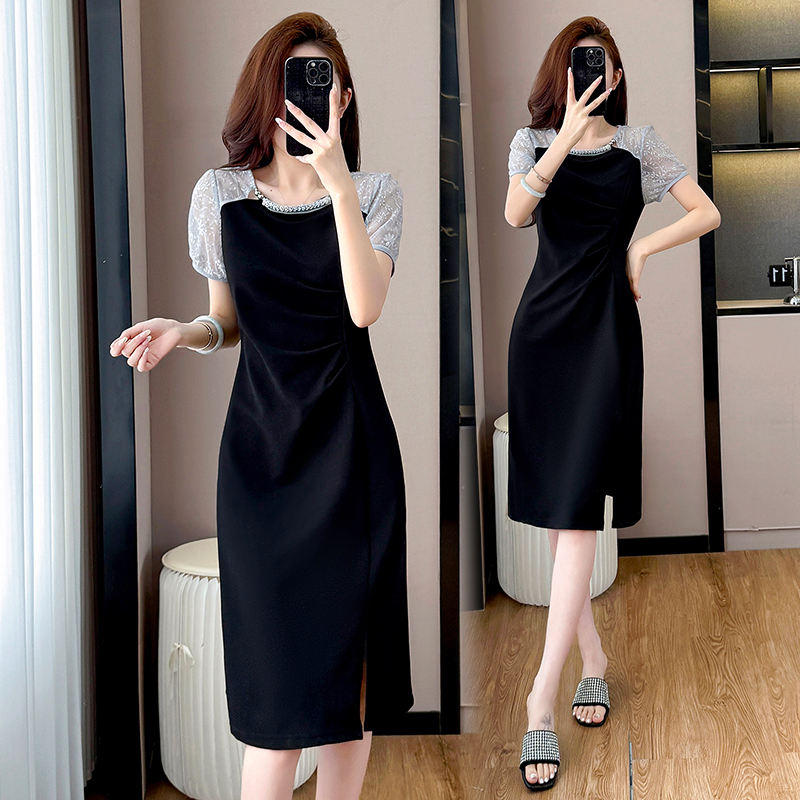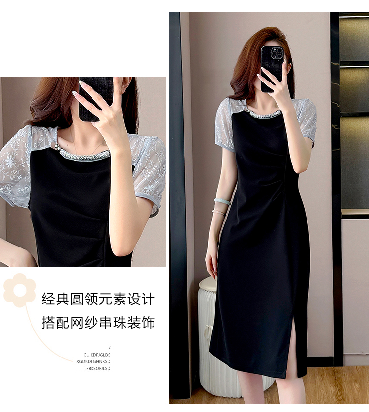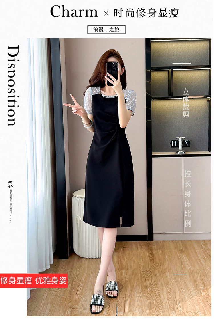 RY4003#胖mm新款钉珠时尚修身拼接洋气显瘦大码连衣裙夏季黑色开叉
