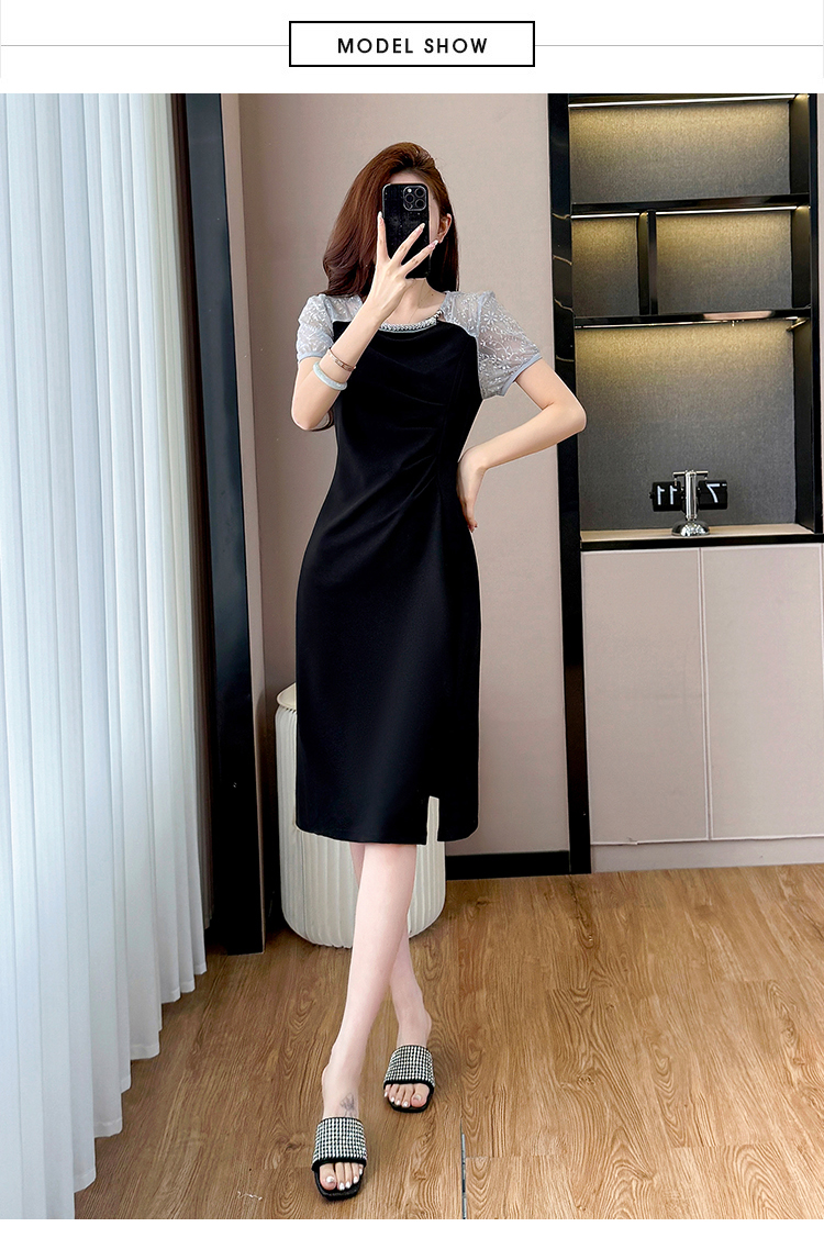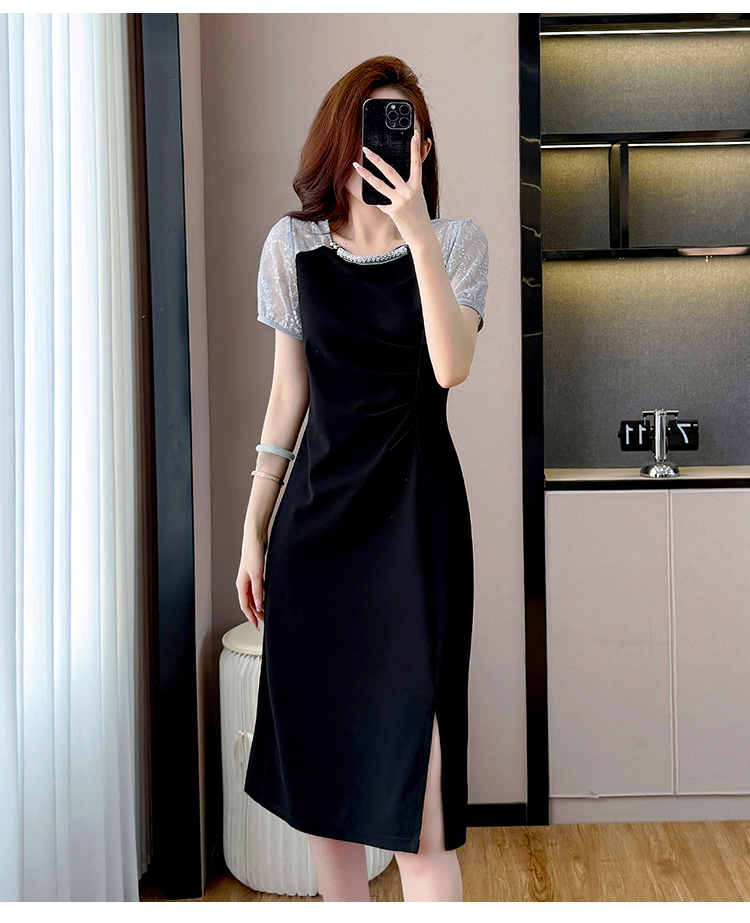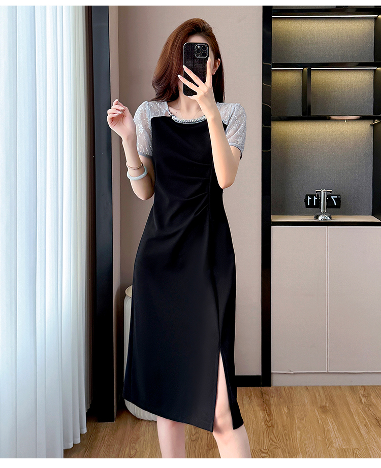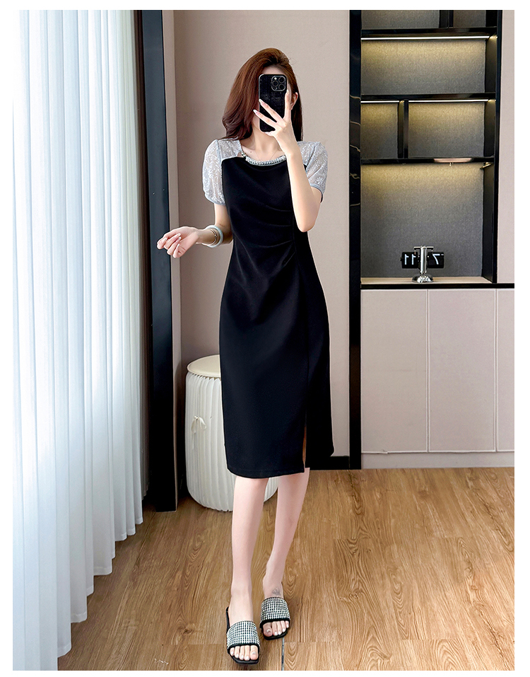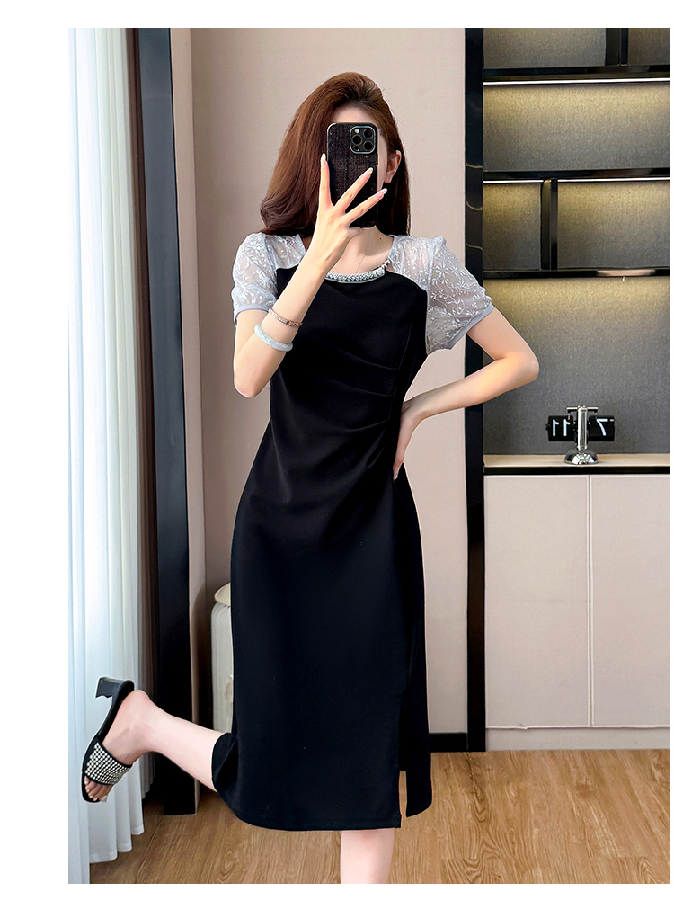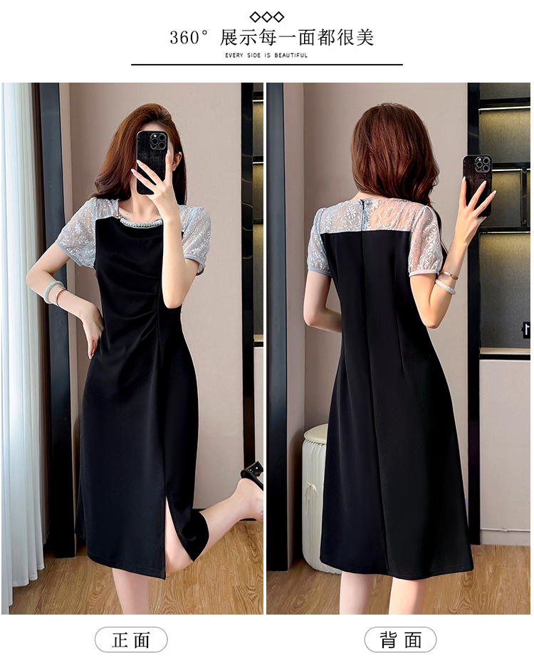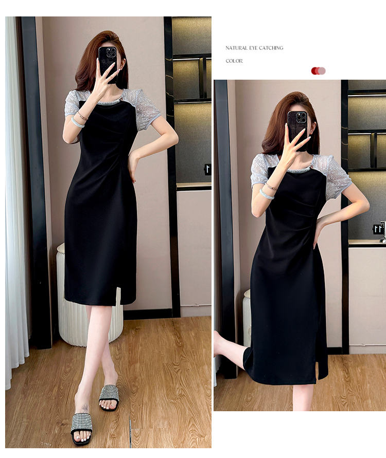 RY4003#胖mm新款钉珠时尚修身拼接洋气显瘦大码连衣裙夏季黑色开叉