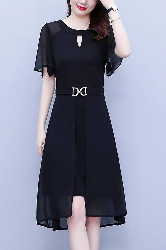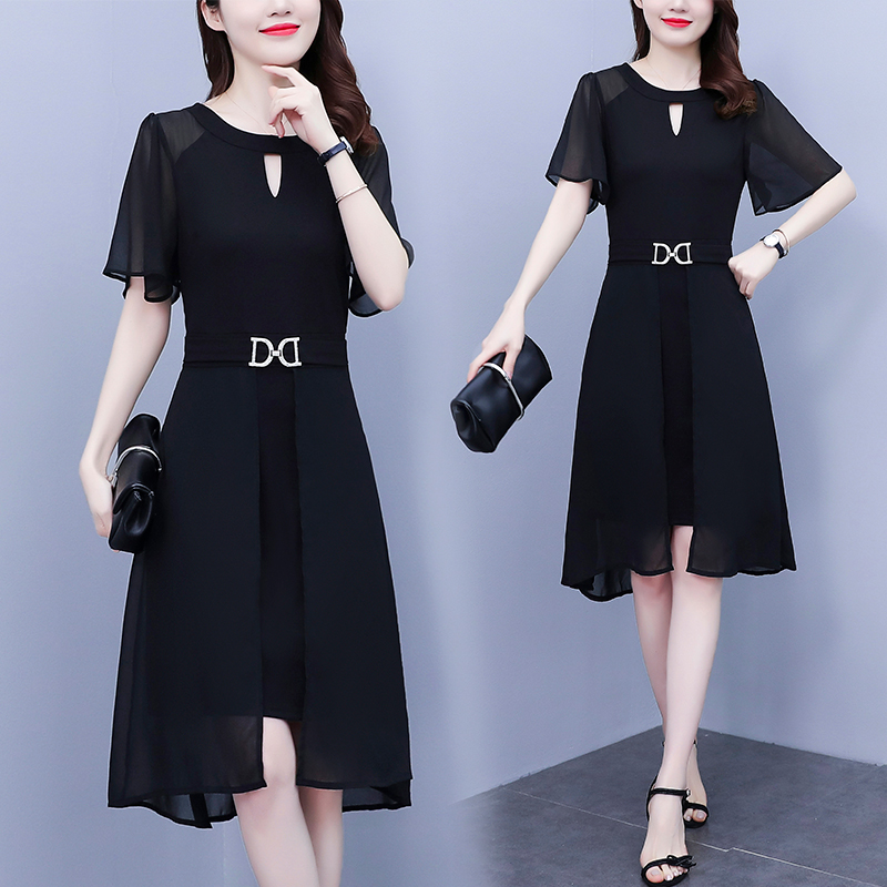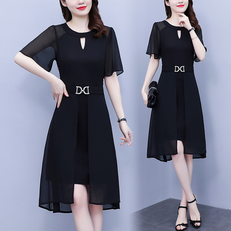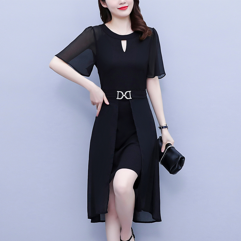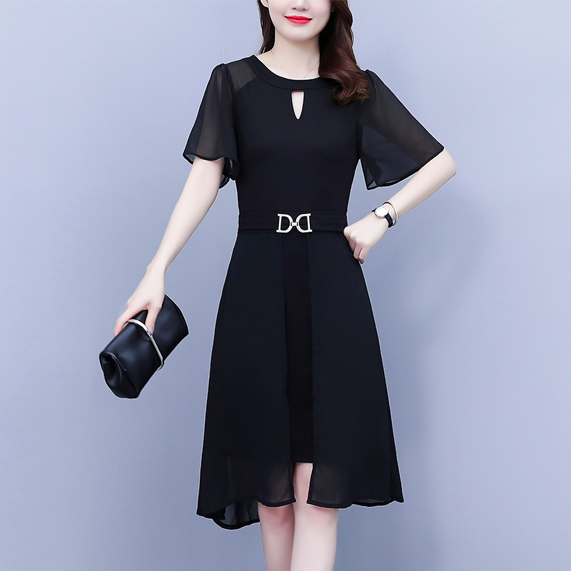 RY4070# 职场女装大码胖mm修身显瘦中长款镂空雪纺短袖遮肉显瘦连衣裙夏