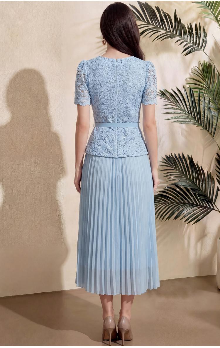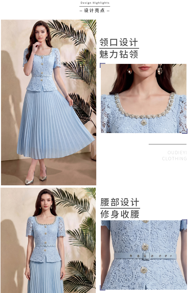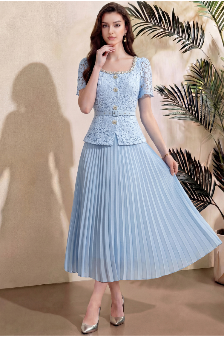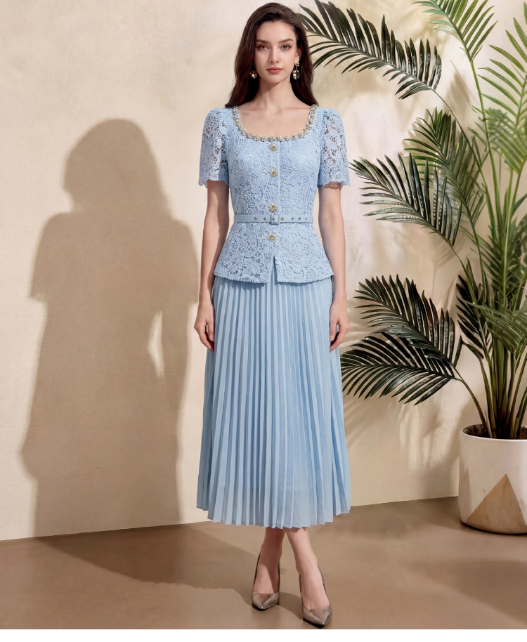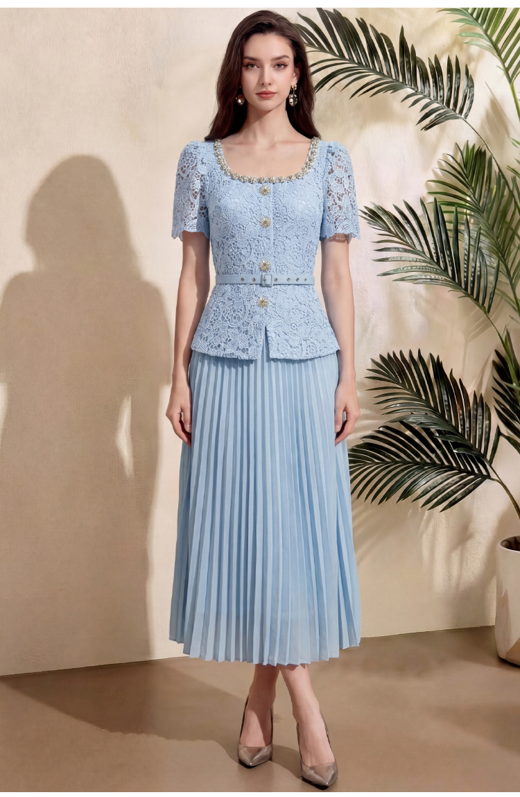 RY4113# 实拍法式小香风修身镶钻大圆领短袖蕾丝拼接中长百褶连衣裙配腰带