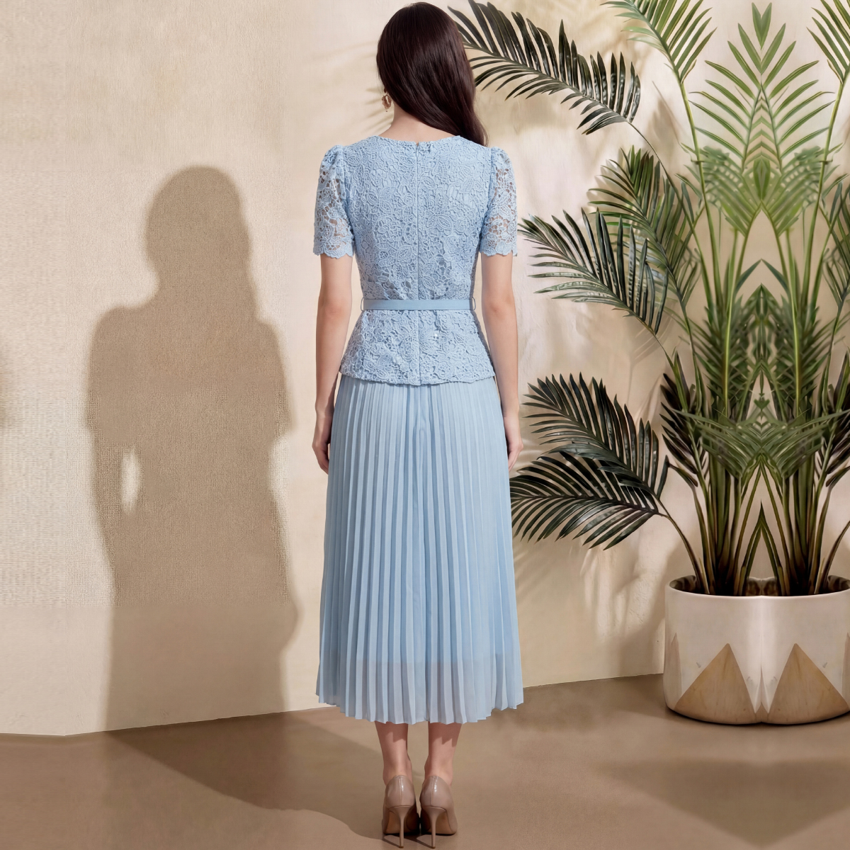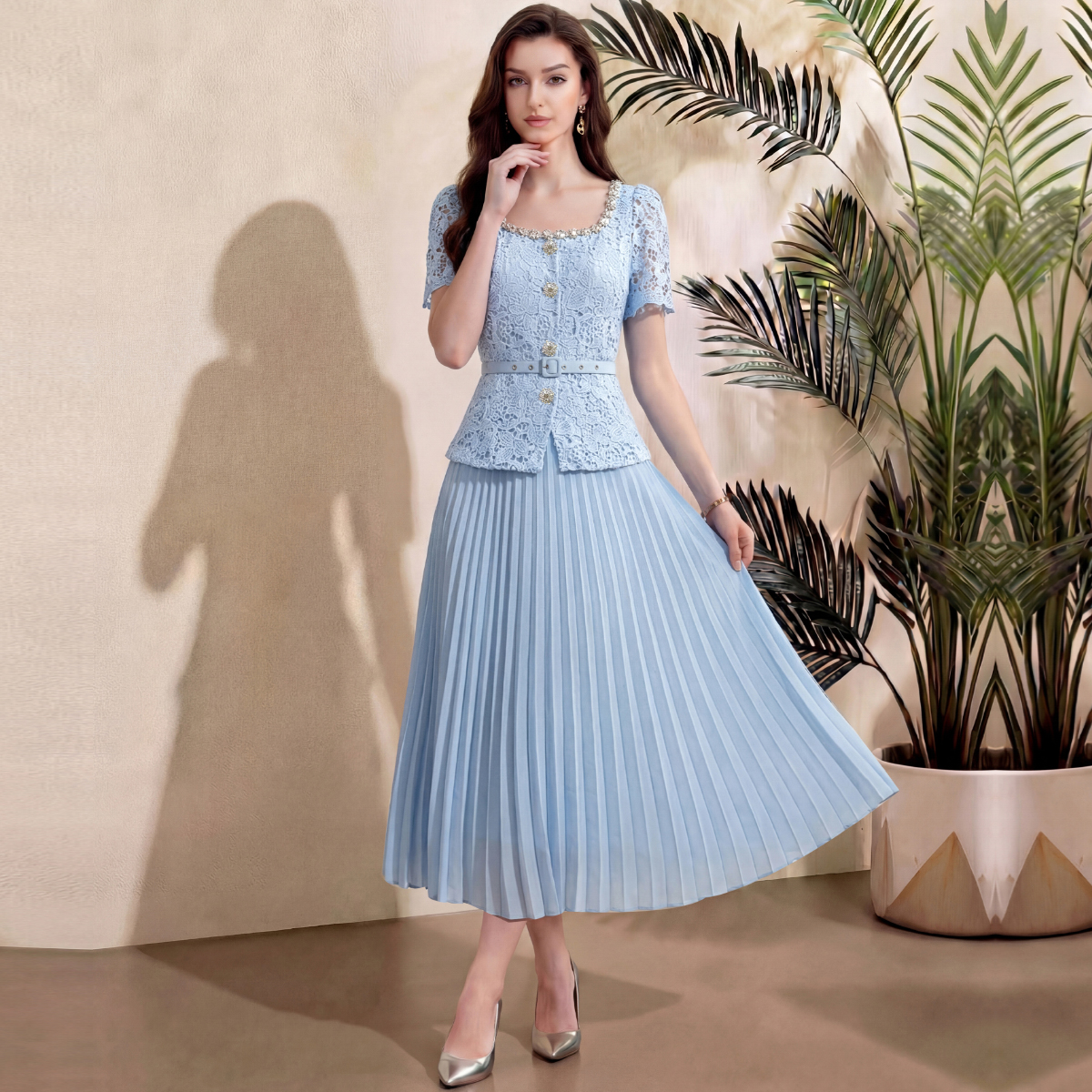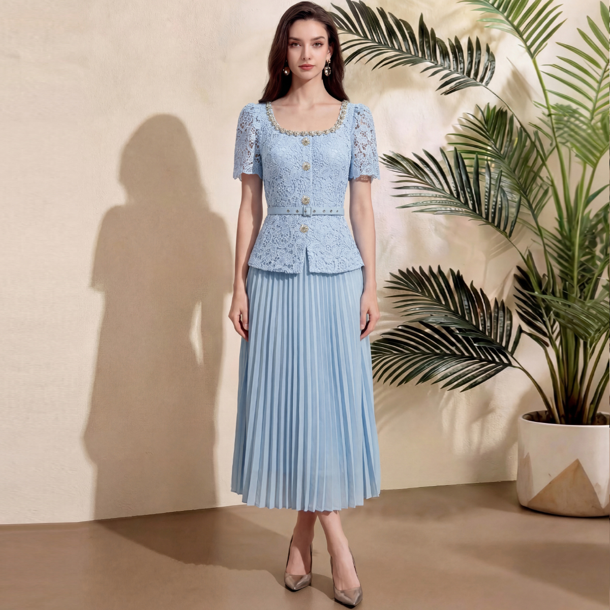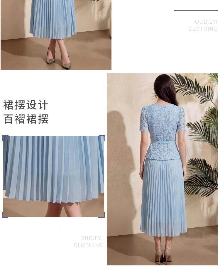 RY4113# 实拍法式小香风修身镶钻大圆领短袖蕾丝拼接中长百褶连衣裙配腰带