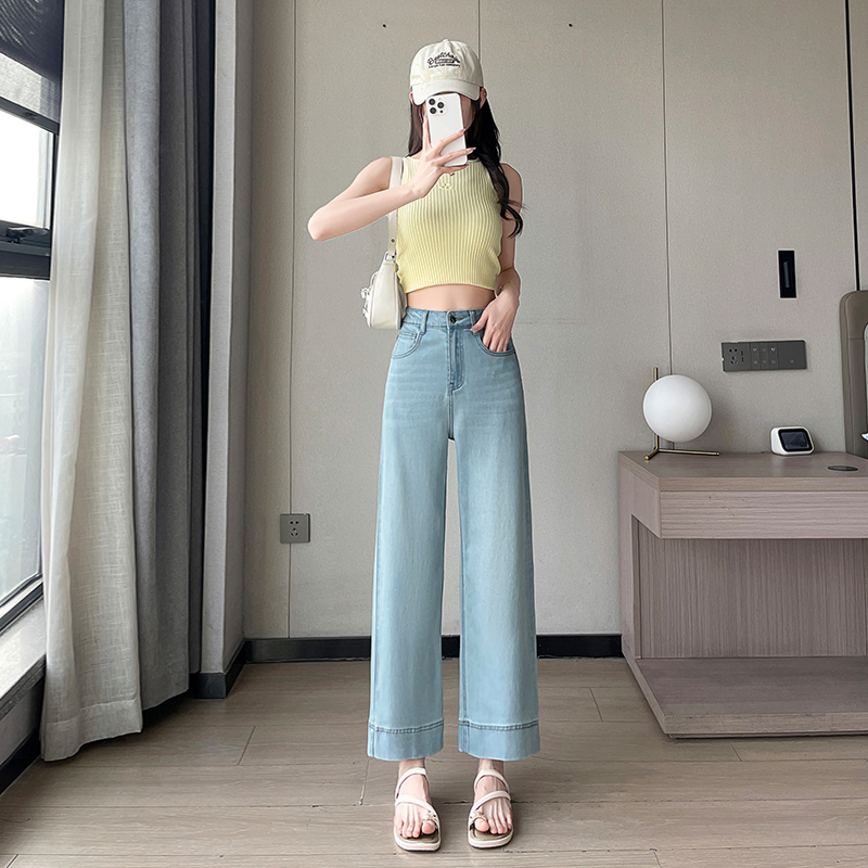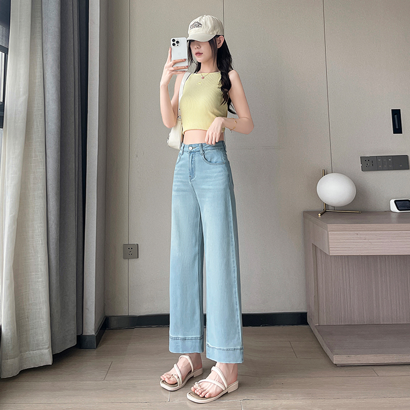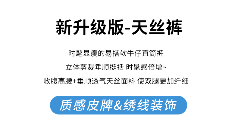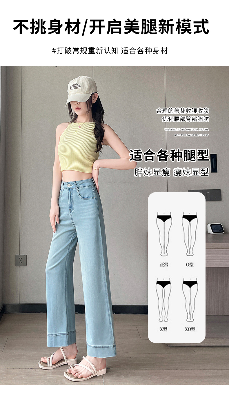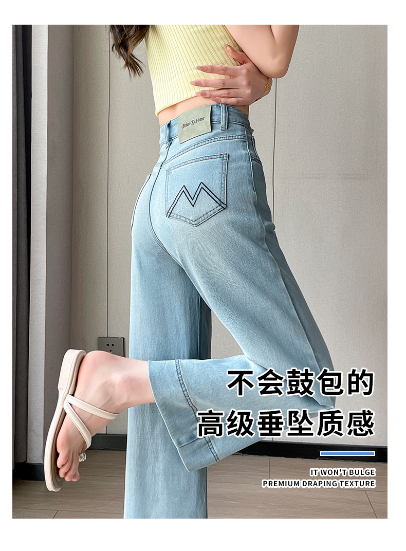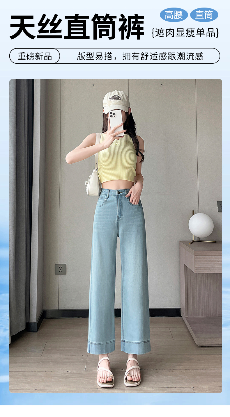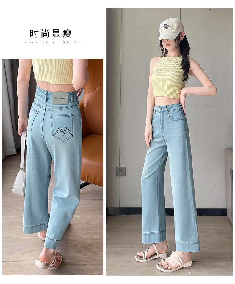 RY4163# 天丝阔腿牛仔裤女2026夏薄款高腰弹力小个子八九分冰丝刺绣直筒裤