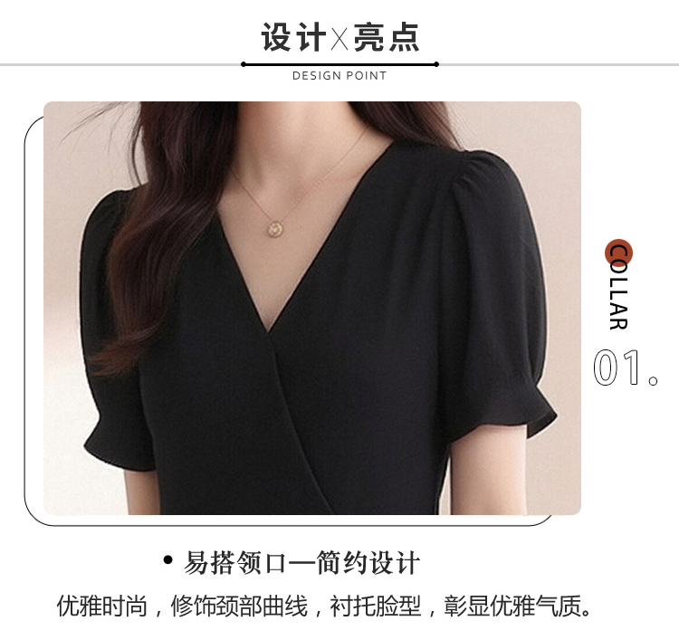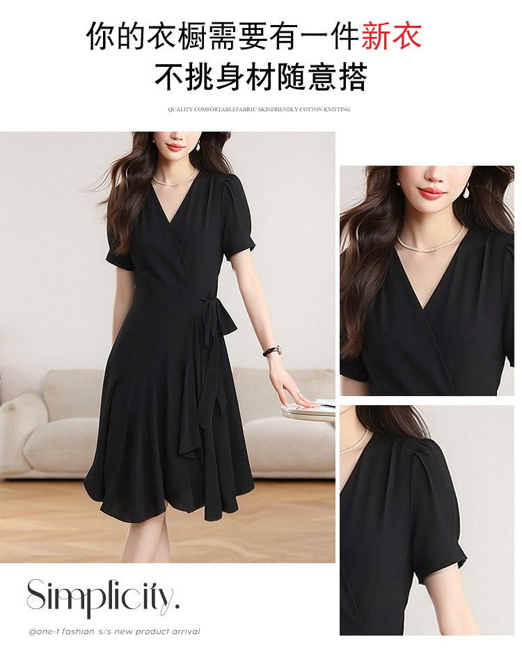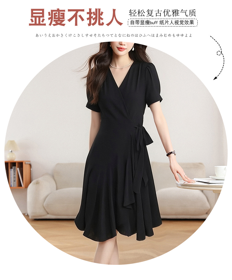 RY4217# 实拍 2026夏季新款连衣裙V领设计感收腰显瘦气质短袖中长款连衣裙