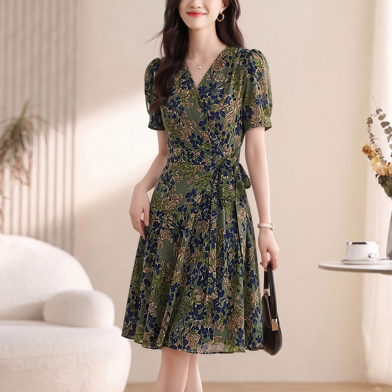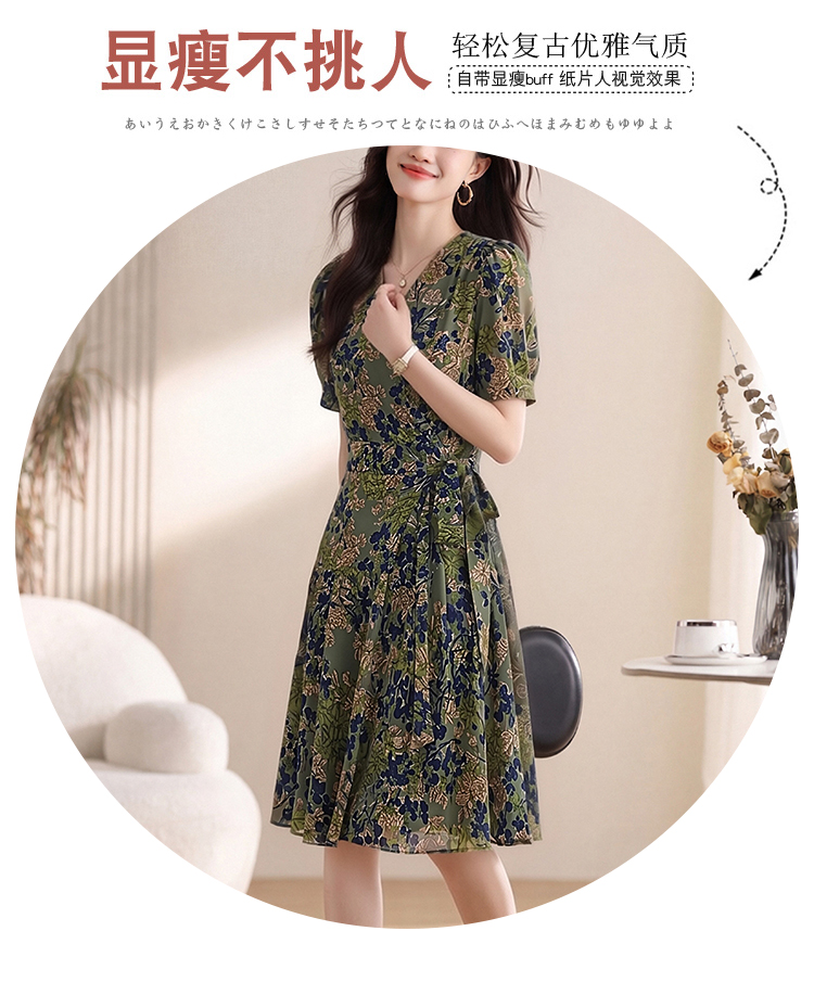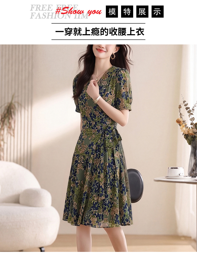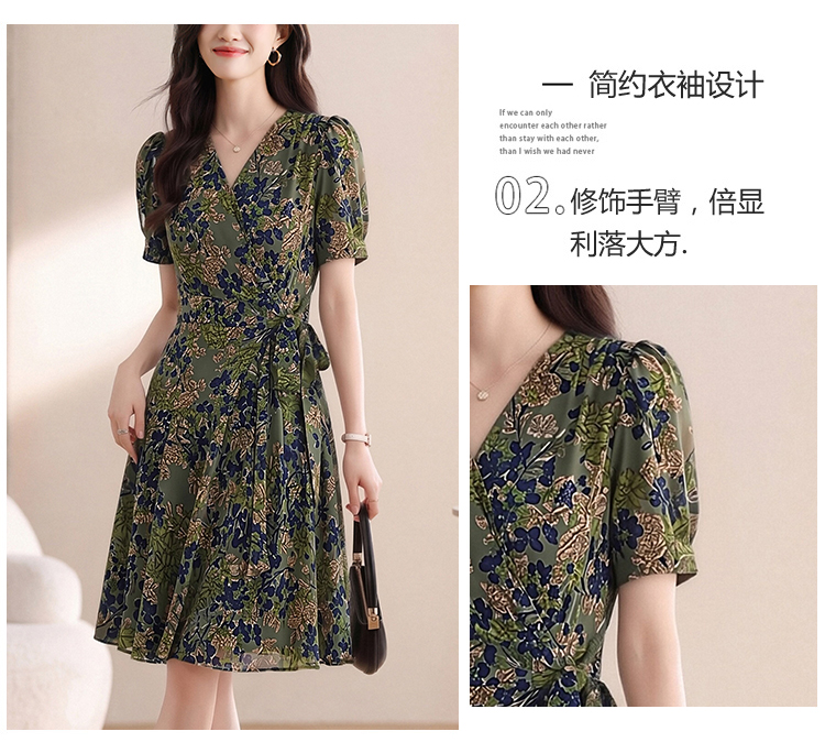 RY4220# 实拍 2026夏季碎花连衣裙时尚绑带气质减龄女神范V领中长裙
