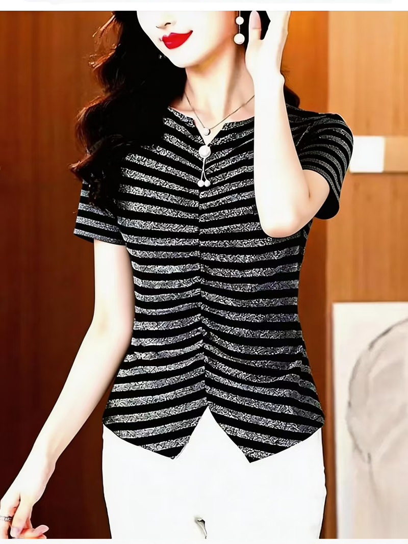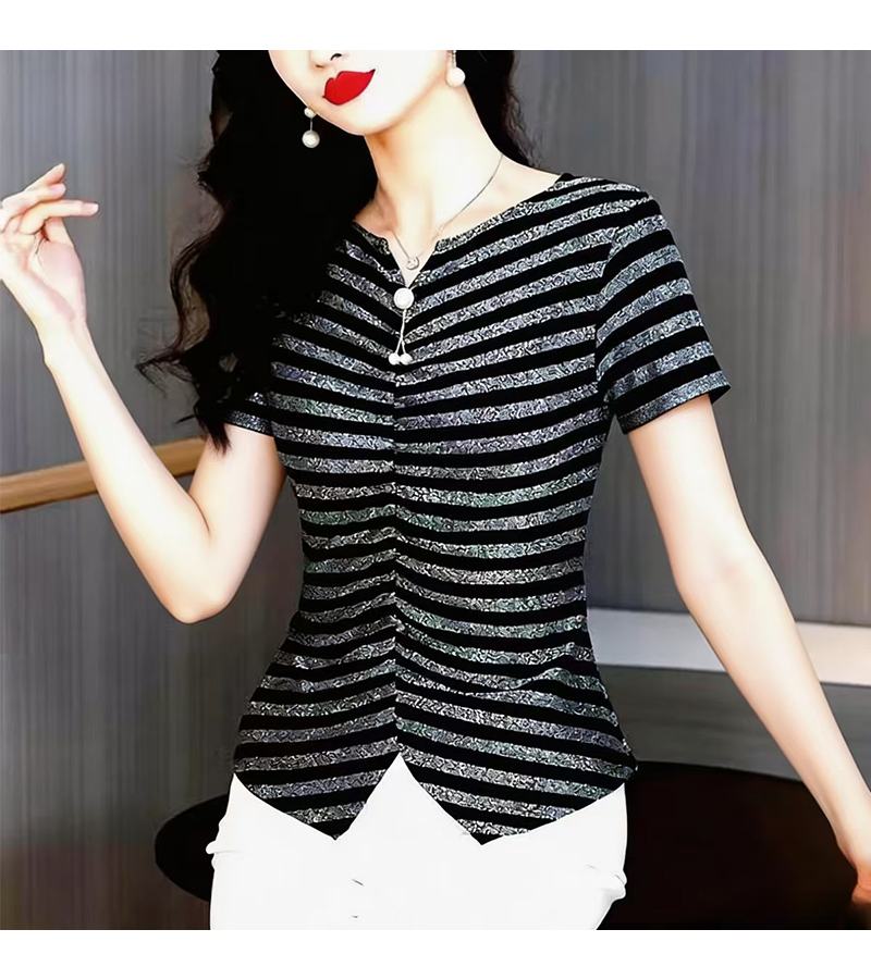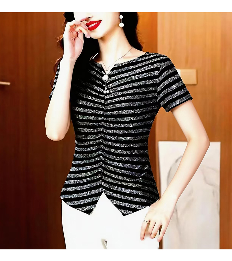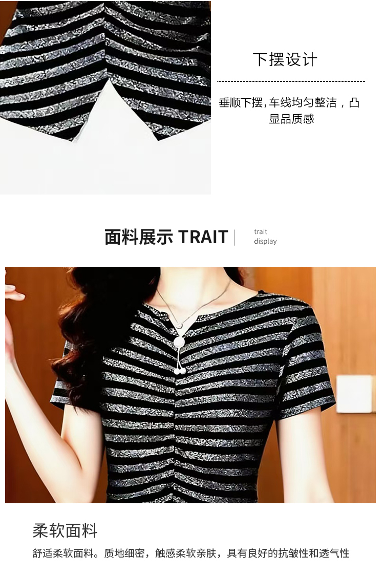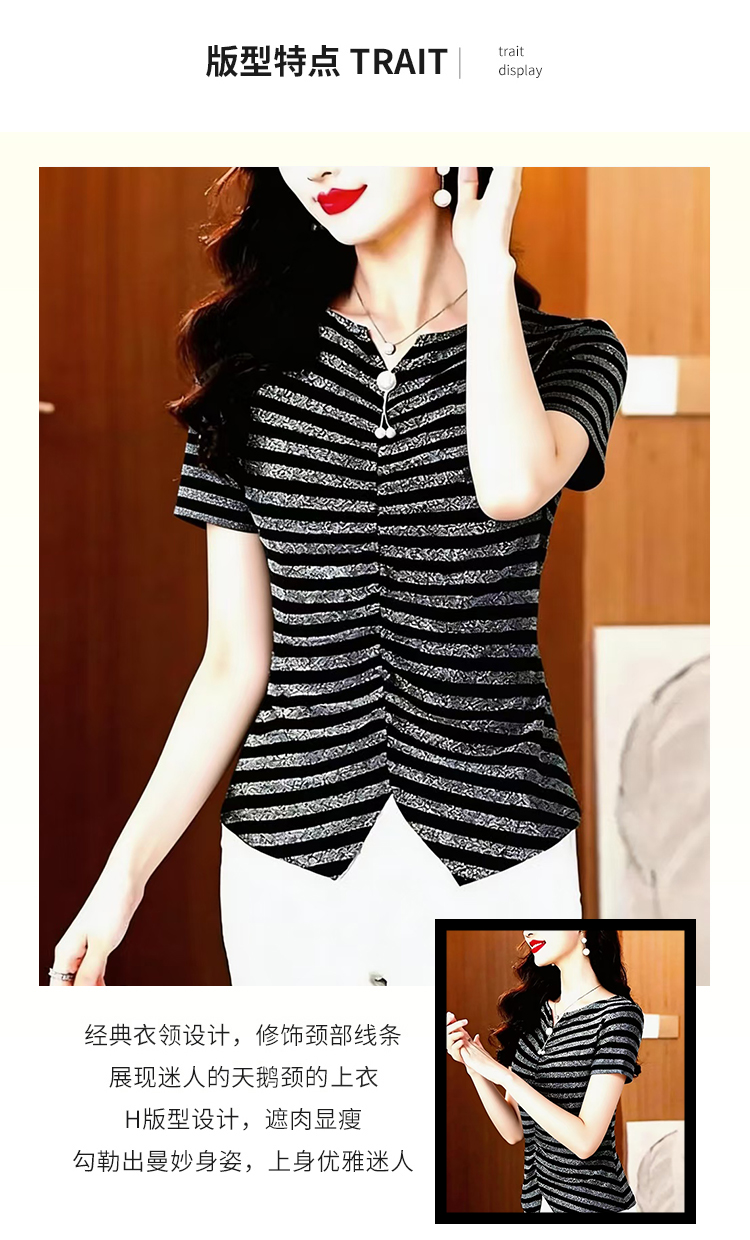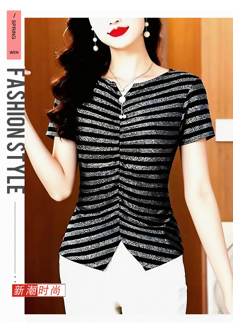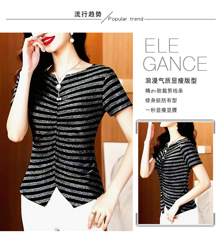 RY4243# 条纹高弹力遮肚子显瘦冰凉感短袖气质小衫