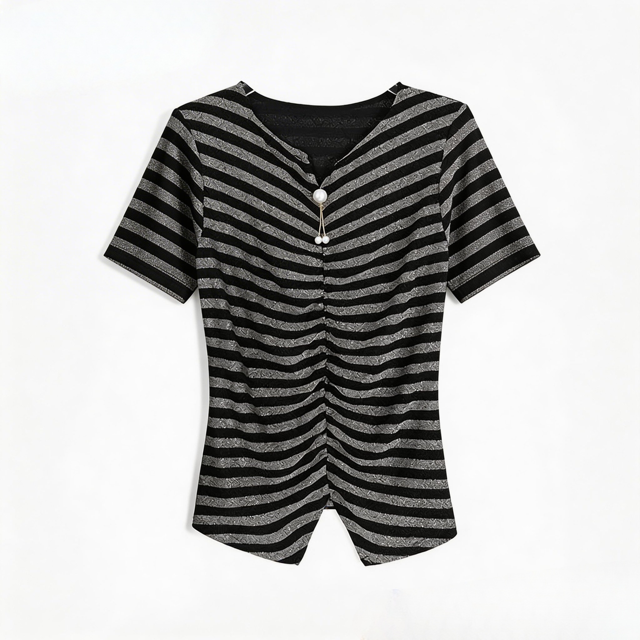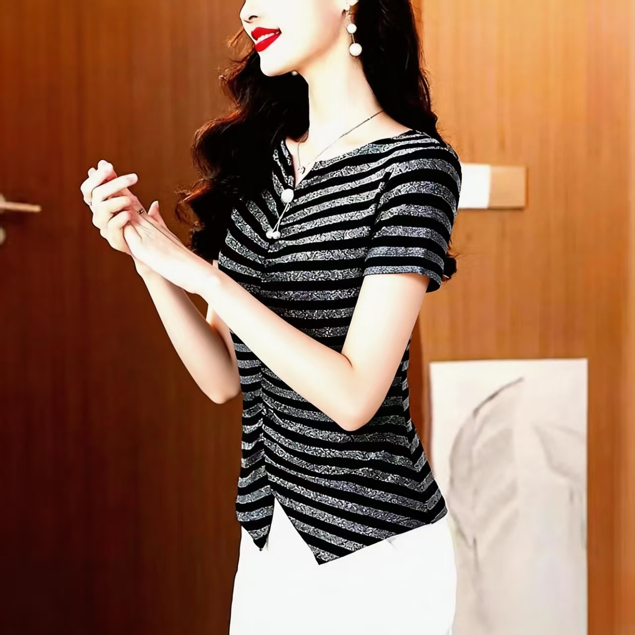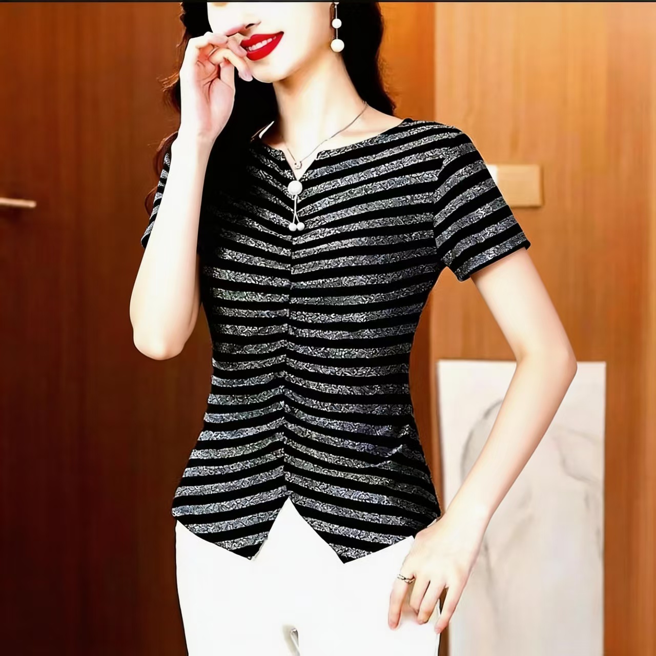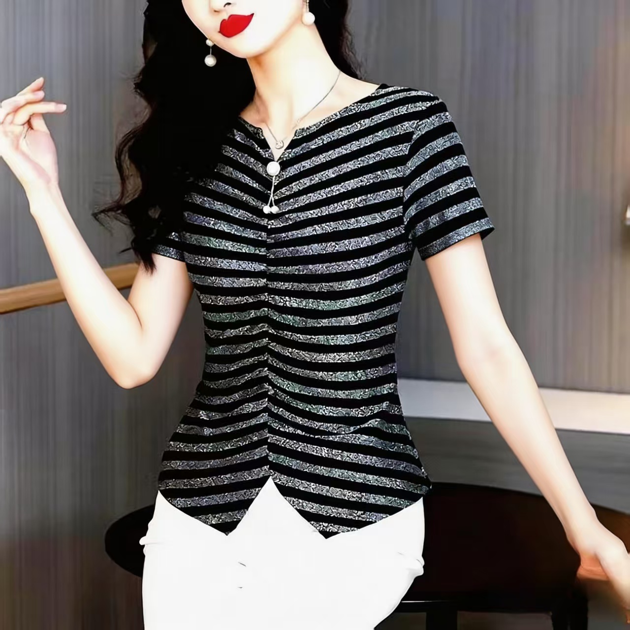 RY4243# 条纹高弹力遮肚子显瘦冰凉感短袖气质小衫