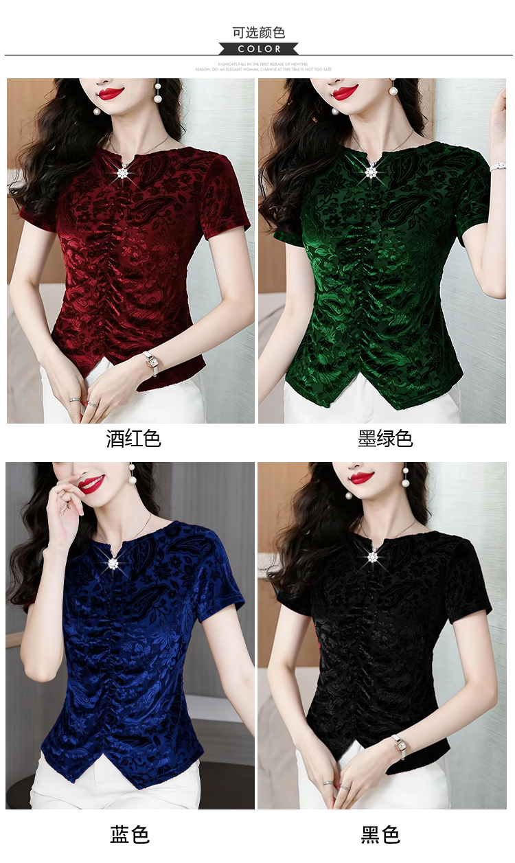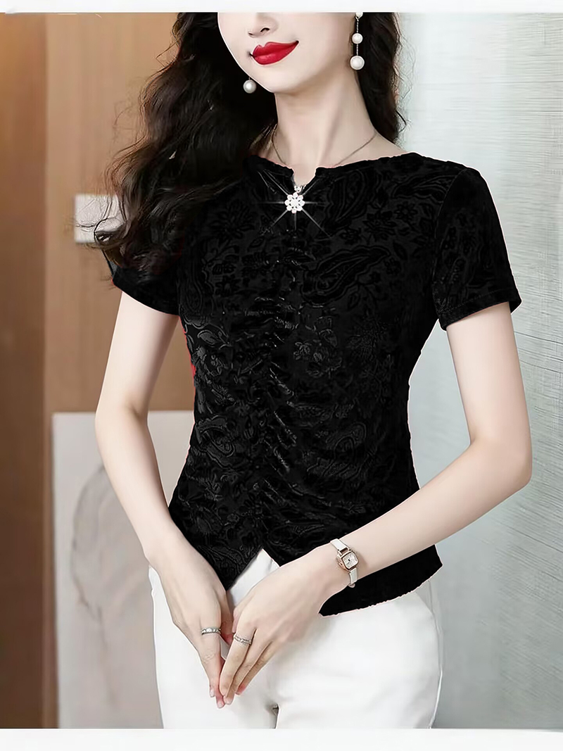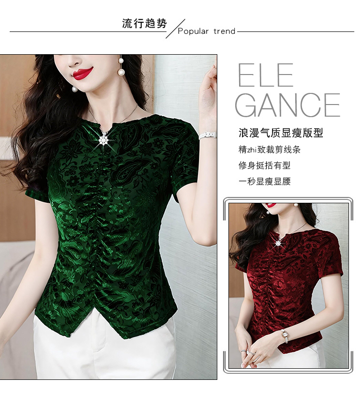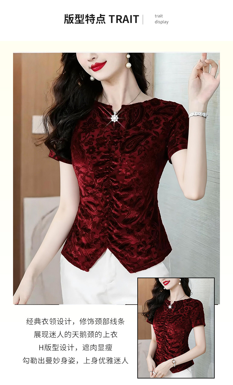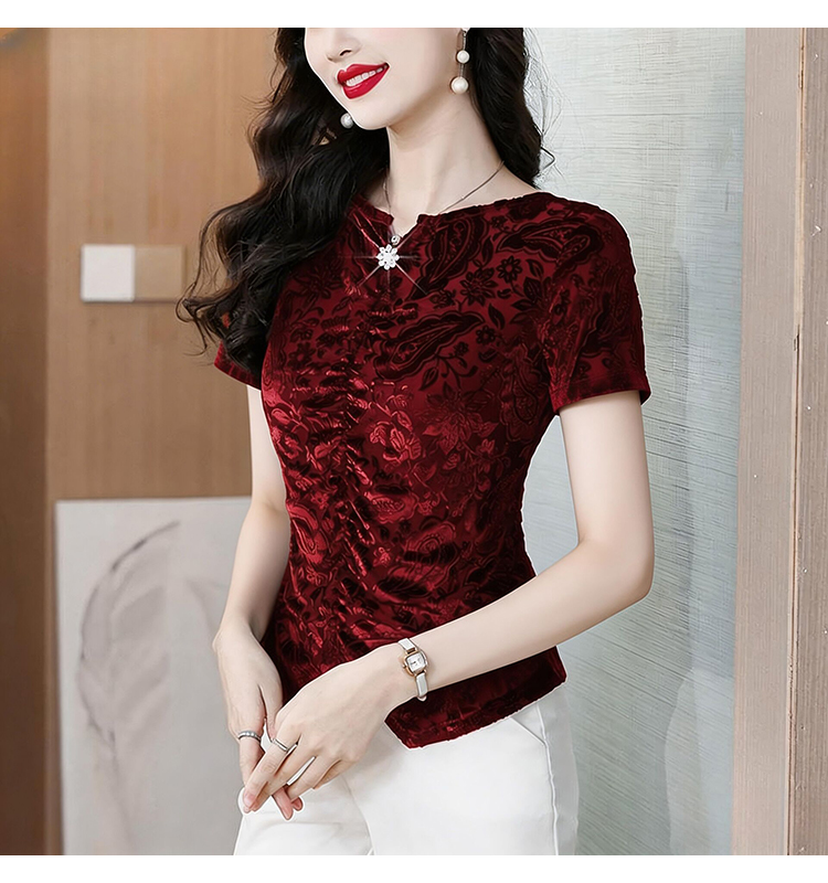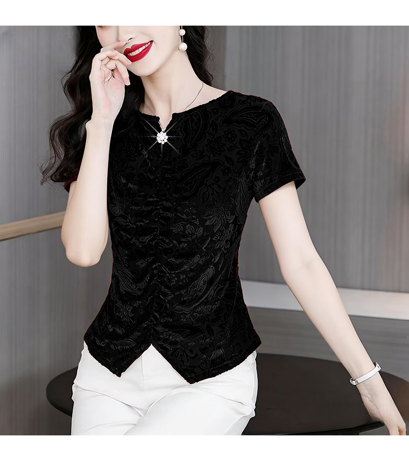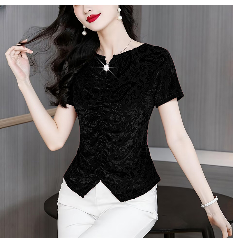 RY4244# 蕾丝v领短袖设计感衬衫气质小衫遮肚子显瘦衬衣洋气提花高级感