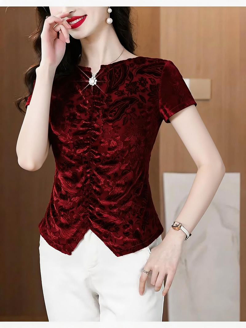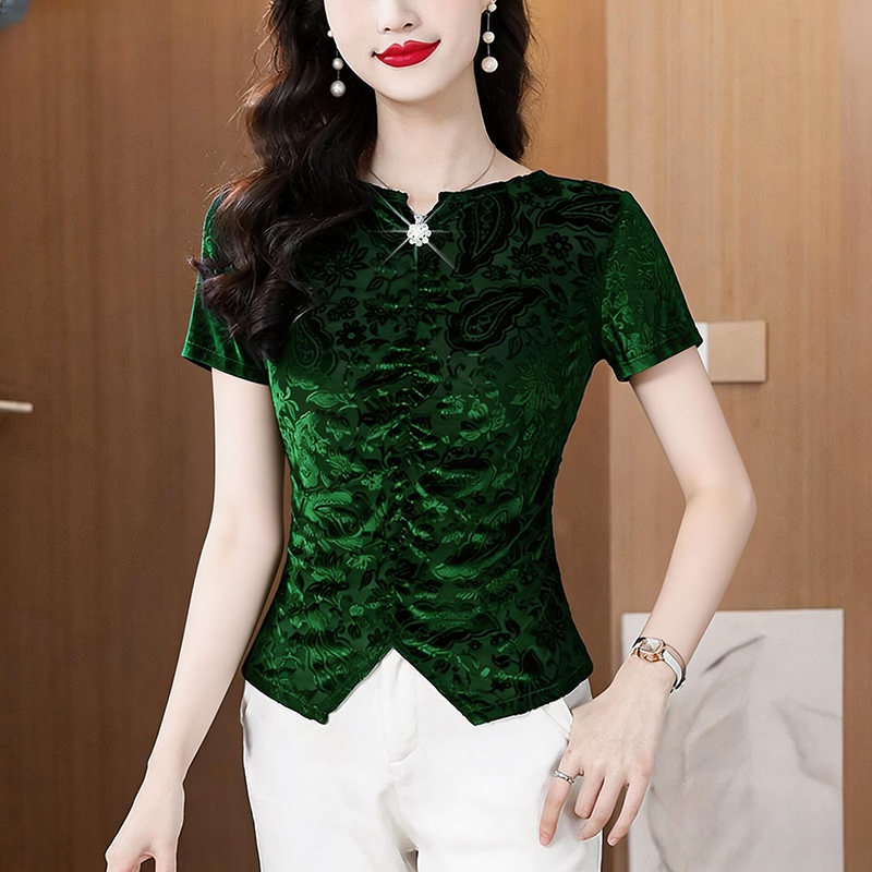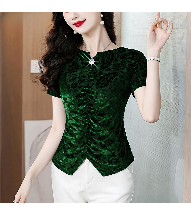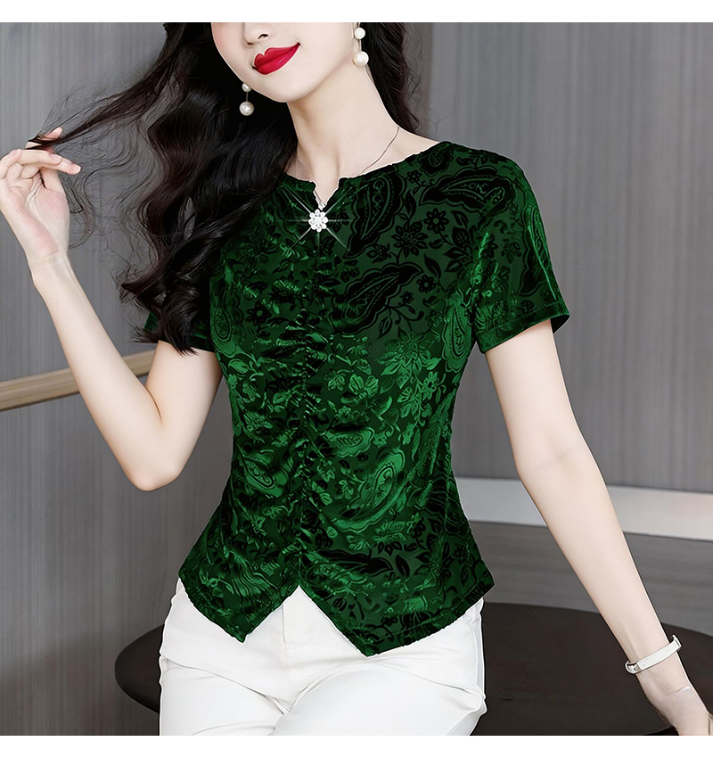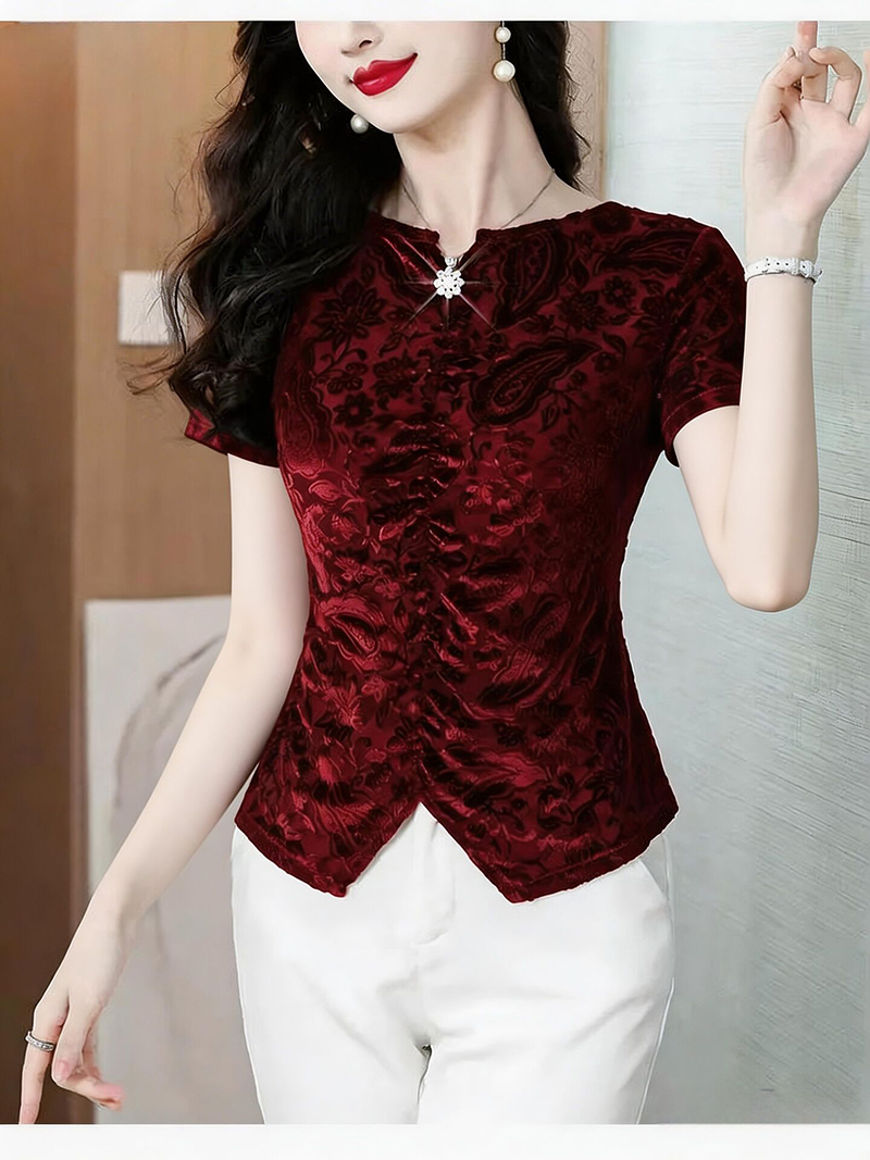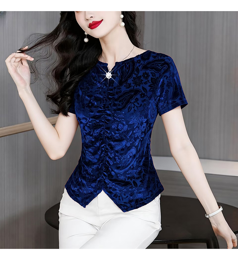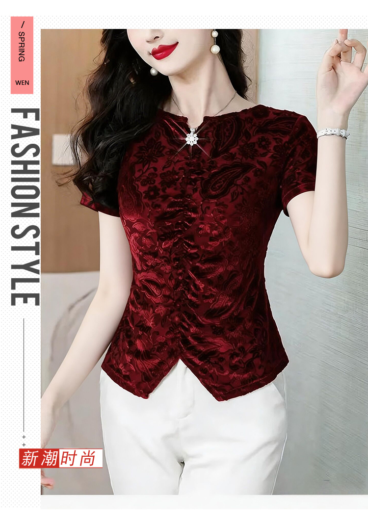 RY4244# 蕾丝v领短袖设计感衬衫气质小衫遮肚子显瘦衬衣洋气提花高级感