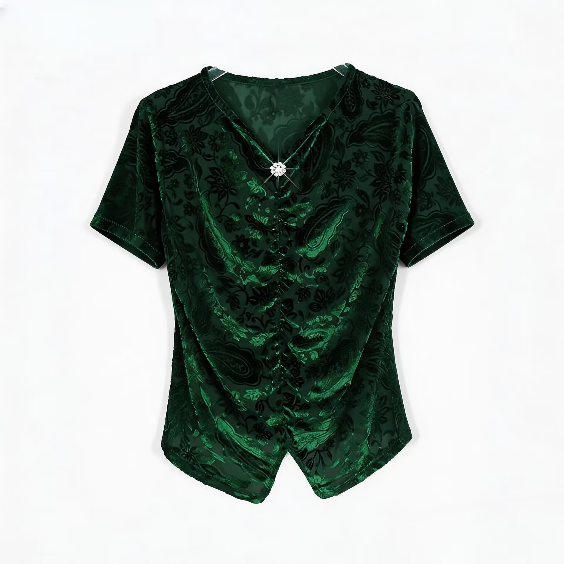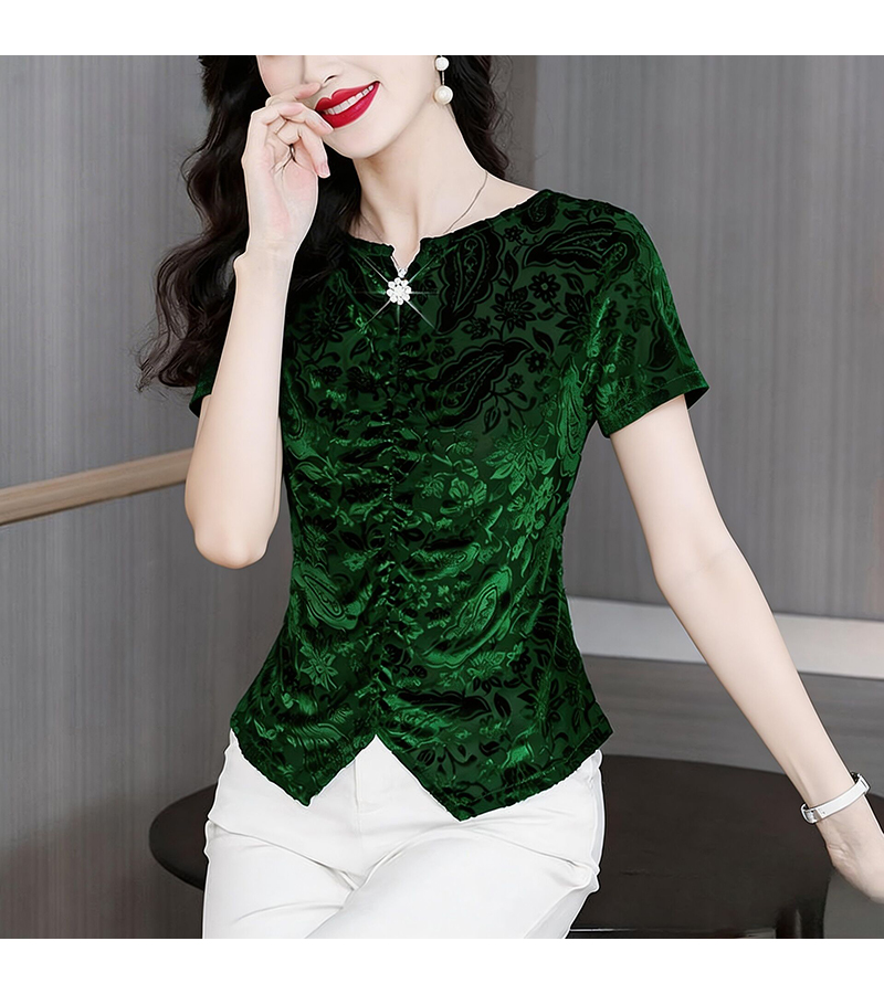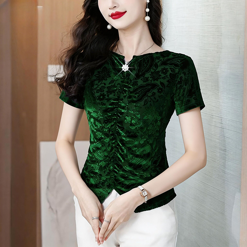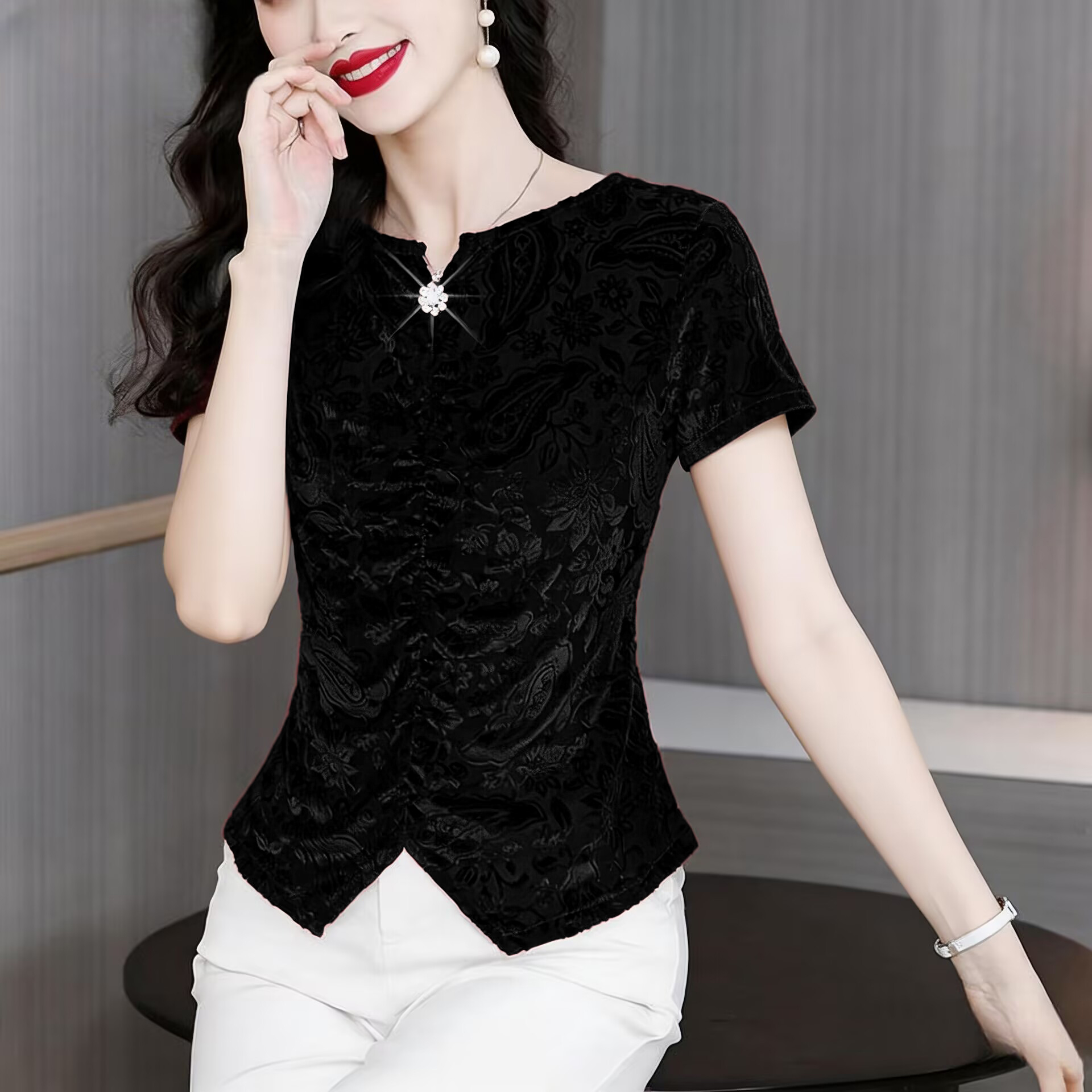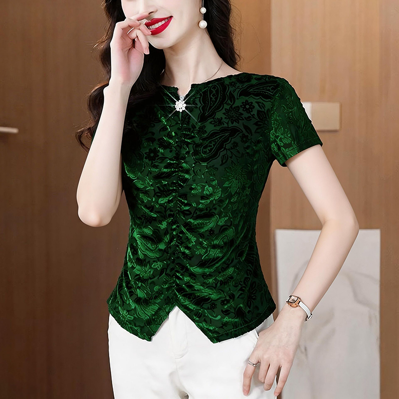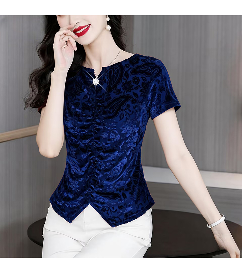 RY4244# 蕾丝v领短袖设计感衬衫气质小衫遮肚子显瘦衬衣洋气提花高级感