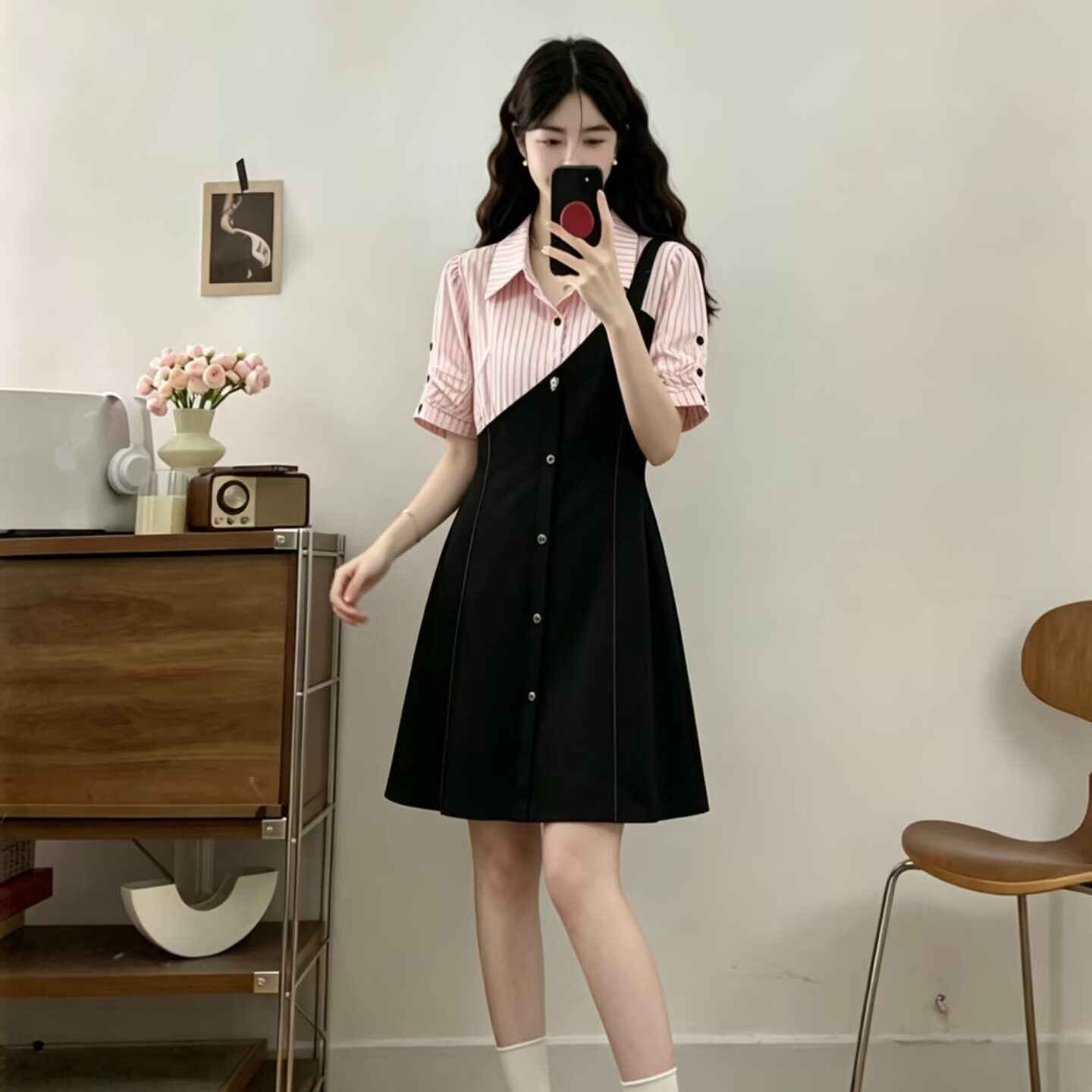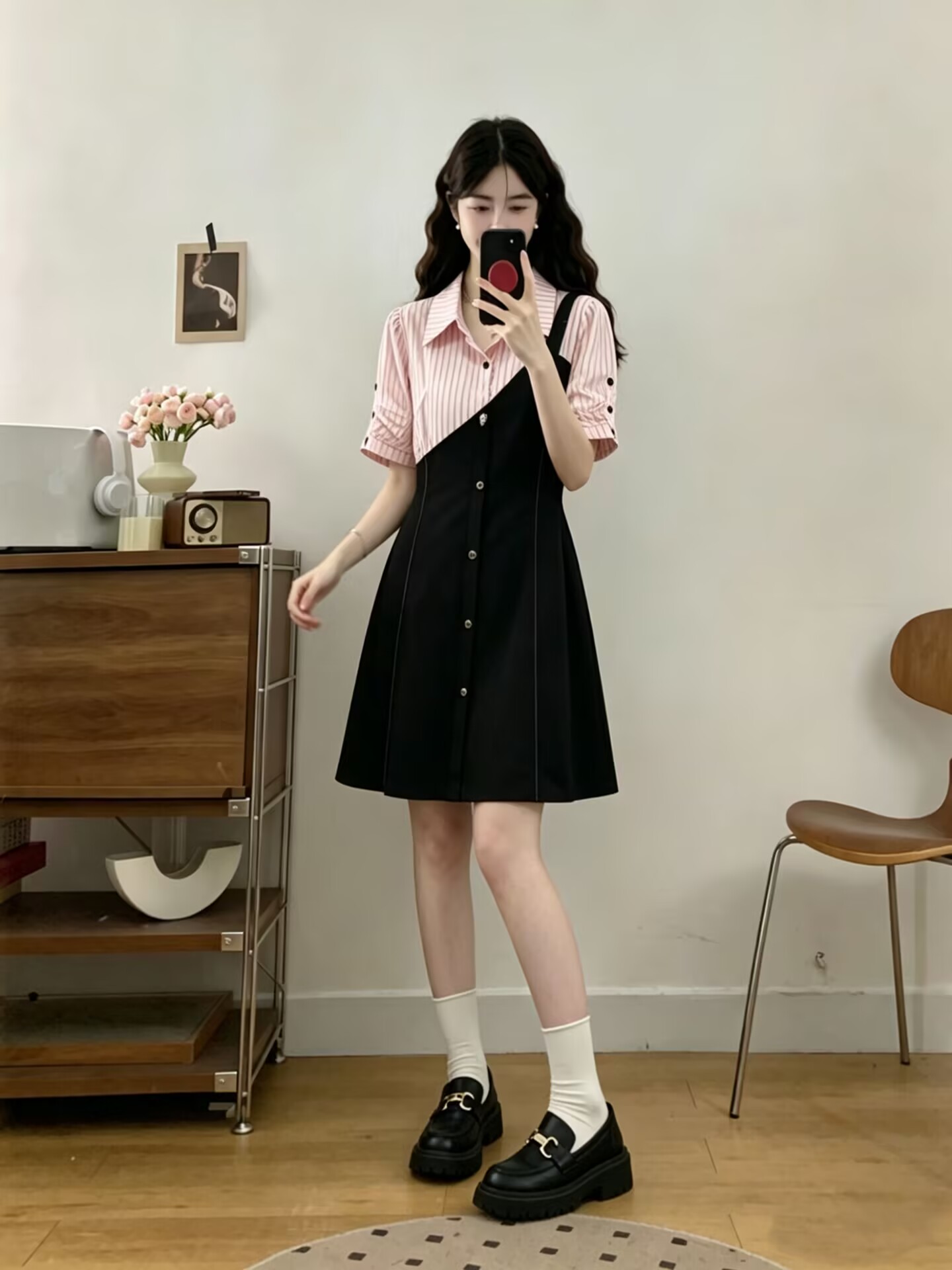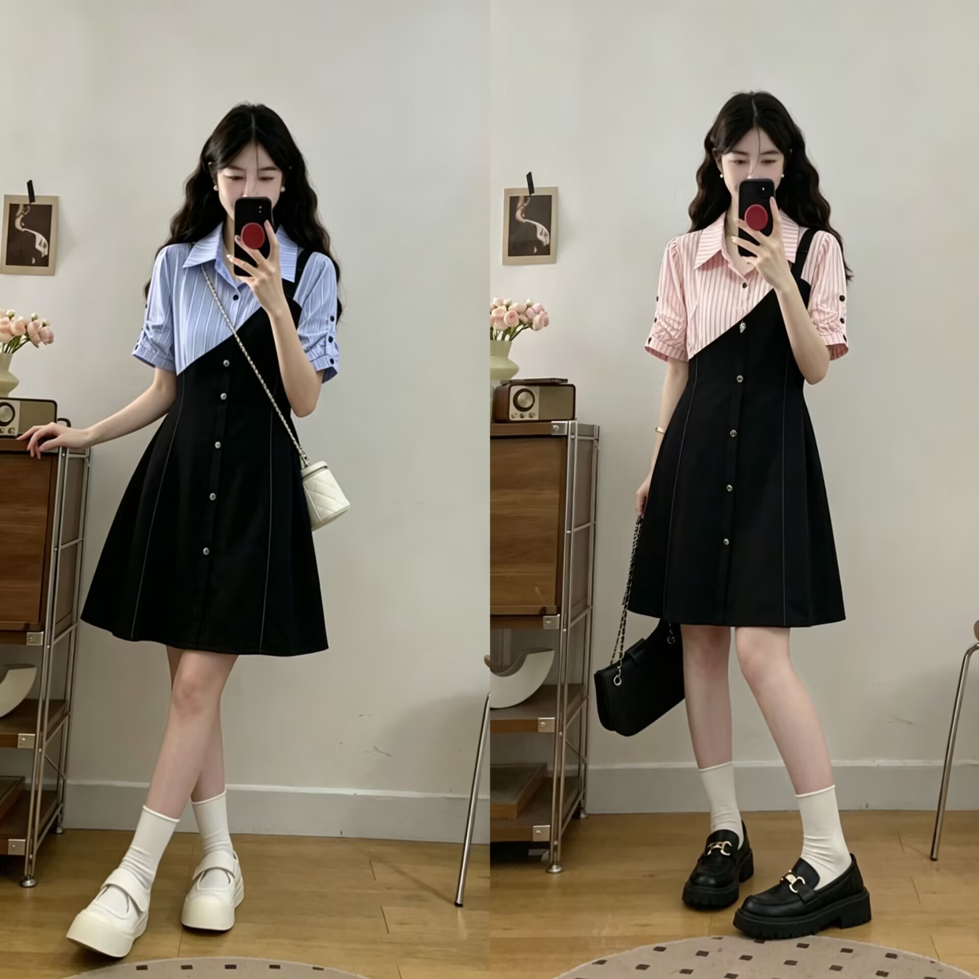 RY4254# 实拍大码女装2026新款韩系温柔风假两件衬衫收腰显瘦气质连衣裙