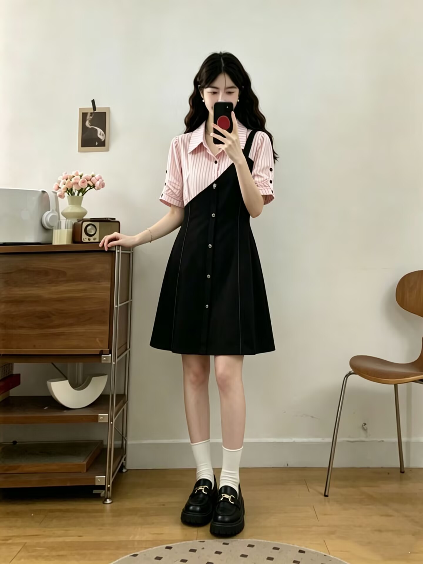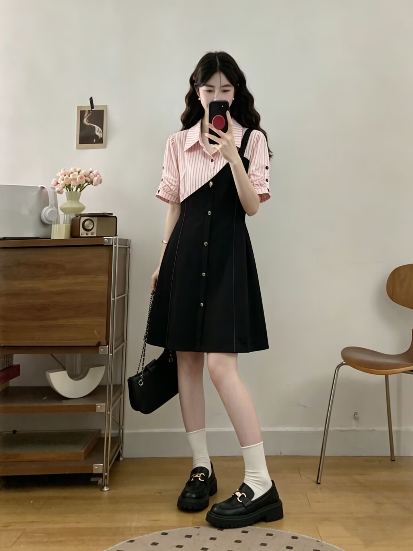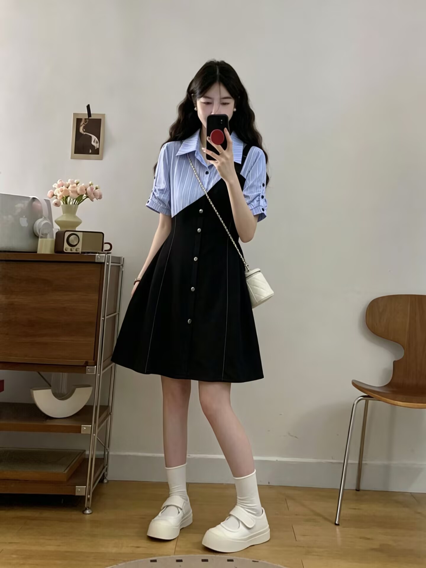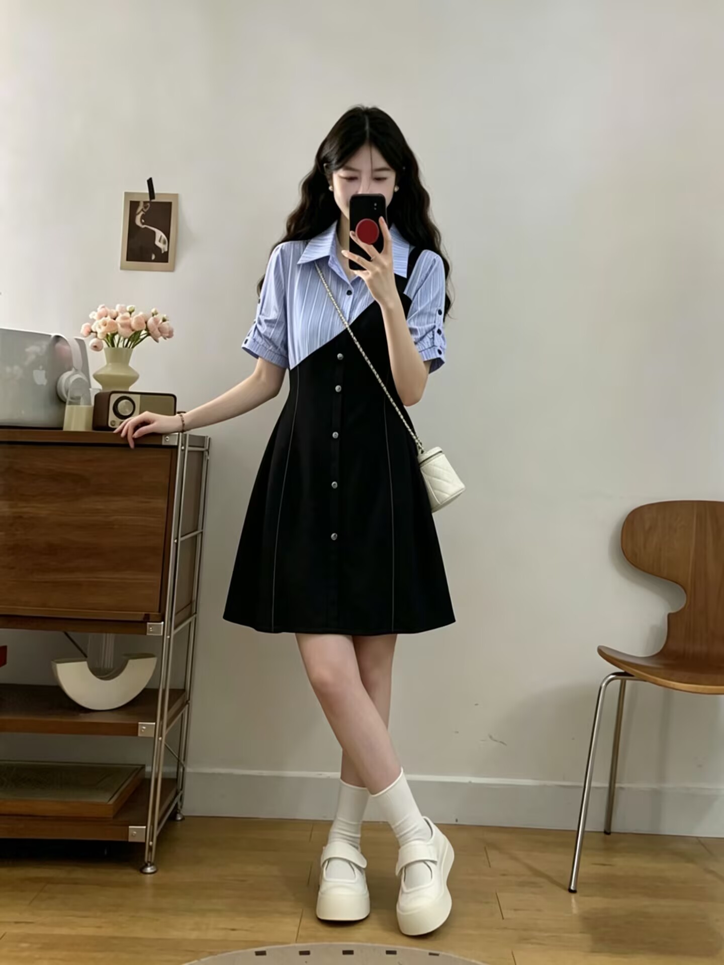 RY4254# 实拍大码女装2026新款韩系温柔风假两件衬衫收腰显瘦气质连衣裙