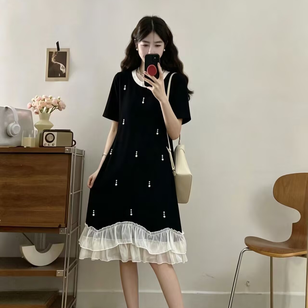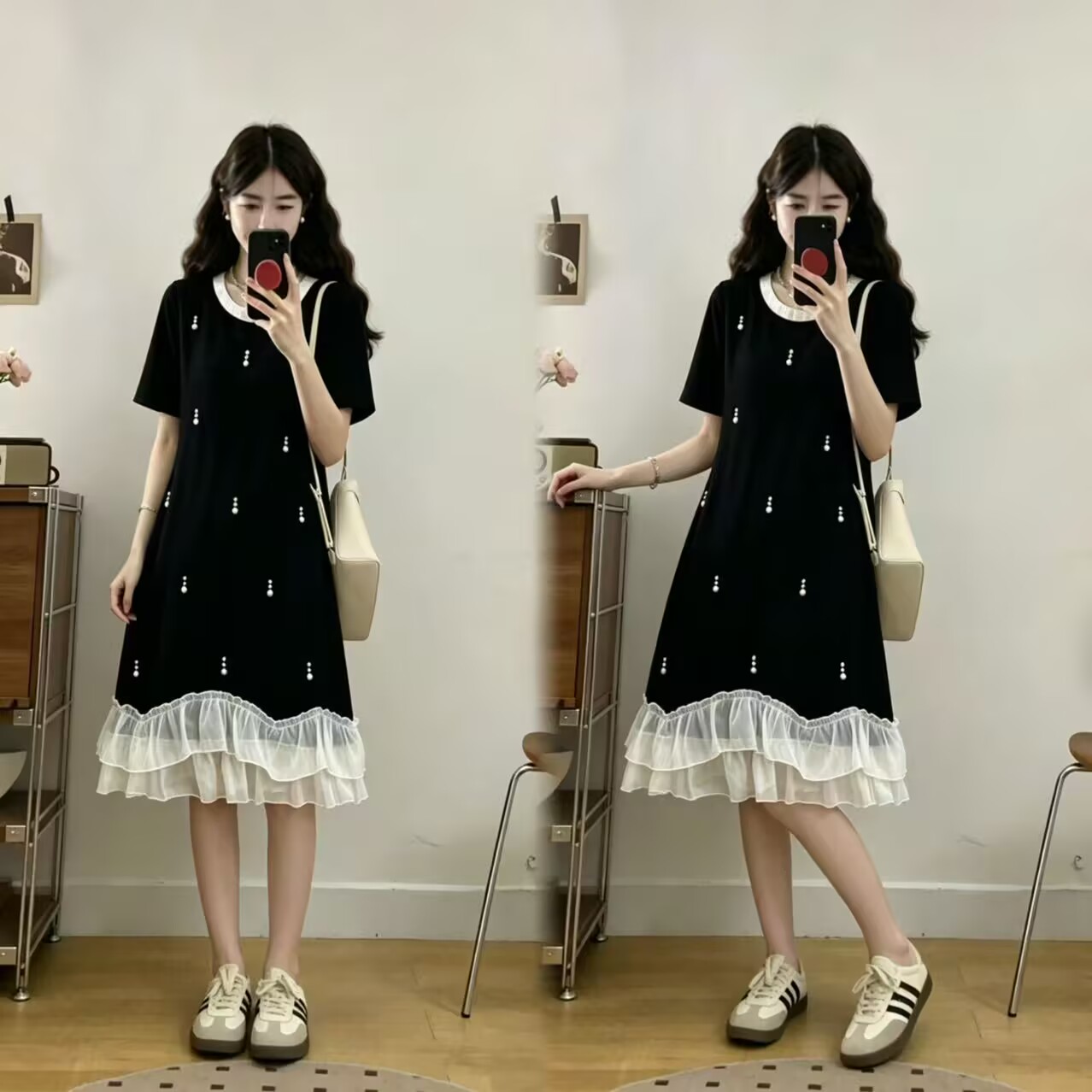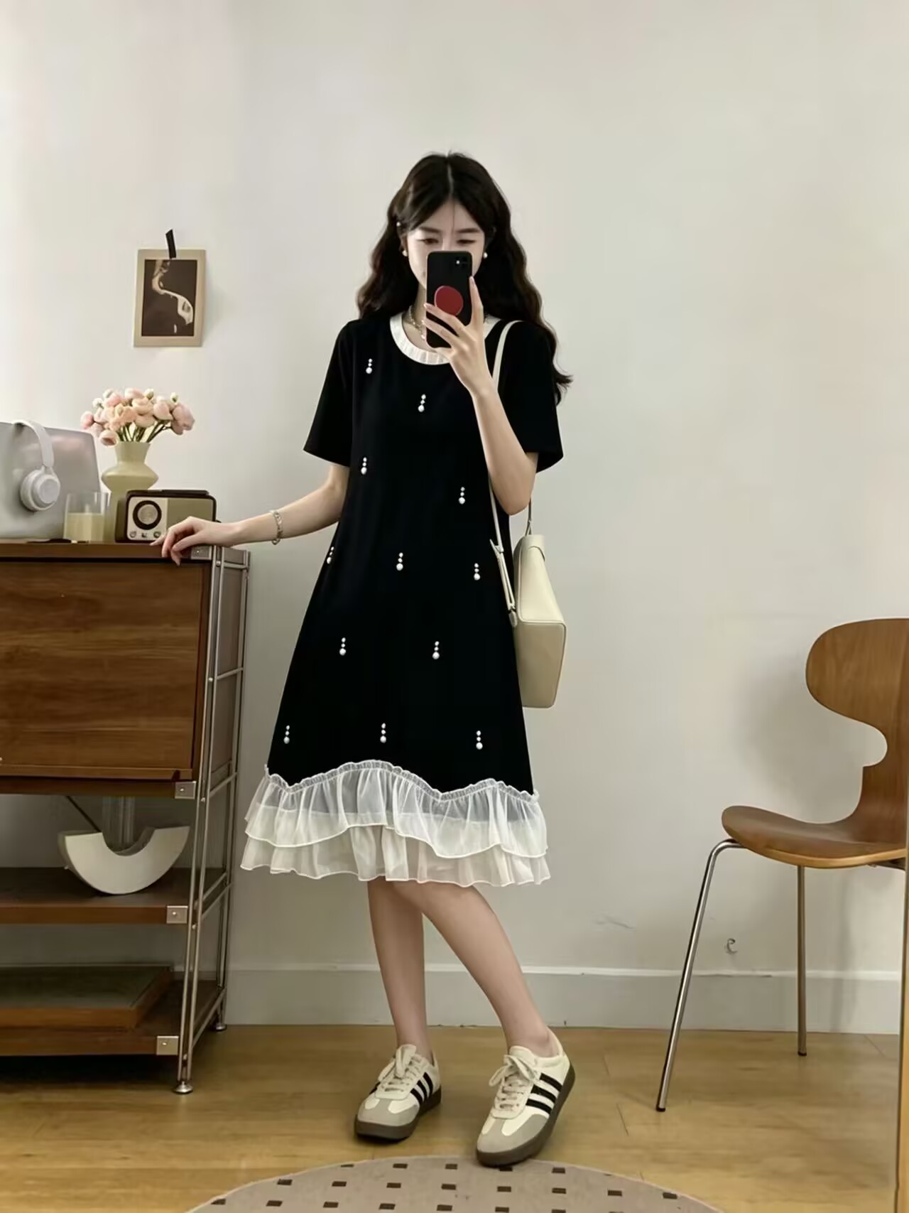 RY4255# 实拍大码女装2026新款韩系温柔风气质钉珠荷叶边宽松显瘦连衣裙