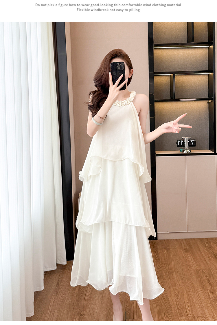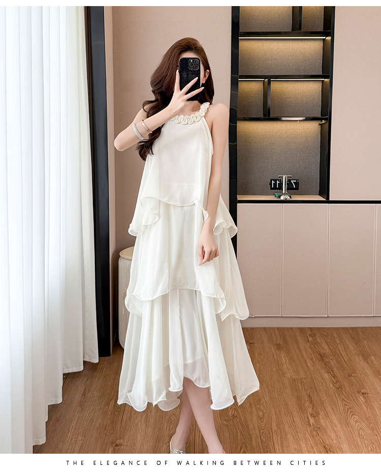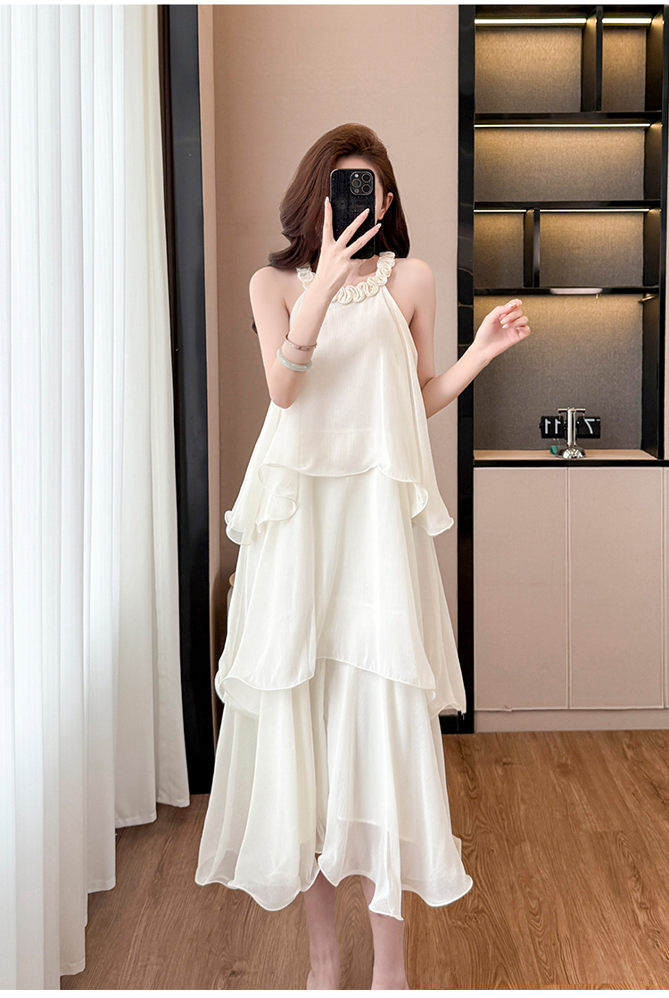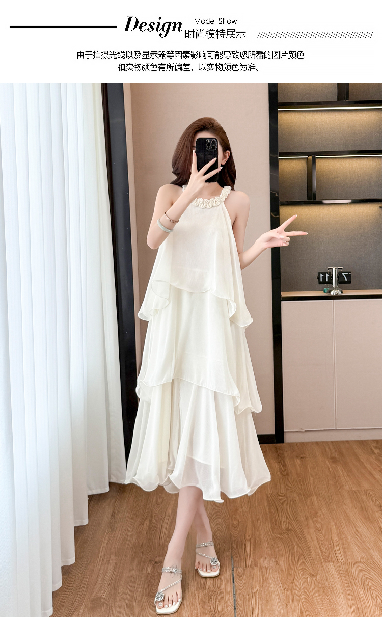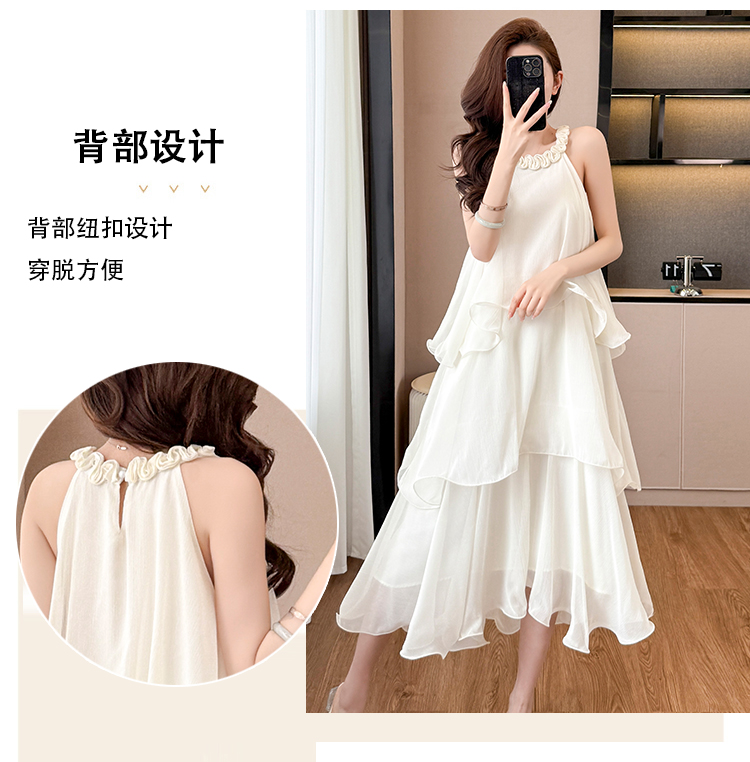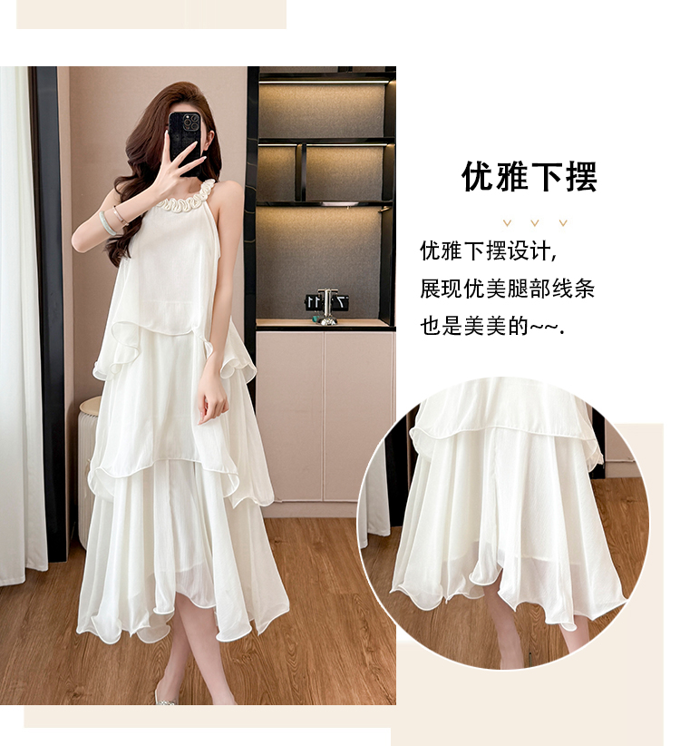 RY4259# 白玉兰春夏法式度假风名媛千金雪纺蛋糕裙气质无袖挂脖连衣裙夏