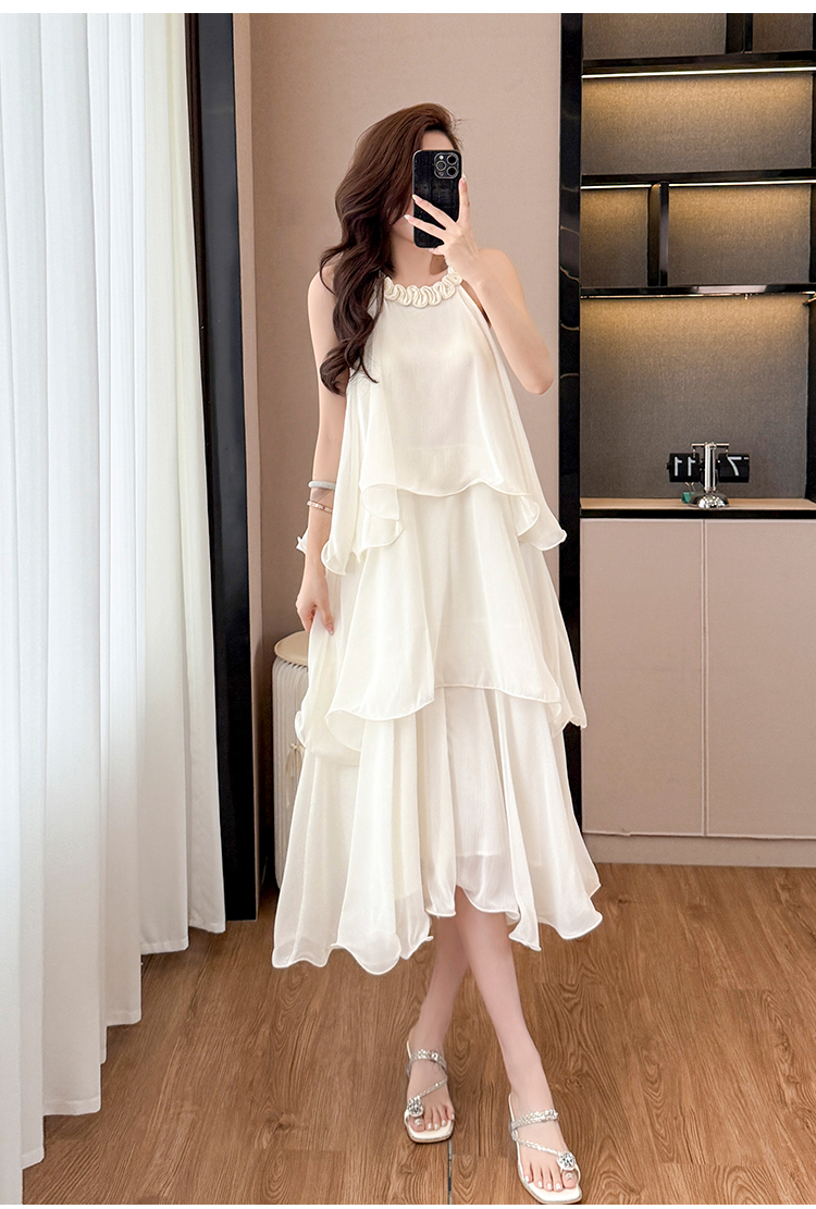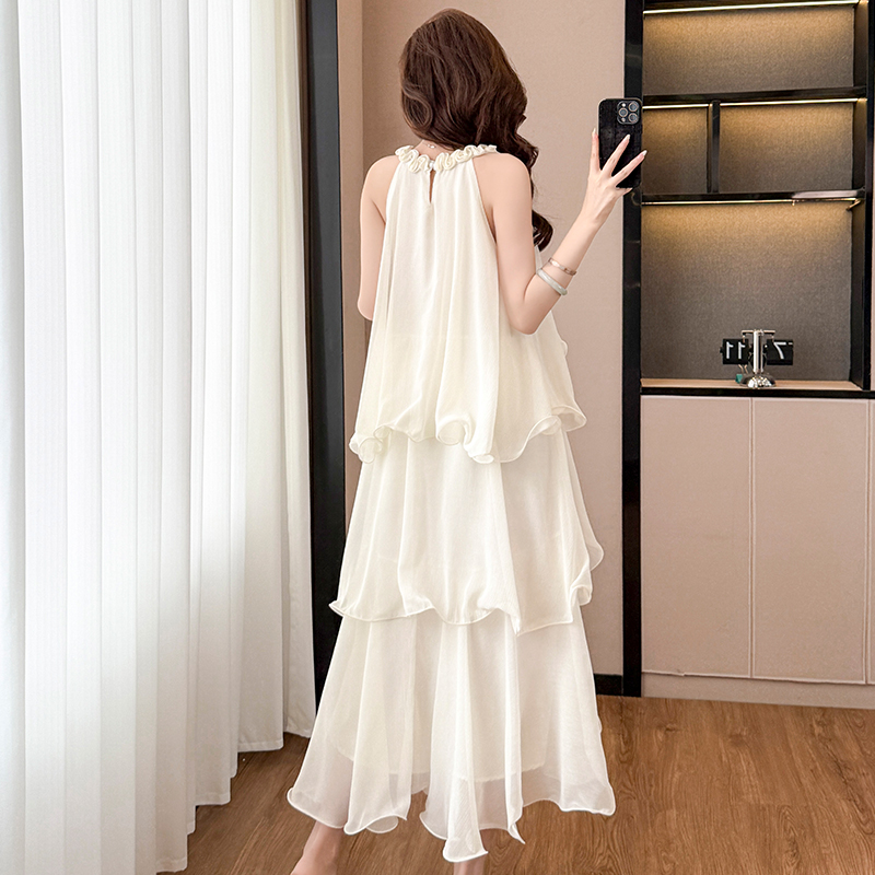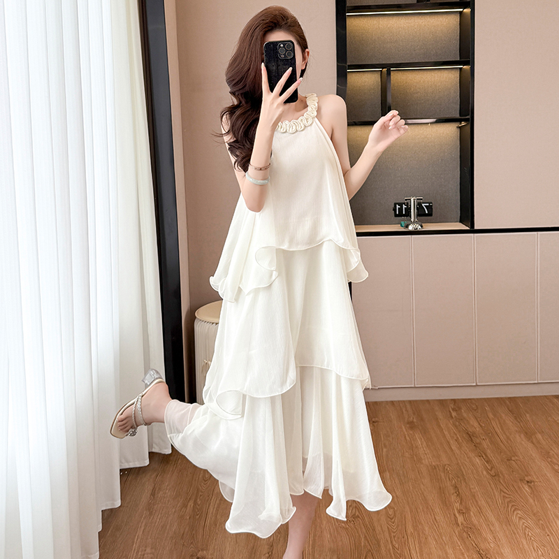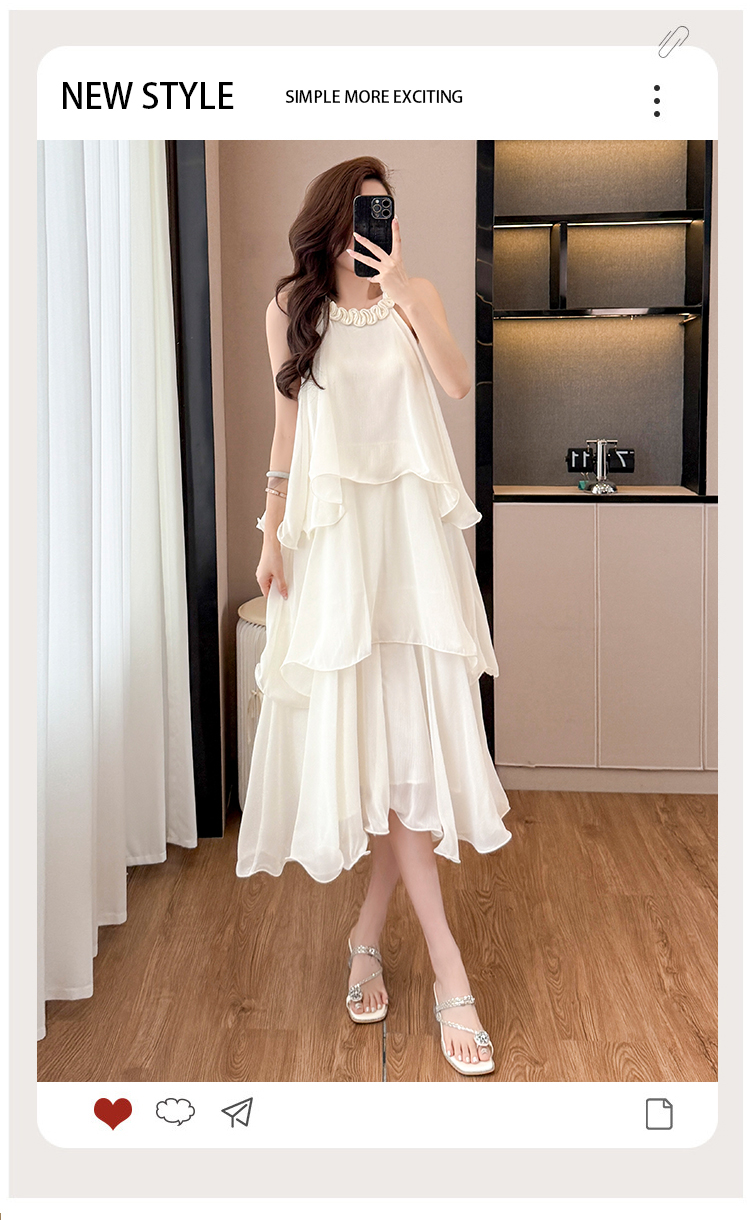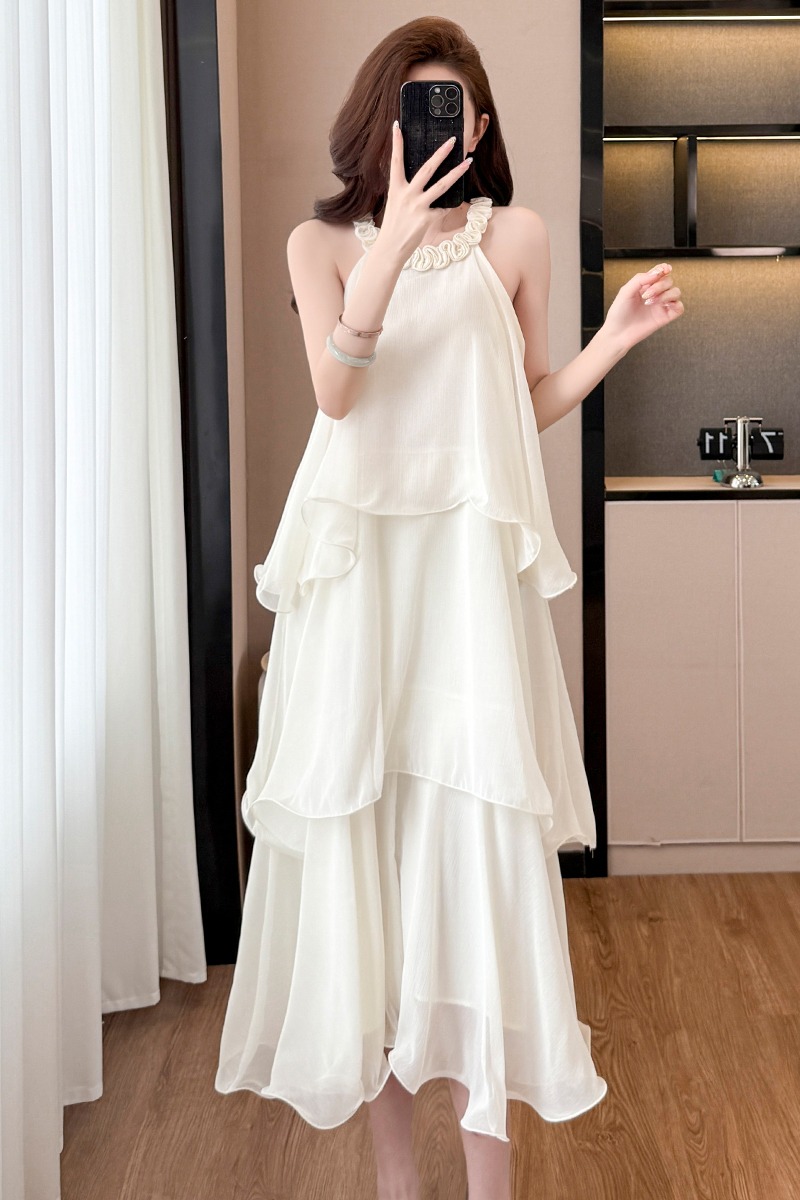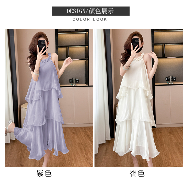 RY4259# 白玉兰春夏法式度假风名媛千金雪纺蛋糕裙气质无袖挂脖连衣裙夏