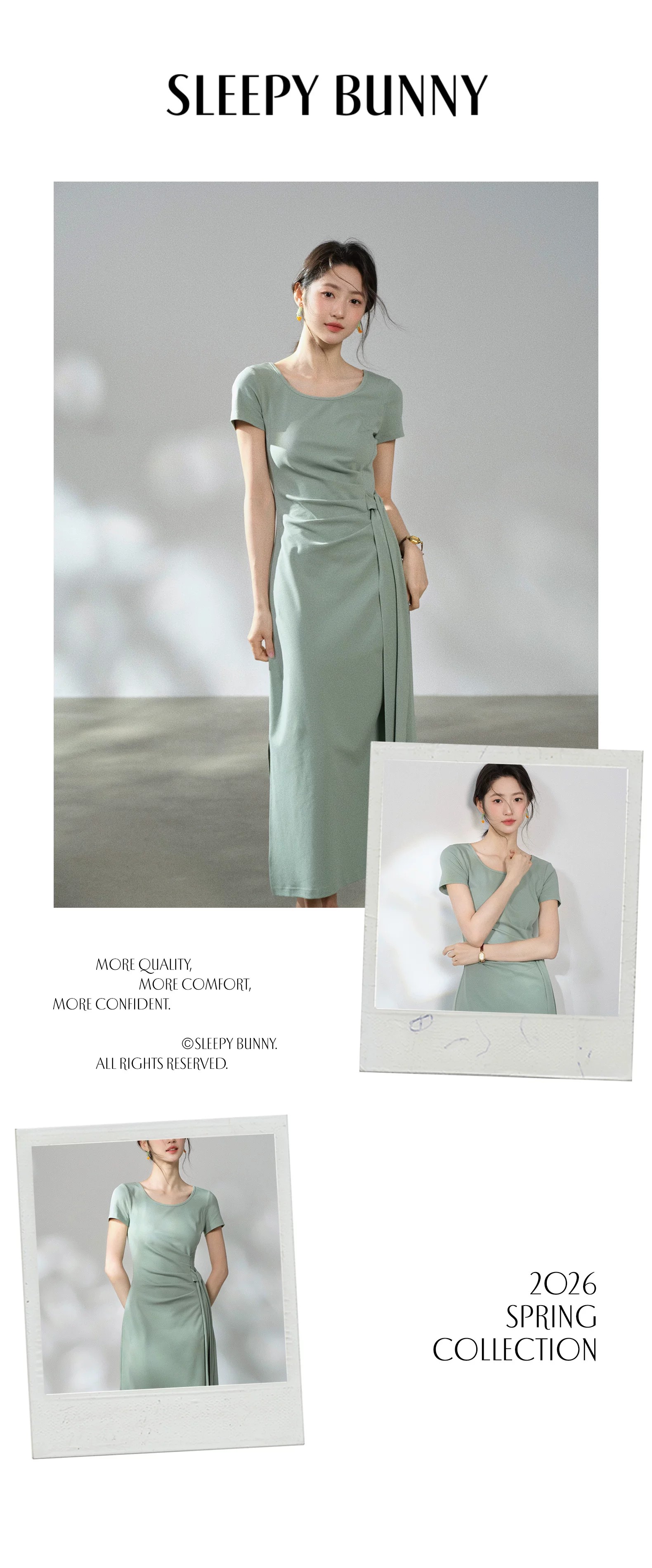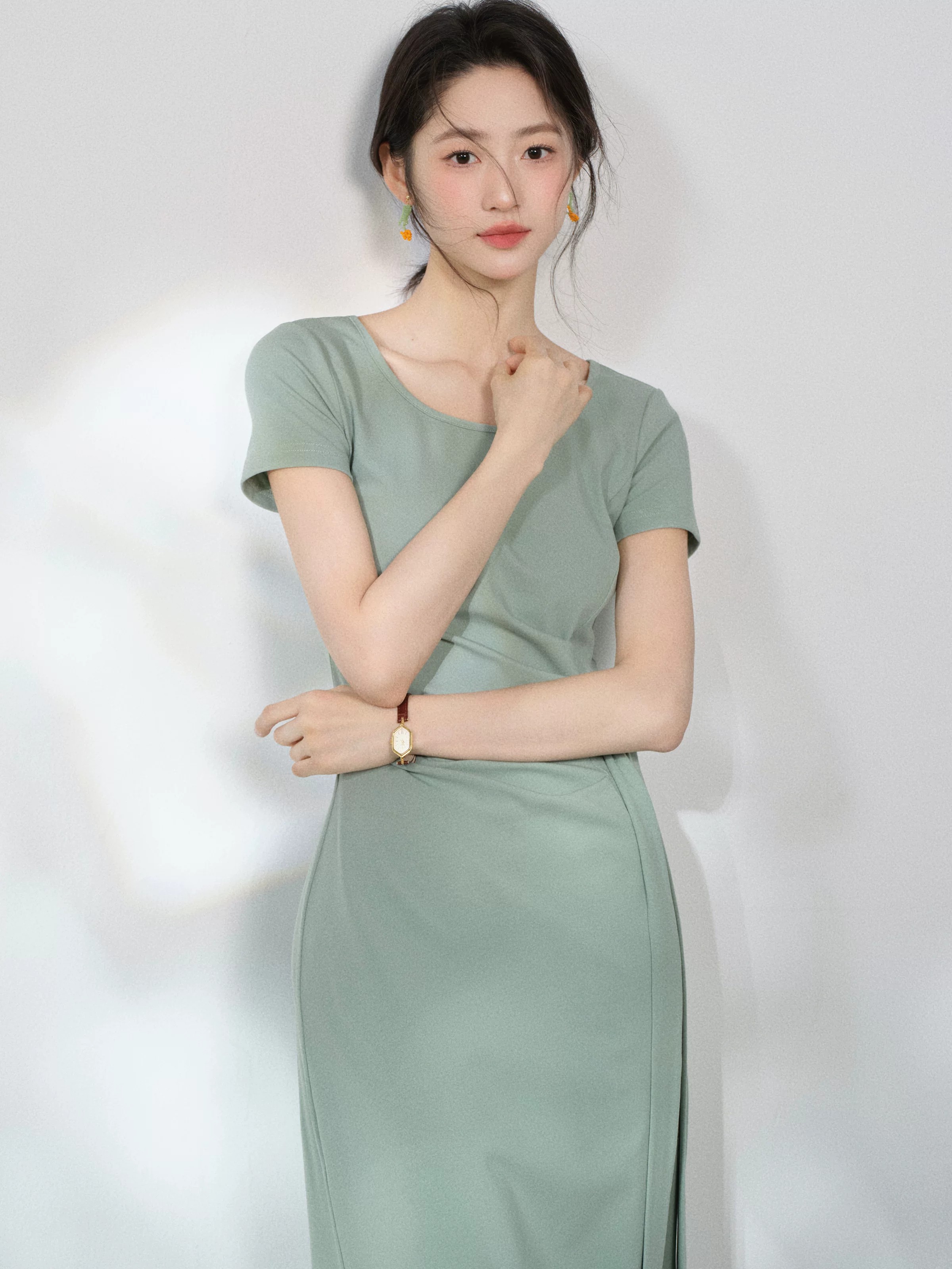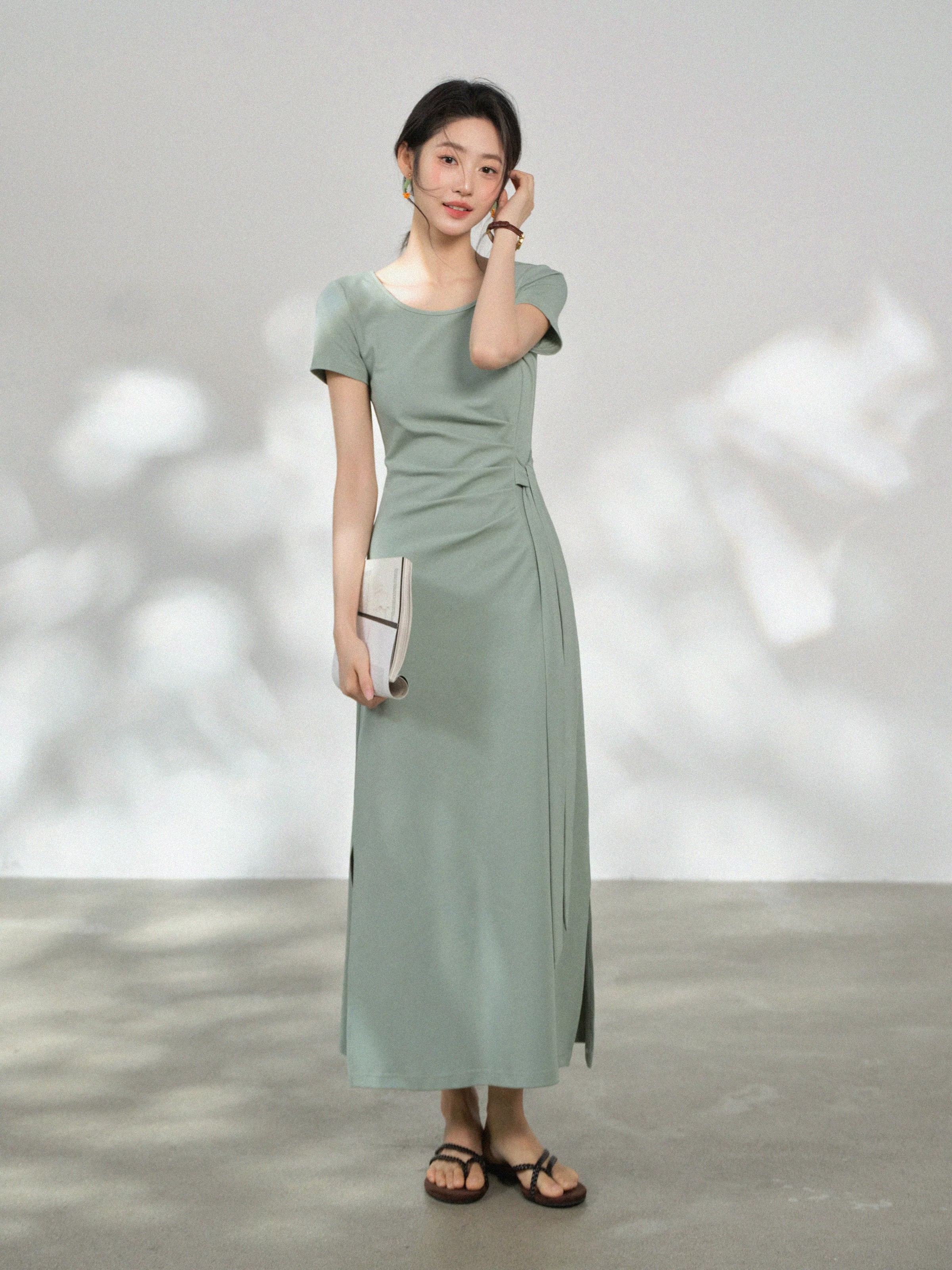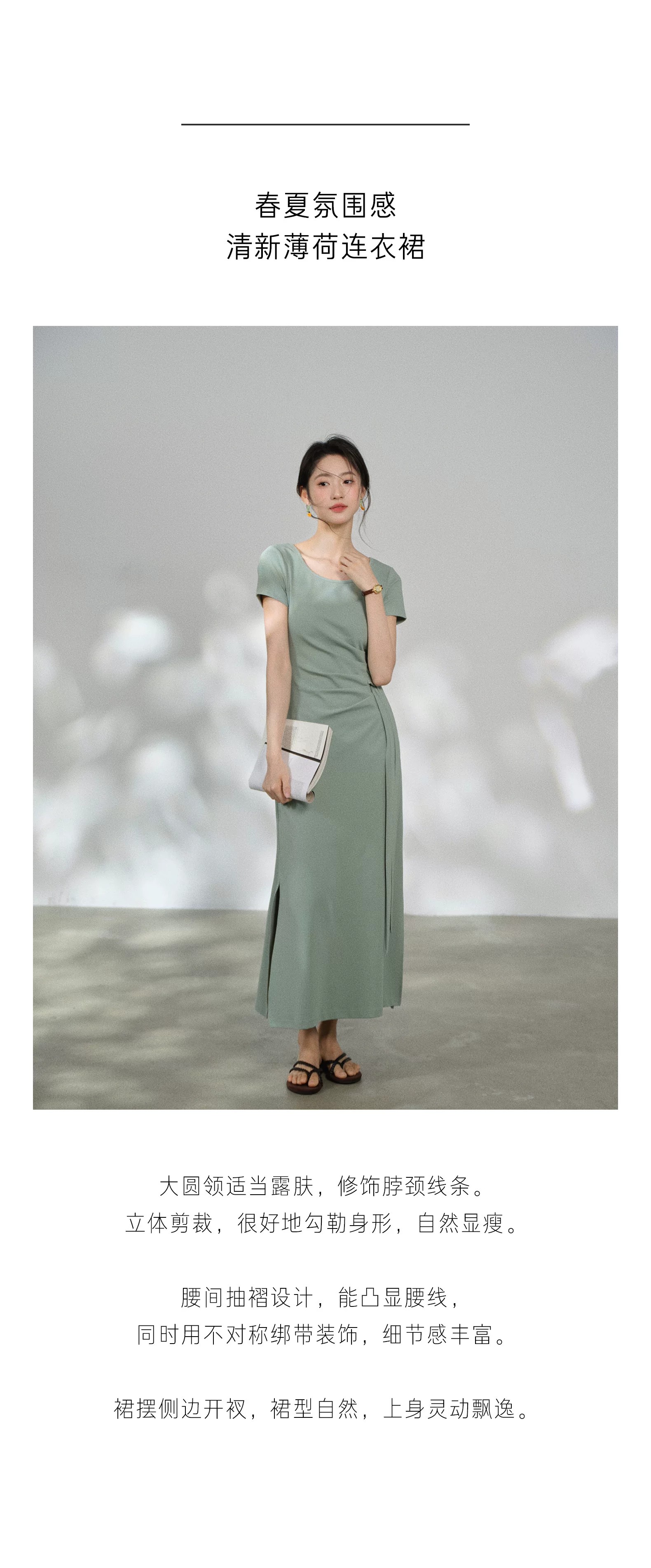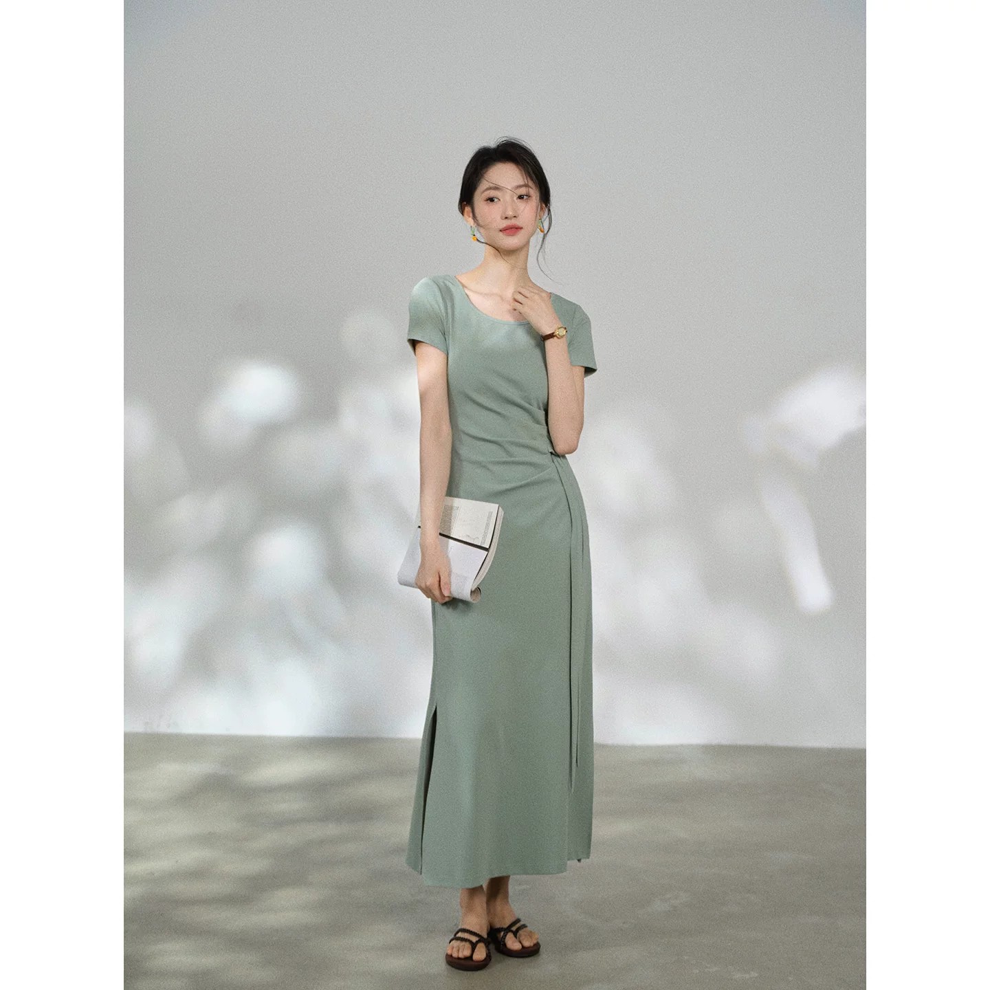 RY4264# 薄荷绿绑带修身显瘦法式开衩短袖连衣裙女圆领小个子