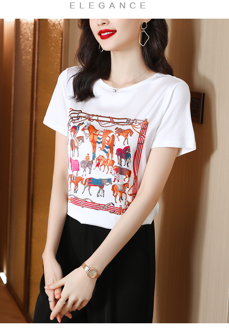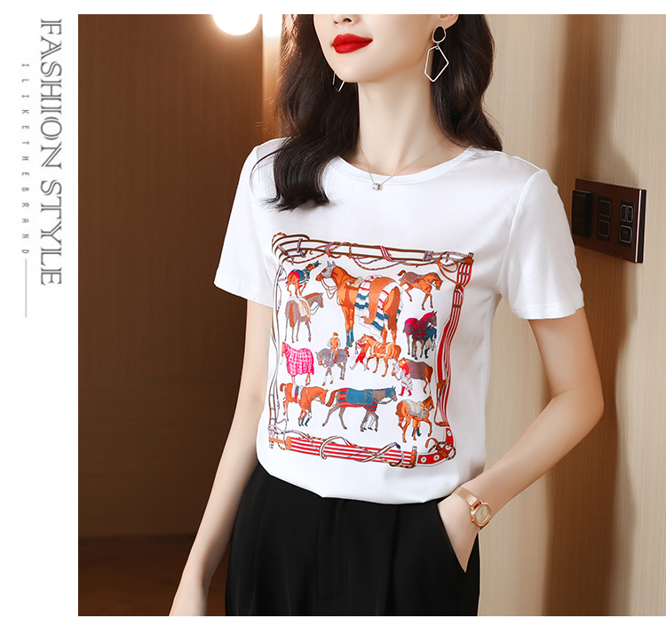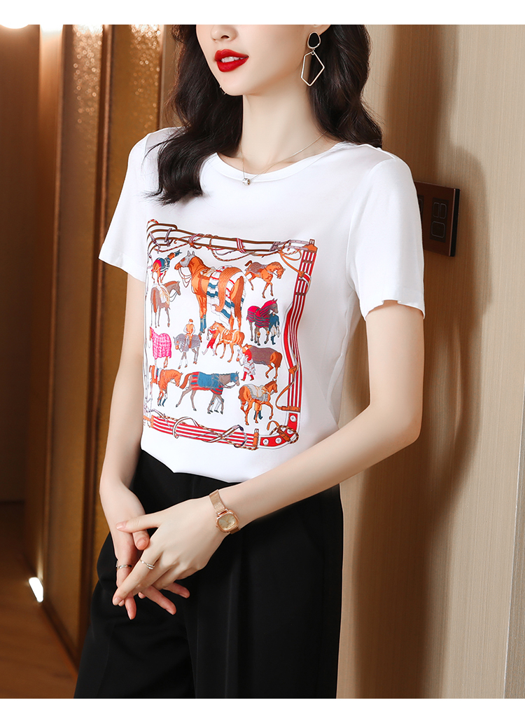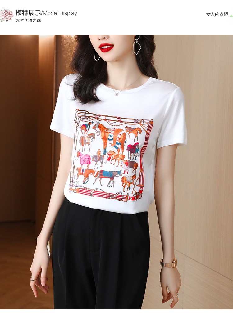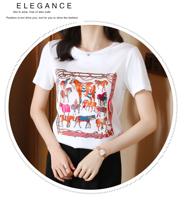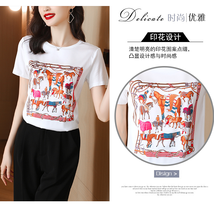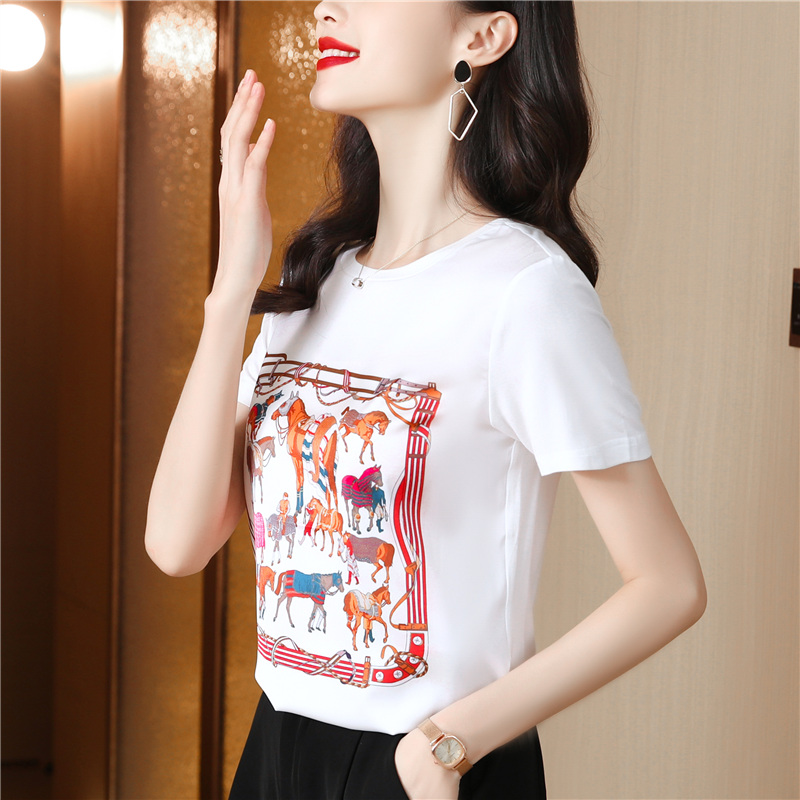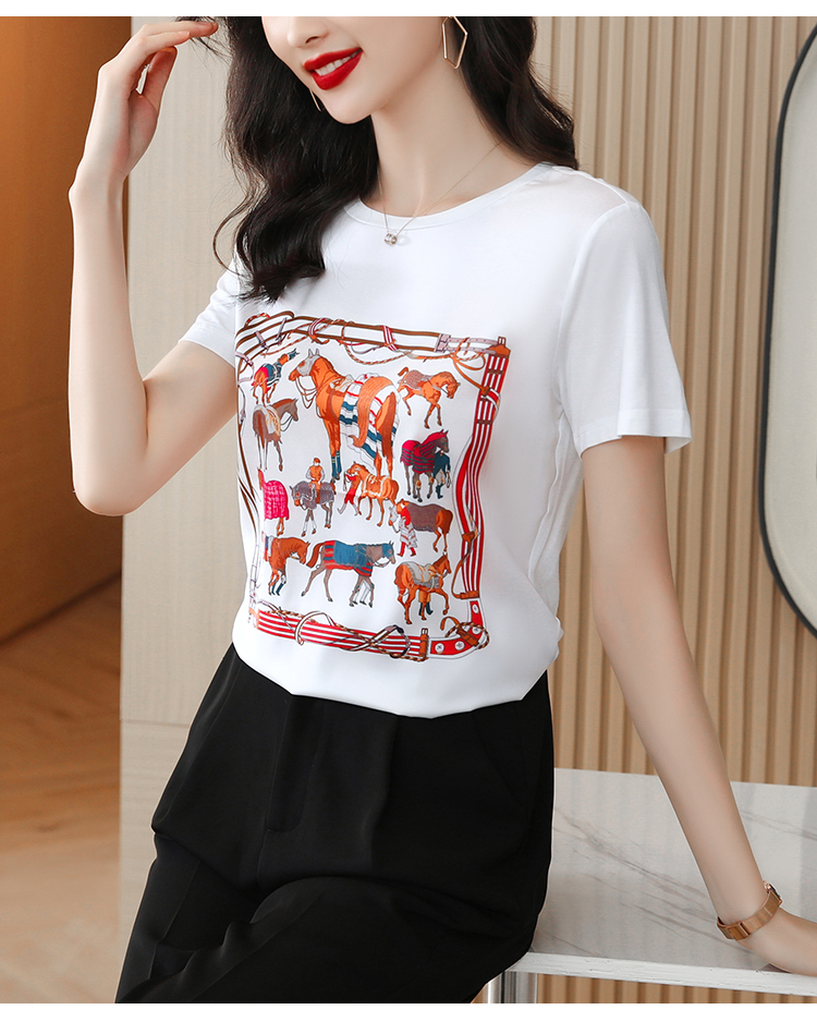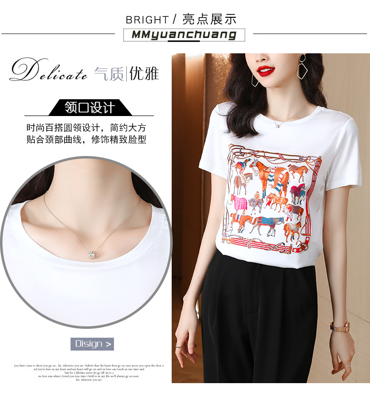 RY4307# K重磅真丝t恤女短袖印花桑蚕丝白色圆领小衫2026夏装半袖短款上衣