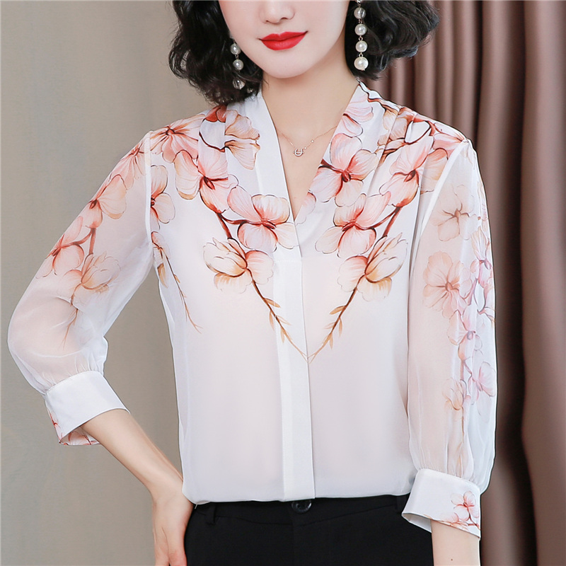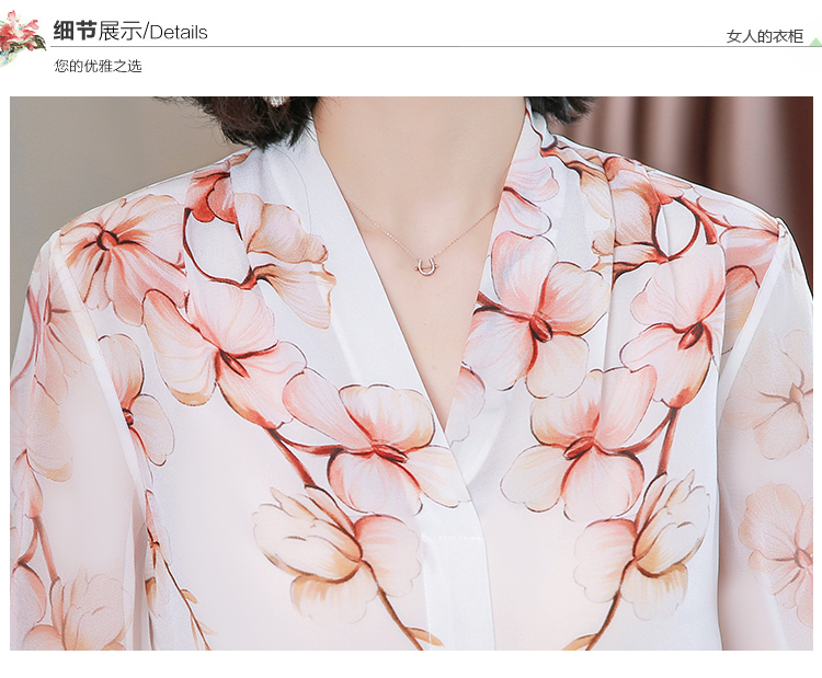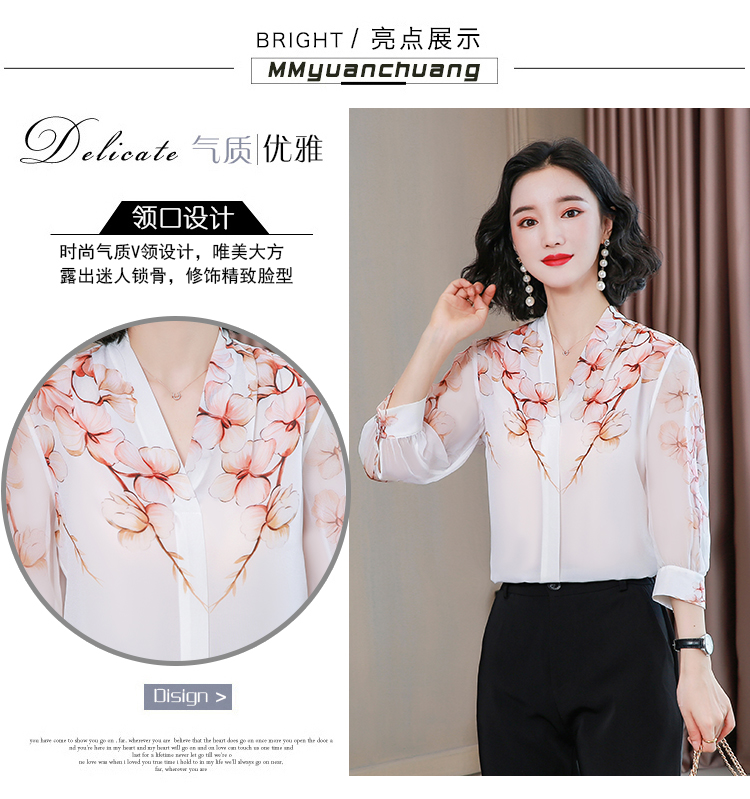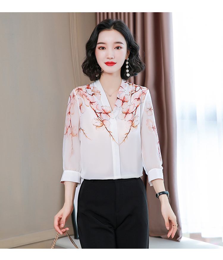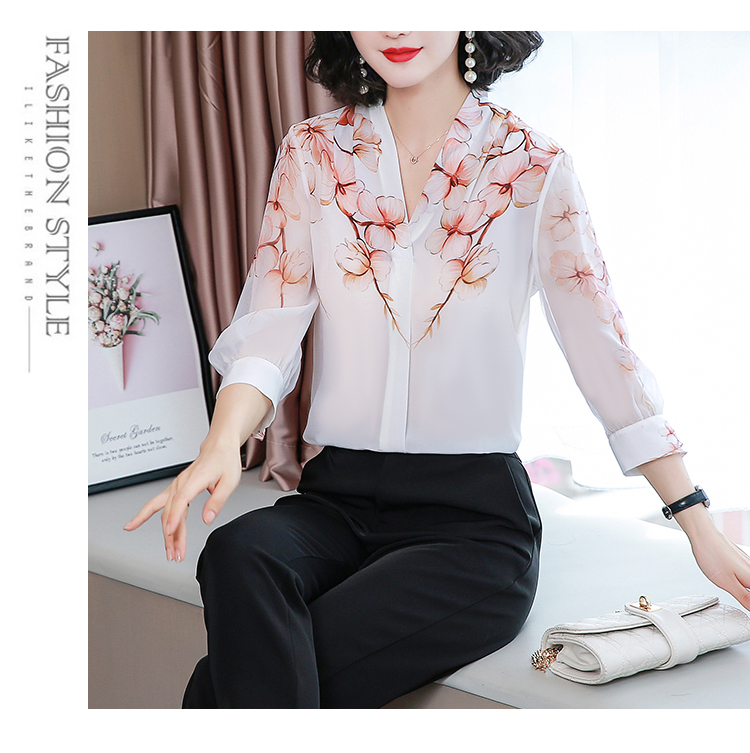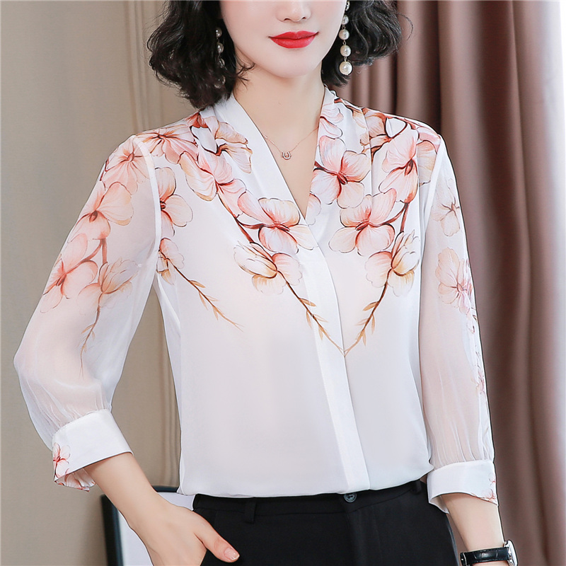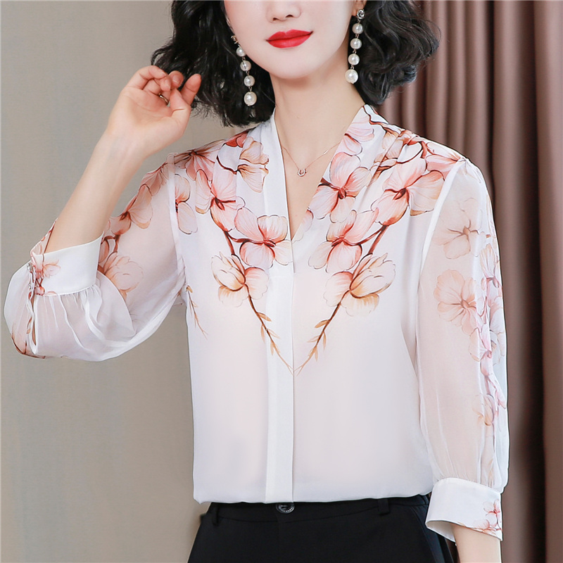 RY4313# 白色短袖真丝衬衫女2026年新款气质v领休闲宽松印花桑蚕丝上衣女