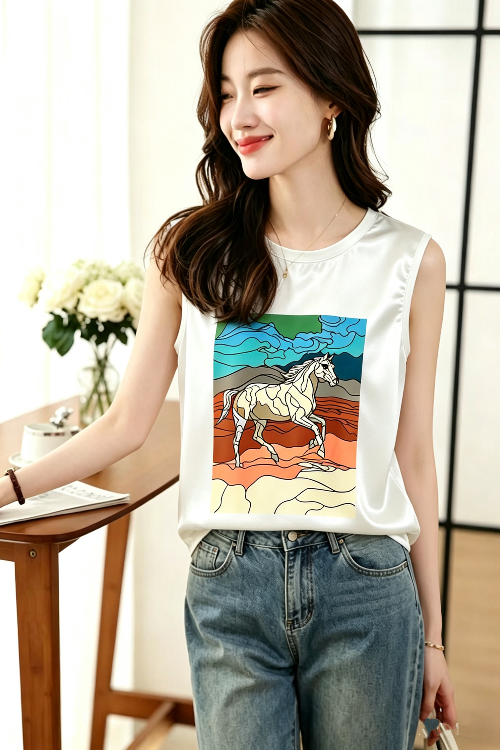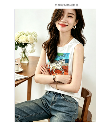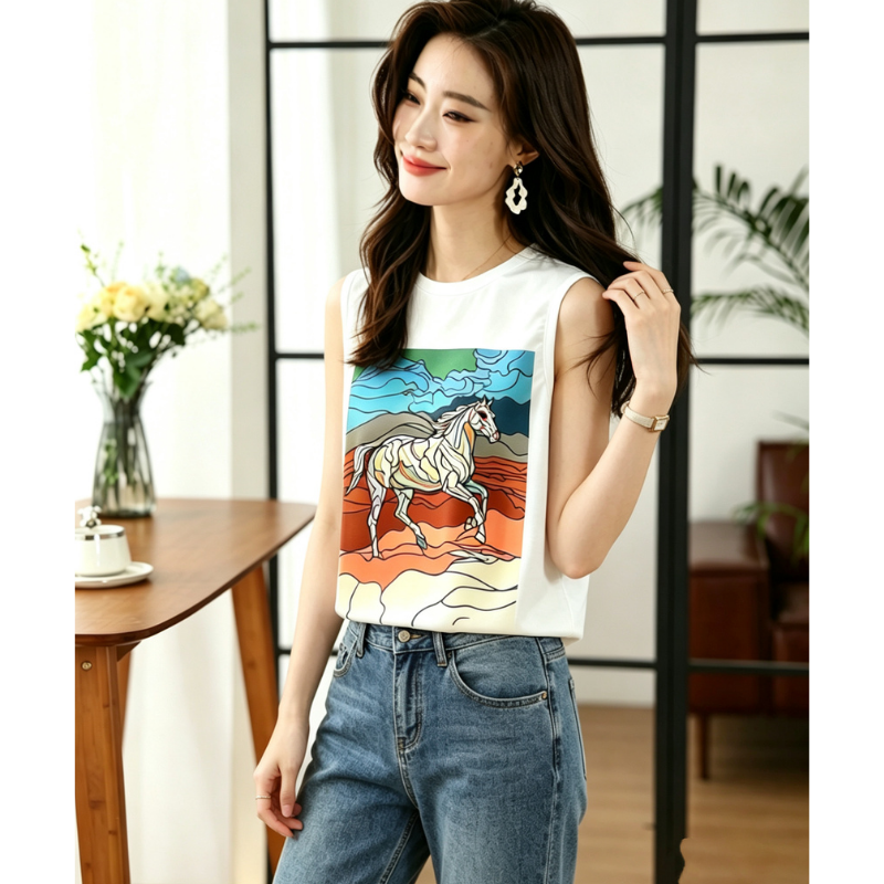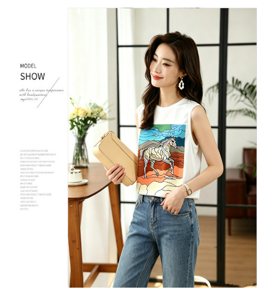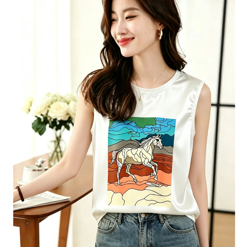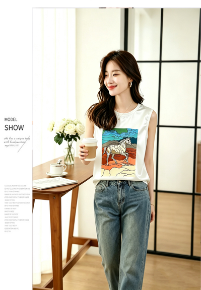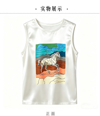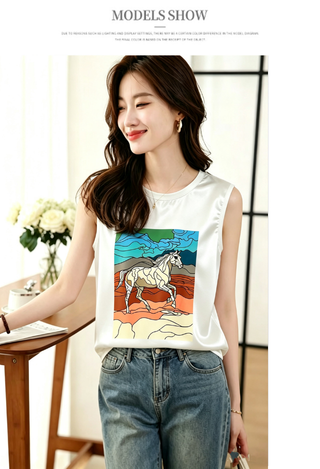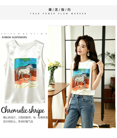 RY4346# 实拍2026新款重磅仿真丝T恤宽松女无袖印花白色圆领百搭背心