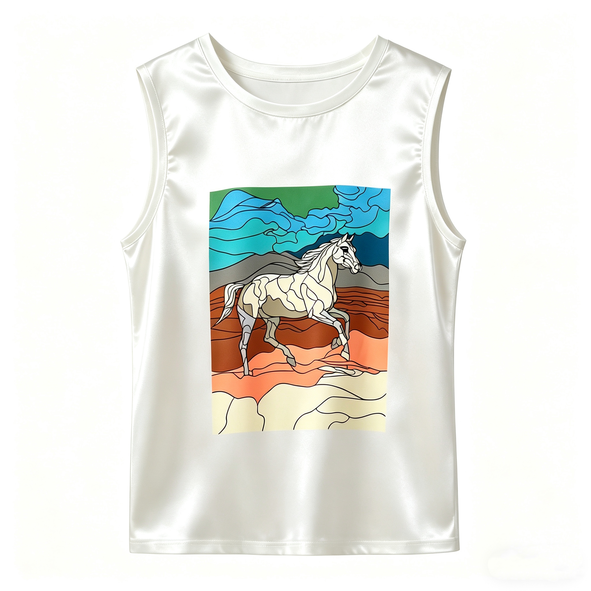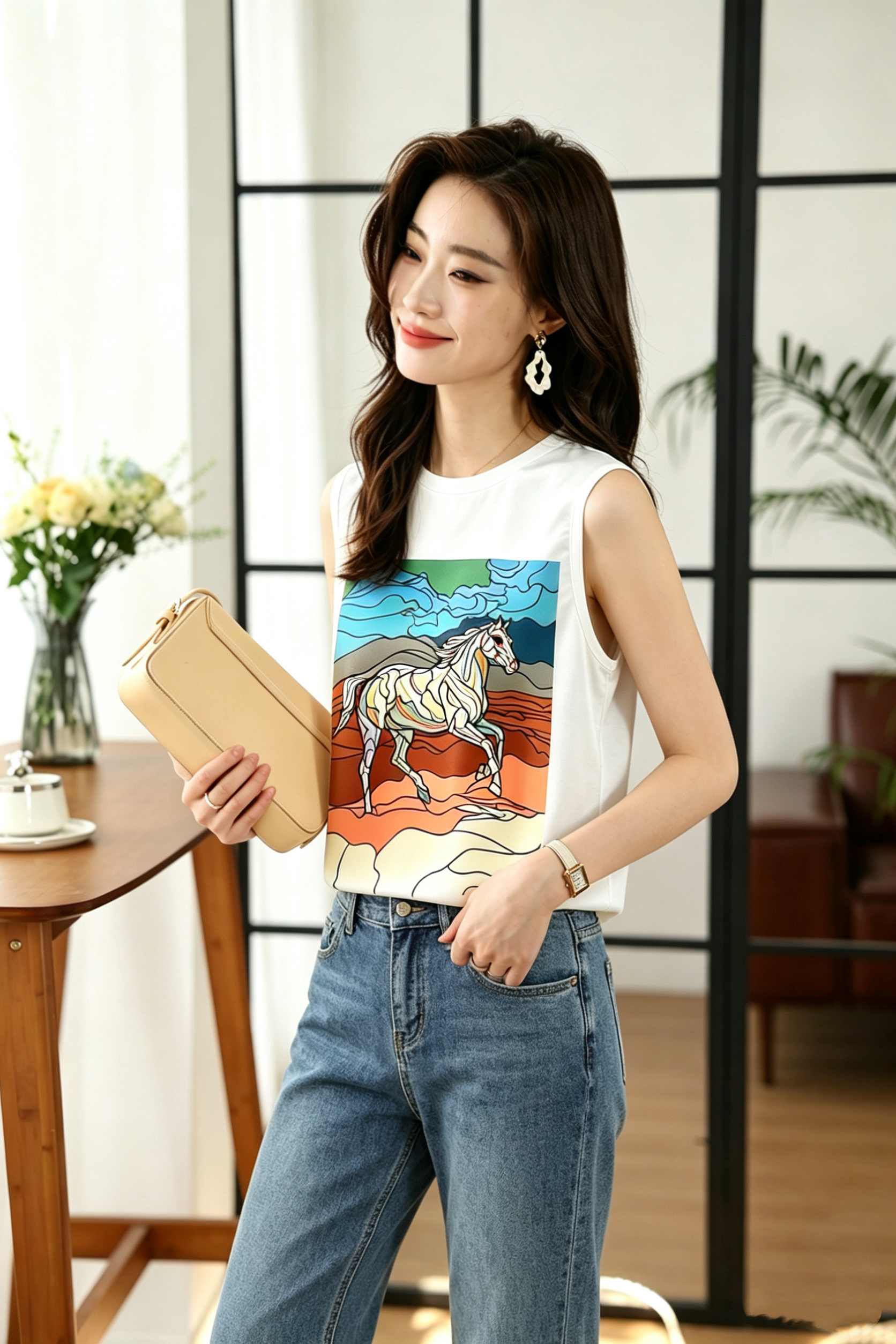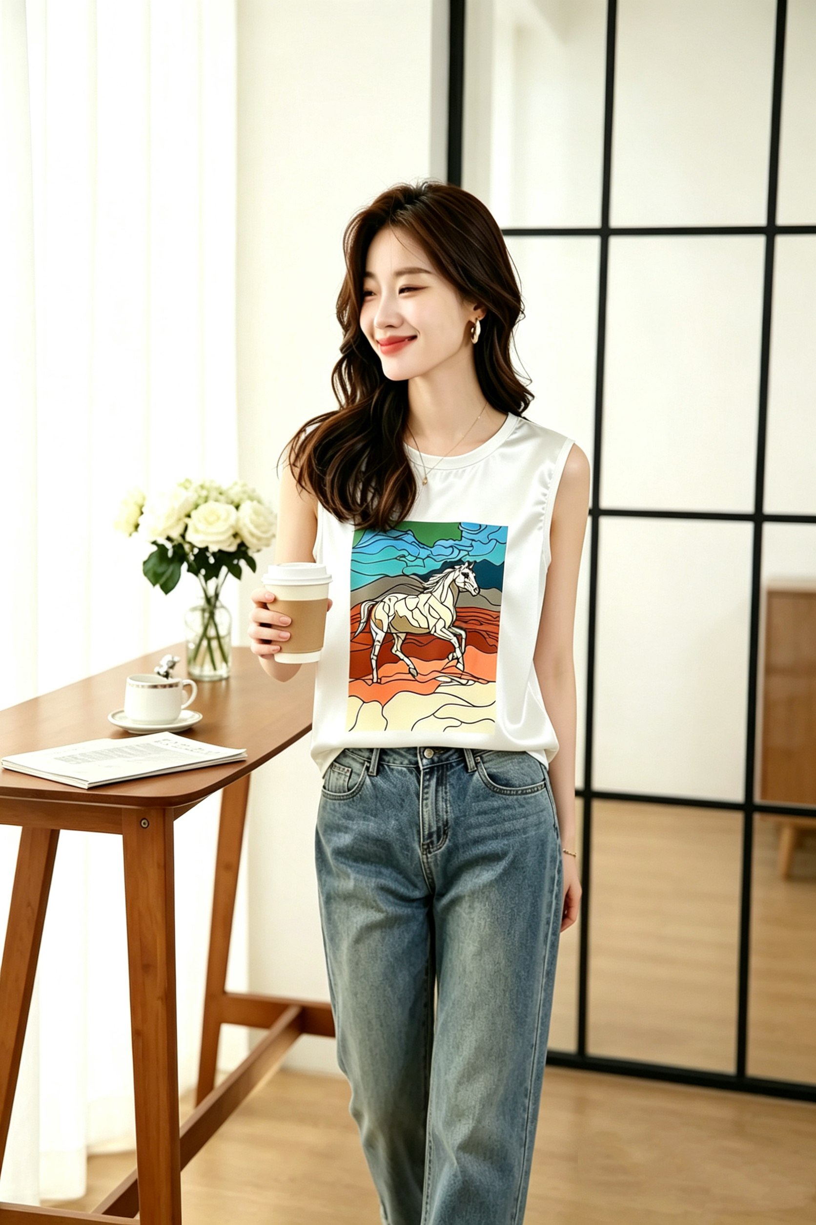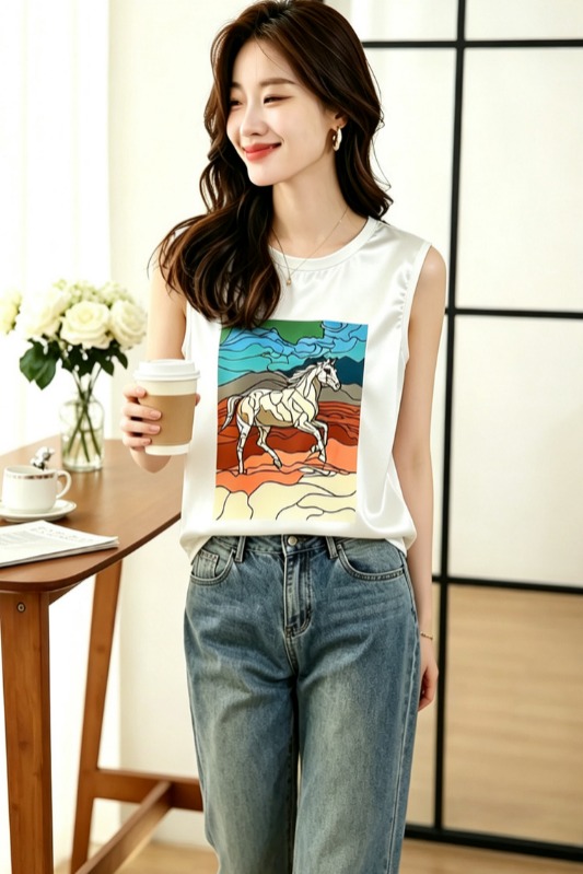 RY4346# 实拍2026新款重磅仿真丝T恤宽松女无袖印花白色圆领百搭背心
