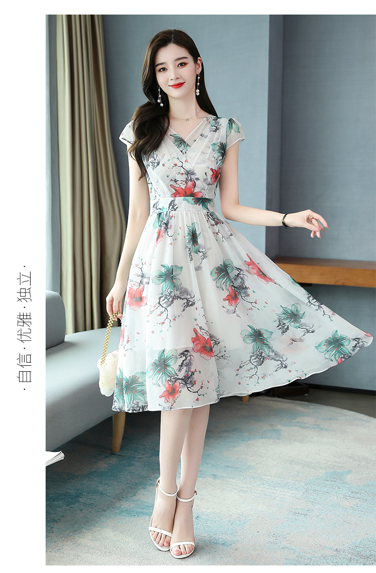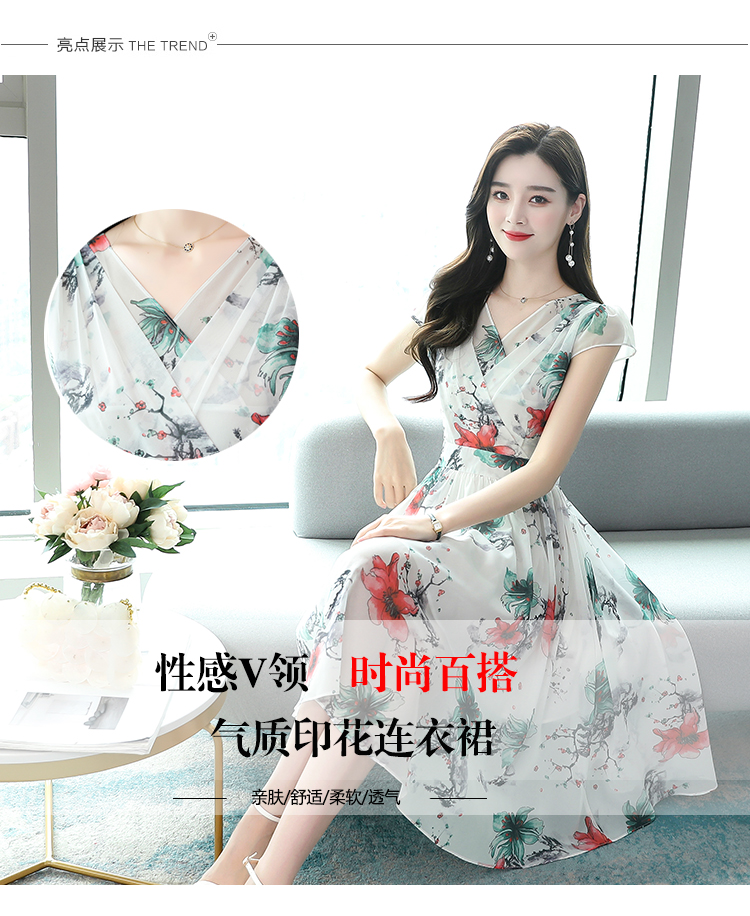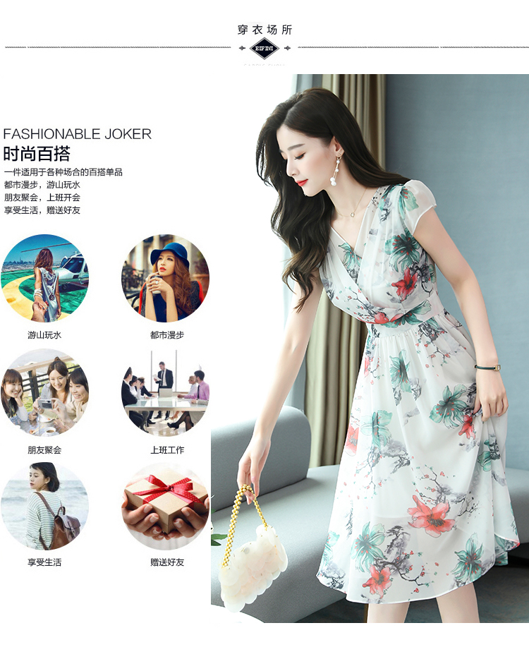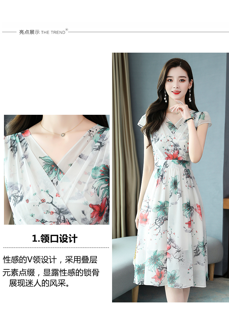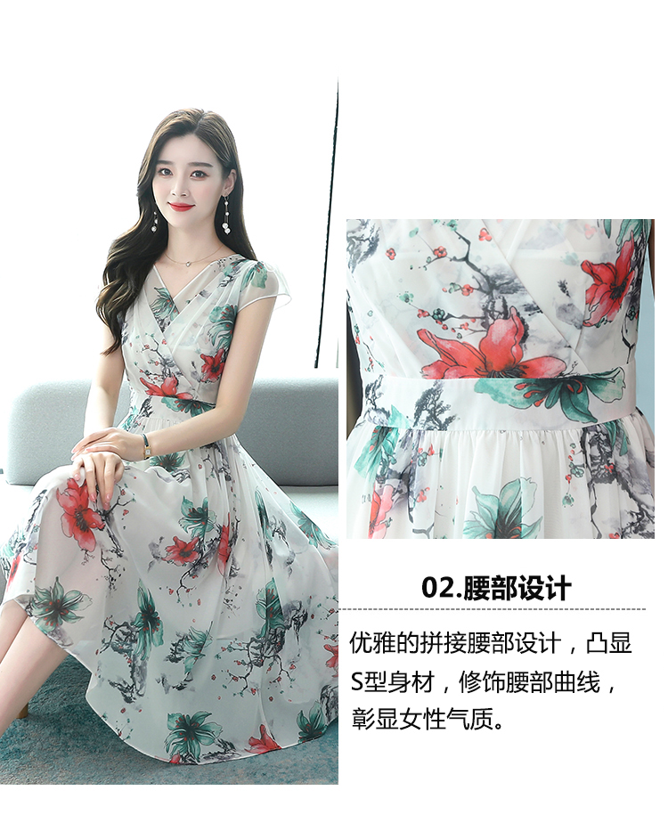 RY2717# 实拍夏季雪纺印花减龄v领花边系带收腰显瘦高档短袖口袋连衣裙