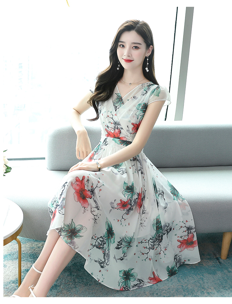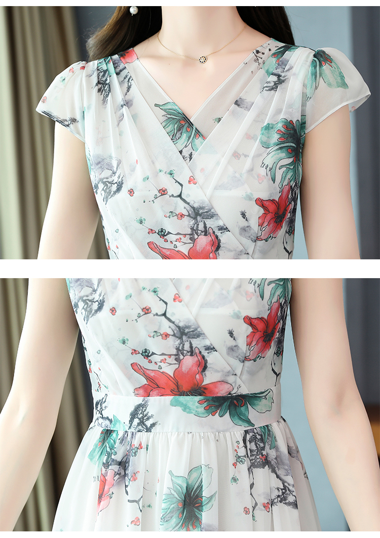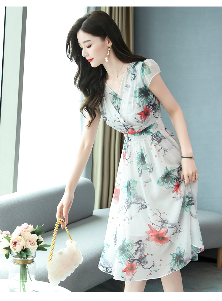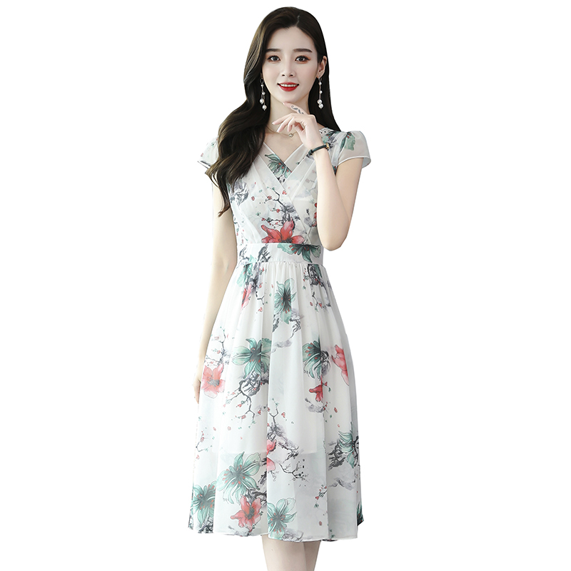 RY2717# 实拍夏季雪纺印花减龄v领花边系带收腰显瘦高档短袖口袋连衣裙