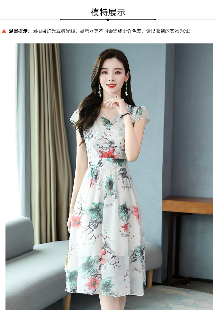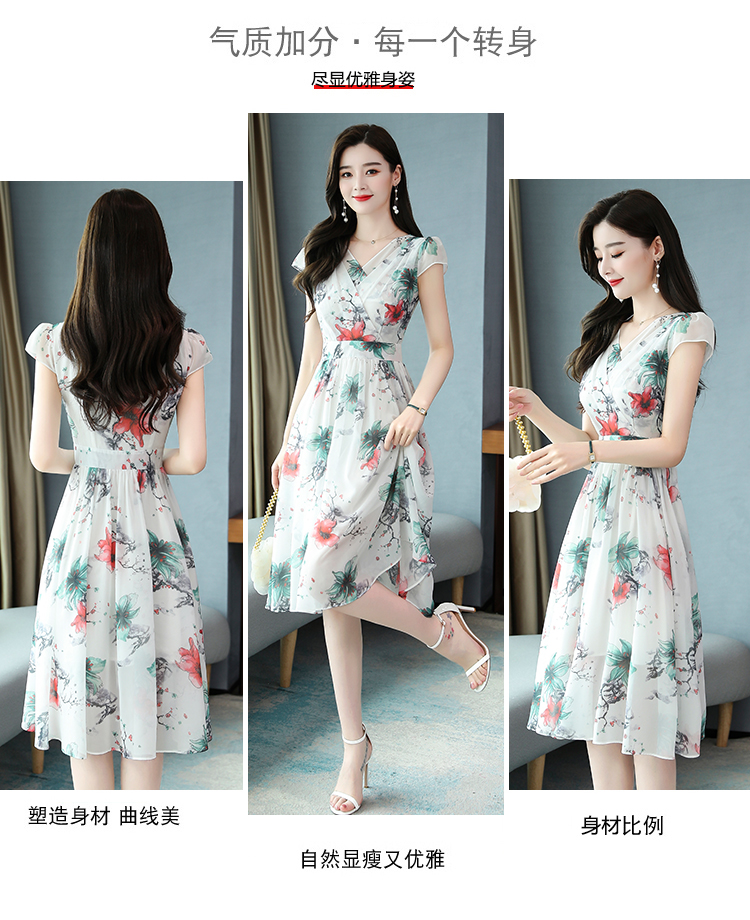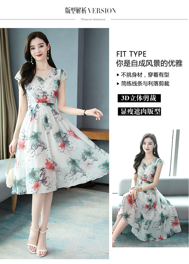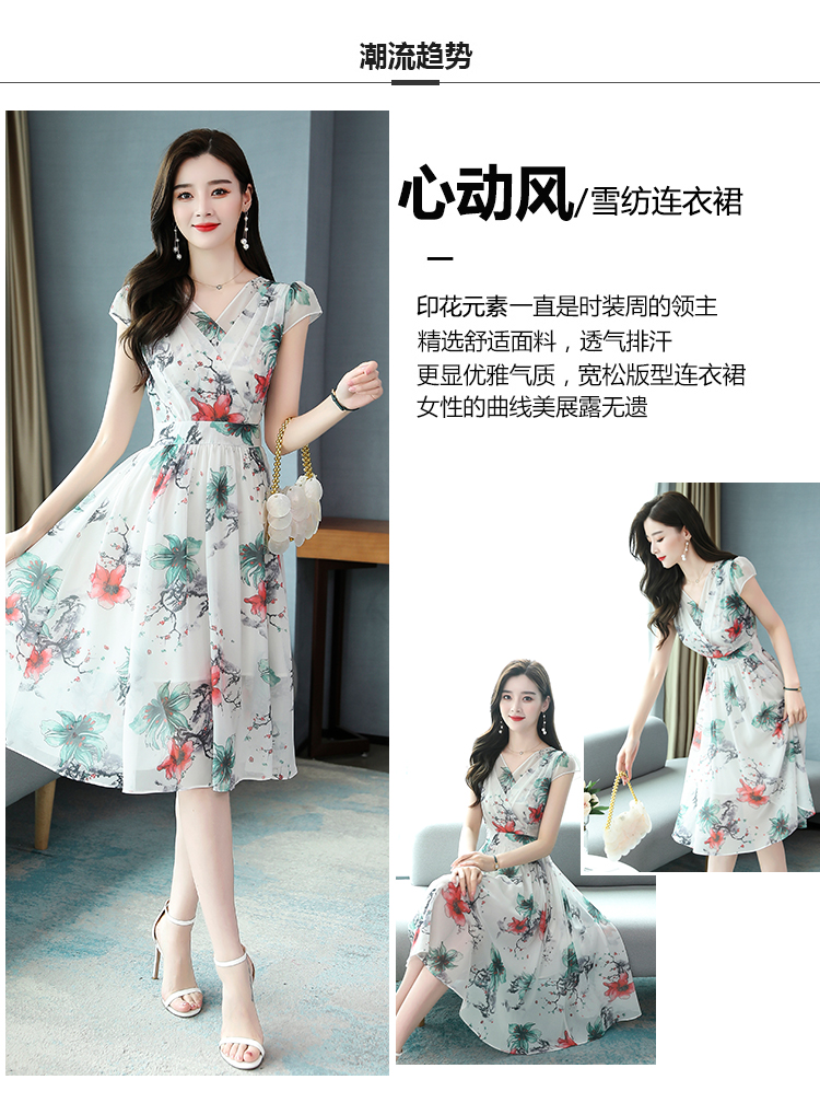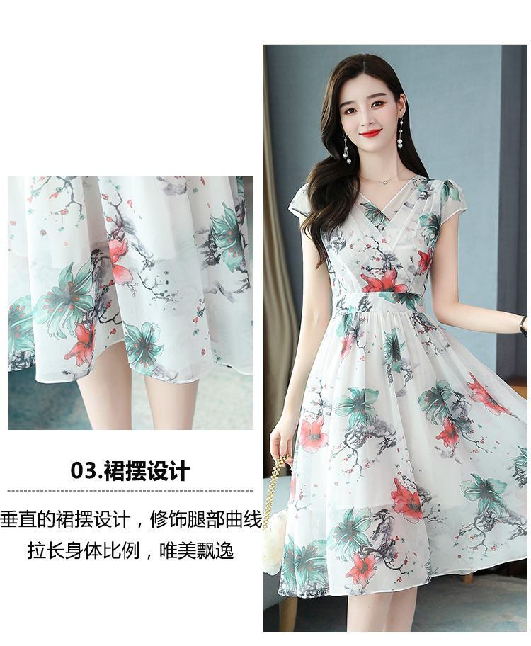 RY2715# 实拍2026夏季新款雪纺印花修身立体工艺短袖大摆连衣裙中长