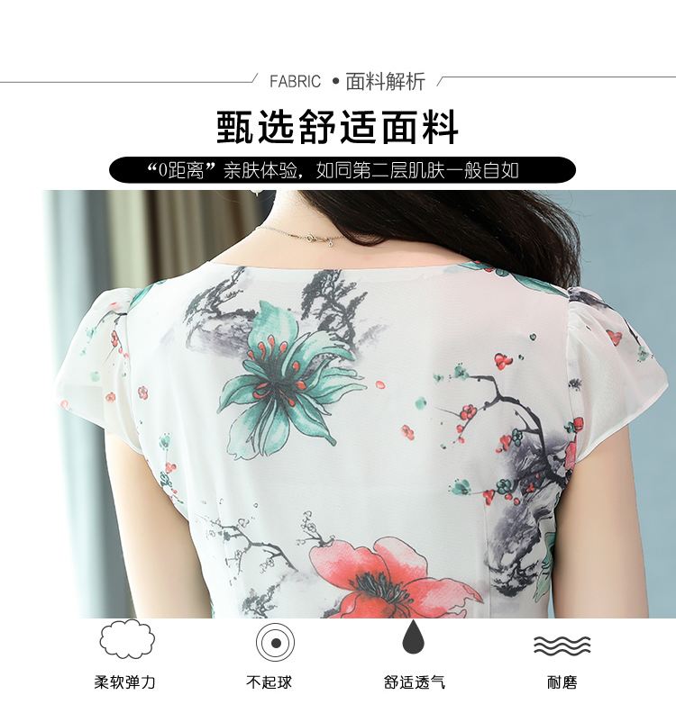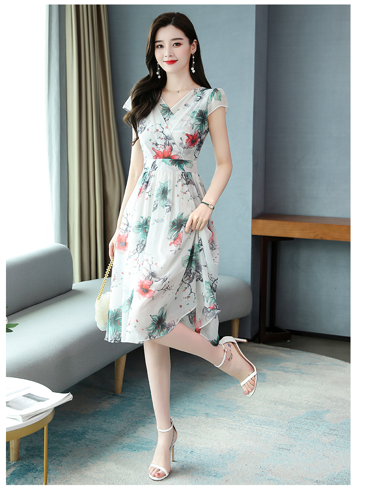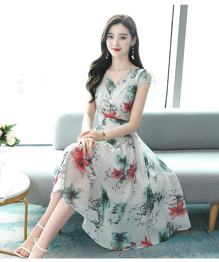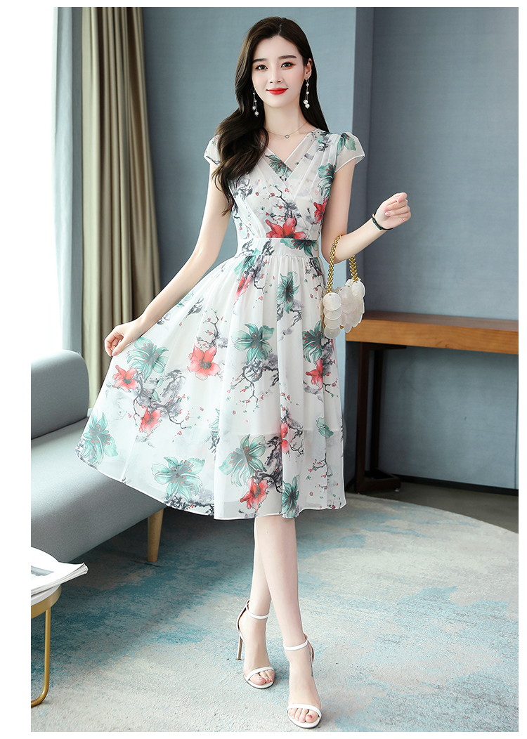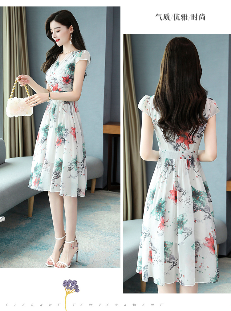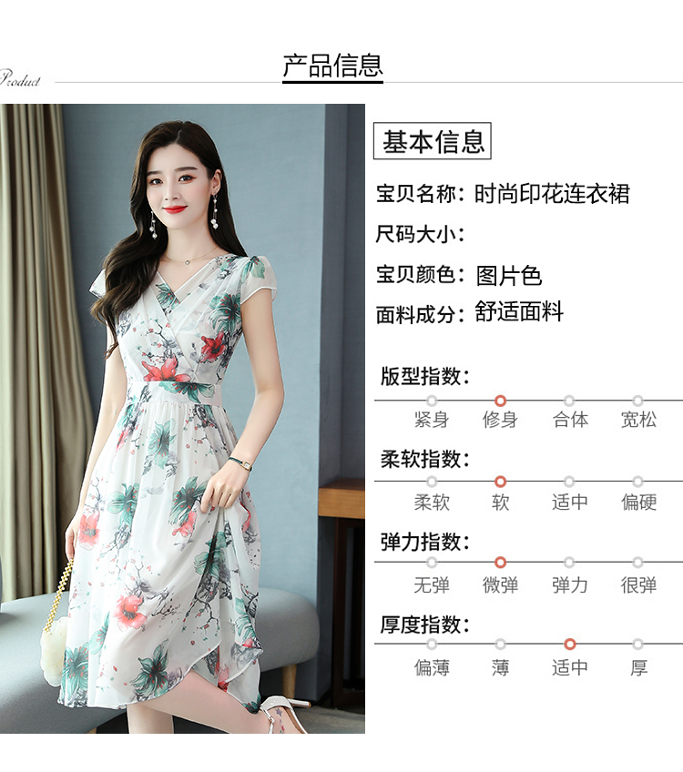 RY2715# 实拍2026夏季新款雪纺印花修身立体工艺短袖大摆连衣裙中长